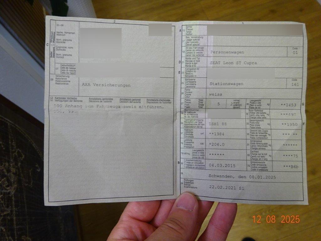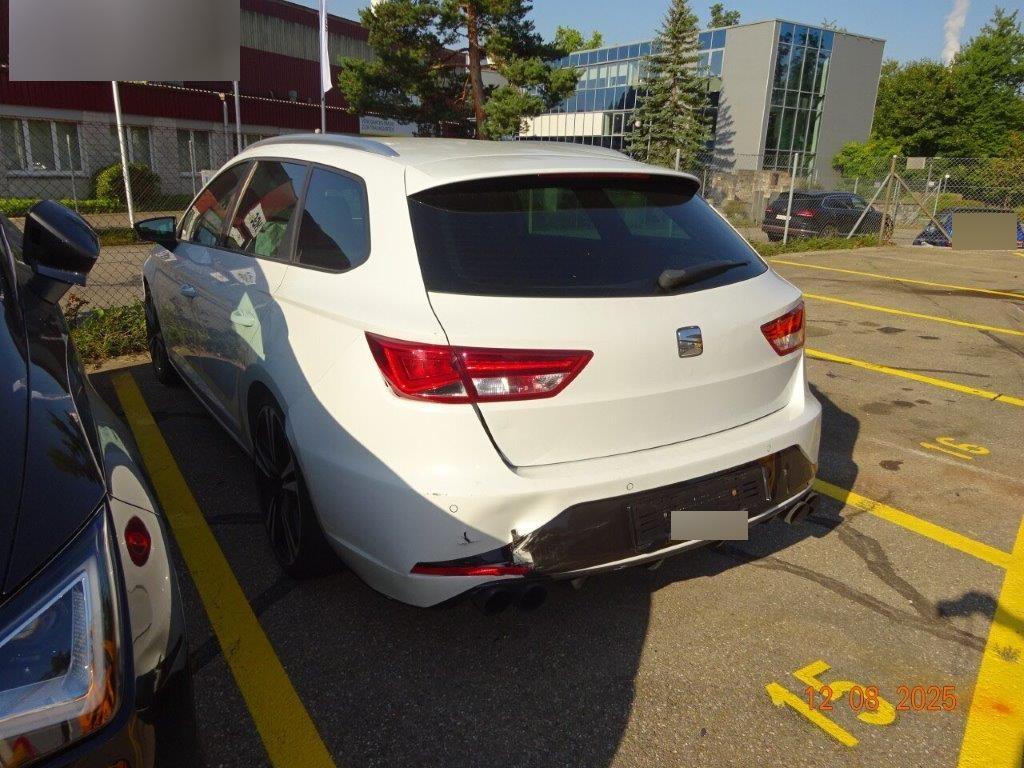 Differenzialsperre, Lackierung: Uni-Lackierung, Airbag: Seitenairbag für Fahrer und Beifahrer, Gurtstraffer mit Gurtkraftbegrenzer vorne, Heckspoiler, Licht: Coming-home-Funktion, Kollisionsschutz-Bremssystem CMBS (Collision Mitigation Brake System), Progressivlenkung, Applikationen schwarz glänzend, Licht: LED-Tagfahrlicht, Multifunktionslenkrad in Leder mit Schaltwippen, Media: Mobiltelefon Freisprecheinrichtung Bluetooth, 12-Volt-Steckdose vorne, Aussenspiegel mit LED Blinker, Wärmeschutzverglasung, Elektronisches Stabilitäts-Programm (ESP) mit Reifendruckkontrolle, Bremsassistent (BAS) und Sperrdifferential, Assist: Berganfahrhilfe (Hill Holder), Einstiegsleisten in Aluminium, Wegfahrsperre elektronisch, Gurtkontrolle, Lenkrad längs- und höhenverstellbar, Sitze: Vordersitze höhenverstellbar, Tankdeckel-Entriegelung von innen, Elektronische Traktionskontrolle (ASR/TCS), Innenleuchten LED, Sitze: Ablagebox unter Fahrer-und Beifahrersitz, Heckscheiben-Wisch-Waschanlage mit Intervall, Räder: Notrad, Airbag: Fahrer und Beifahrer Airbag, Motor Start-/Stop-Anlage, Klima: 2-Zonen-Klimaautomatik, Sitze: Sportsitze vorne, Gurte Höhenverstellbar vorne, Licht: LED Scheinwerfer, Katalysator geregelt, Handschuhfach Beleuchtet, Sitzbezüge in Alcantara, Airbag: Window-Kopfairbags vorne und hinten, Bordcomputer, Assist: Tempomat, Sonnenblende Fahrer und Beifahrerseite mit beleuchtetem Spiegel, ABS, EBD elektronische Bremskraftverteilung, Dachreling in Aluminium, Airbag: Knie-Airbag für Fahrer, Media: Lautsprecher 8, Leuchtweitenregulierung von innen, Pollenfilter (Staubfilter), Aussenspiegel in Hochglanzschwarz, Media: DAB+ (Digital Audio Broadcasting), Licht: LED Heckleuchten, Dachreling, 2 Schlüssel mit Fernbedienung, Türgriffe aussen in Wagenfarbe, USB-Anschluss, 3-Punkt-Sicherheitsgurte auf allen Plätzen, Media: Radio/CD-Player mit MP3, Fahrwerk: Sportfahrwerk, Kopfstützen hinten (3), Steckdose im Kofferraum, Räder: 4 Leichtmetallfelgen 19J mit Pneu, ISOFIX Kindersitzvorrichtung, Innenspiegel automatisch abblendbar, Zentralverriegelung mit Fernbedienung, Aussenspiegel rechts und links beheizt, elektrisch verstell-/ und einklappbar, Airbag: Beifahrerairbag deaktivierbar, Servolenkung, Elektrische Fensterheber vorne und hinten mit Komfortbetätigung und Einklemmschutz, Ladekantenschutz in Chrom, Bremszangen vorne und hinten in Rot, Auspuffanlage mit 2 Endrohren, Getriebe: Sequentielles 6-Gang-Getriebe mit Automatikfunktion Automatikfunktion, 5” Farbdisplay Touchscreen, Teppichfussmatten vorne und hinten, Sportpedalanlage, Licht- und Regensensor, Heckdiffusor, Sitze: Rücksitzlehne geteilt abklappbar 1/3 – 2/3, Fahrwerk: Adaptive Fahrwerksregelung DCC, Media: SEAT Media System Plus, Sitze: Mittelarmlehne vorne, Abgedunkeltes Scheibenglas (ab B-Säule), Schalthebelknauf in Leder