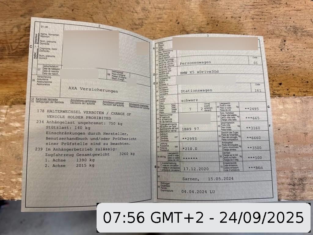 Alarmanlage, Seitenaufprallschutz, Kopfstützen hinten, Integrierte Betriebsanleitung, Assist: Parking Assistant Kamera- und ultraschallbasiertes Assistenzsystem bestehend aus: – Park Distance Control (PDC) – Rückfahrkamera – Active Park Distance Control – Parkassistent – Rückfahrassistent – Einparkhilfe Seite, Auspuffendrohre mit Chromblenden, BMW Garantie: BMW Service Plus – Gewährleistung 3 Jahre oder 100000 km – Gratis Service bis 10 Jahre oder 100000 km, Gurtkontrolle, Dieselpartikelfilter, Airbag: Airbag Fahrer und Beifahrer, Elektronische Wegfahrsperre, Licht: 3. Bremsleuchte, Klima: Klimaautomatik, 2,5-Zonen, Bremsscheiben hinten, innenbelüftet, Parkbremse, elektromechanisch, Persönliche BMW Service Card, Assist: Geschwindigkeitsregelung mit Bremsfunktion, Sitze: Sitzlehnenrückwand mit Klapptasche, BMW Garantie: 12 Jahre Gewährleistung gegen Durchrostung, Airbag: Knie-Airbag für Fahrer und Beifahrer, Multifunktionshaken, Dekor: Interieurleisten Aluminium Mesheffect dunkel, Drehzahlmesser, Media: DAB+ Tuner, Zentralverriegelung mit Fernbedienung, Bremsbelag-Verschleissanzeige, Scheibenwaschdüsen beheizt, Sitze: Rücksitzlehne, umklappbar, 40:20:40-Teilung, Licht: LED Nebelscheinwerfer, Sitze: Sitzheizung für Fahrer und Beifahrer, Räder: Reifendruckanzeige, 3-Punkt-Sicherheitsgurte auf allen Plätzen, Bremsscheiben vorne, innenbelüftet, Personal Profile, Dachreling Aluminium satiniert, Licht: Ambientes Licht, BMW Teleservices, BMW BluePerformance mit AdBlue, Fahrerlebnisschalter, Condition Based Service, Kindersitzbefestigung ISOFIX, Räder: Reifen Pannen Anzeige, Polster: Leatherette, Getränkehalter, BMW Mobiler Service – Hilfe im Pannenfall, Assist: Aufmerksamkeitsassistent, Assist: Speed Limiter, BMW Garantie: 3 Jahre Gewährleistung bezüglich Lack, Media: ConnectedDrive Services – Beinhaltet die kostenlose Nutzung von Fahrzeug Apps über BMW Online (inkl. Zugriff auf Wetterinformationen, Nachrichten, Adresssuche etc.) für 3 Jahre – Registrierung erforderlich für personalisierbare Dienste – Der Dienst BMW Online ist ab 2 Wochen vor Ablaufdatum via BMW ConnectedDrive Store kostenpflichtig verlängerbar, Antiblockiersystem (ABS), Media: BMW Live Cockpit Professional – Anzeigeverbund bestehend aus einem volldigitalem 12,3″ Instrumentendisplay und einem hochauflösendem 12,3″ Control Display – BMW Operating System 7, Navigationsfunktion – Intuitive Bedienmöglichkeiten wahlweise über den BMW Intelligent Personal Assistant – Persönliches Nutzerkonto – Bluetooth/WiFi-Schnittstelle zur kabellosen Verbindung von mobilen Endgeräten – 4G LTE Connectivity: festverbaute SIM-Karte mit 4G Netz – Umfang vernetzte Dienste, 48 V Rekuperationssystem (Mild-Hybrid-Technologie), Regensensor und automatische Fahrlichtsteuerung, Getriebe: Steptronic Getriebe, 8-Gang, Servotronic, Räder: 18″ Leichtmetallräder V-Speiche 618 Reflexsilber 7 J×18/Bereifung 225/60 R 18, Lenksäulenverstellung, Licht: LED Scheinwerfer, iDrive Controller, Warndreieck, Airbag: Airbag Beifahrer deaktivierbar, Fahrwerk: xDrive (M xDrive für X5 M), Intelligenter Notruf, Räder: Radschraubensicherung, Elektronisches Stabilitäts-Programm (ESP), Lackierung: Uni-Lackierung, Licht: Heckleuchten in LED-Technik, Licht: Dynamische Bremsleuchten, Wärme-/Sonnenschutzverglasung, Licht: Heimleuchten, Assist: Park Distance Control vorne und hinten, Assist: Passiver Fussgängerschutz, Airbag: Seitenairbag für Fahrer und Beifahrer, Airbag: Kopfairbag 1. und 2. Sitzreihe, Sitze: Sportsitze für Fahrer und Beifahrer, Licht: Nebelschlussleuchte, Sitze: Sitzverstellung, elektrisch mit Memory, Brake Energy Regeneration, Lenkrad: Sport-Lederlenkrad, Erweitertes Aussenspiegelpaket