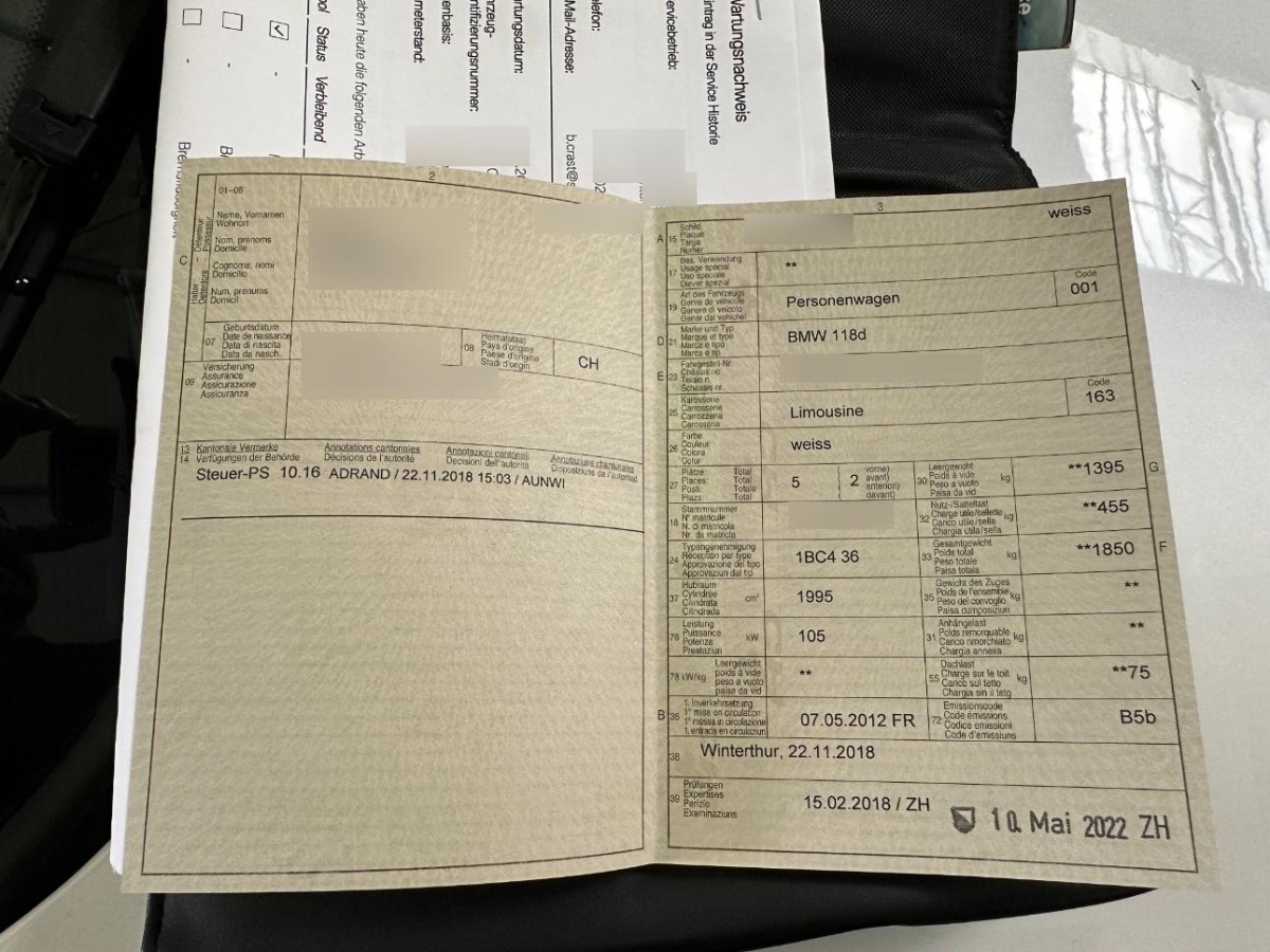 Make up-Spiegel rechts, Kopfstützen hinten, Innenraumbeleuchtung, Airbag: Airbag Fahrer und Beifahrer, Drittes Bremslicht, Schliessystem mit Zentralverriegelung, Auspuffblende, verchromt, Radiovorbereitung, Antenne, Entstörung und 6 LS, Durchladeklappe, Check-Control-System, Assist: Cornering Brake Control (CBC), Bremsenergie-Rückgewinnung, 12-Volt-Steckdose vorne, Kopfstützen hinten abklappbar, Verbandskasten, Cupholder, Dynamische Bremsleuchten, Stossstangen und Aussenspiegel in Wagenfarbe, ISOFIX Kindersitzvorrichtung, Rücksitzlehne geteilt abklappbar, Aussenspiegel rechts und links beheizt und elektrisch verstellbar, asphärisch gewölbtes Spiegelglas, Fahrersitz höhenverstellbar, Veloursfussmatten vorne und hinten, BMW Mobility System, Klima: Klimaanlage, Bremsbelag-Verschleissanzeige, Licht: Nebelschlussleuchte, Radio BMW Business CD, Nichtraucherausführung, Aux-In Anschluss, Seitenairbags, Befestigungsösen im Laderaum, Gurtstraffer vorne, Elektrische Lenkung (EPS), Dynamische Stabilitätskontrolle (DSC), Leuchtweitenregulierung von innen, Türgriffe in Wagenfarbe, Partikelfilter und Oxydationskatalysator, Wegfahrsperre elektronisch, Lenkrad: Lenkrad längs- und höhenverstellbar, Elektronische Differentialsperre, Automatische Stabilitäts- und Traktions- kontrolle, Reifendruckverlust-Warnsystem, Blinker in Aussenspiegel, 3-Punkt-Sicherheitsgurte auf allen Plätzen, Make up-Spiegel links, Antiblockiersystem (ABS), Bremsassistent (BAS), Bordcomputer, Assist: Crash-Sensor, Dachzierleiste in Wagenfarbe, Wärmeschutzverglasung, Window-Kopfairbags, Sitze: Beifahrersitz höhenverstellbar, Elektrische Fensterheber vorne + hinten, Anfahrassistent, Schlüsselloser Motorstart, Motor Start-/Stop-Anlage, Dekor: Interieurleisten in Satinsilber matt, Einstiegsschienen, Gangempfehlung, Getriebe: 6-Gang-Getriebe, Radzierblenden, Stahlräder, Stoff-/Move-Ausstattung