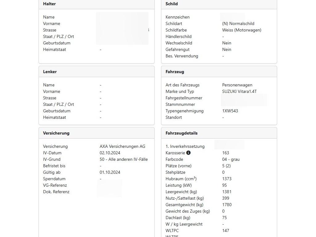Licht: Lichtautomatik, Steckdose 12V, Licht: Leuchtweitenregulierung automatisch, Keyless Start (schlüsselloses Einsteigen und Starten), Räder: Reifendruck-Kontrollanzeige, Start-/Stopp-Automatik, Elektronisches Stabilitäts- und Traktionskontrolle (ESP / TCS), Katalysator geregelt, Lenkrad: Lenkrad längs- und höhenverstellbar, Airbag: Kopfairbags vorne und hinten, Licht: Nebelscheinwerfer, Mittelarmlehne vorne, Garantie: Suzuki 3 Jahre Werks- und Mobilitätsgarantie (max. 100000 km) – sowie weitere 2 Jahre Zusatzgarantie inkl. Assistance als Option, Wegfahrsperre elektronisch, Assist: Aktiver Spurhalteassistent, Assist: Spurleitassistent, Sicherheitsgurte vorne höhenverstellbar, 3-Punkt-Sicherheitsgurte auf allen Plätzen, Aussenspiegel rechts und links beheizt, elektrisch verstell- / und einklappbar, Media: Touchscreen-Multimediasystem mit Smartphone-Anbindung, Bluetooth und DAB+ und Navigation, Assist: Spurwechselassistent, Assist: Berganfahrhilfe, Licht: LED Abblend-und Fernlicht, Assist: Rückfahrkamera, Zentralverriegelung mit Fernbedienung, Räder: Leichtmetallfelgen 17J 215/55 R17, Kopfstützen vorne höhenverstellbar, Airbag: Knie-Airbag für Fahrer, Kopfstützen hinten höhenverstellbar, Licht: Drittes Bremslicht, Media: USB-Anschluss für externe Audioquellen, Assist: Bremsassistent (BAS), Sitze: Rücksitzlehne separat umklappbar (60/40), Servolenkung, ISOFIX Kindersitzvorrichtung, Lenkrad: Lederlenkrad, Airbag: Seitenairbag für Fahrer und Beifahrer, ABS, EBD elektronische Bremskraftverteilung, Lenkrad: Bedientasten am Lenkrad für Audio und Telefon, Allradantrieb permanent, Polster: Veloursledersitze, Dachreling, Media: 6 Lautsprecher, Diverse Ablagefächer und Getränkehalter, Assist: Verkehrszeichenerkennung, Airbag: Airbag Fahrer und Beifahrer, Sitze: Vordersitze höhenverstellbar, Privacy Glass, Assist: Notbremssystem mit Kollisionswarner, Assist: Adaptiver Tempomat, Airbag: Airbag Beifahrer deaktivierbar, Bodenteppiche, Elektrische Fensterheber vorne + hinten, Media: Navigations-Funktions-Aktivierung, Klima: Klimaautomatik mit Pollenfilter, Assist: Berganfahrhilfe (DAC), Assist: Abstandskontrolle für vorne und hinten, akustisch, Assist: Kreuzungsassistent hinten, Radlaufverkleidungen, Getriebe: 6-Gang-Automatikgetriebe, Nebelschlussleuchte, Multifunktionsanzeige, Beleuchtung: LED-Rückleuchten, Außenspiegel und Türgriffe in Wagenfarbe, Sitze: Umklappbare Vordersitze, Sitze: Beheizbare Vordersitze, Gurtstraffer und Gurtkraftbegrenzer an allen Sitzen, Elektrisches Panorama-Schiebedach