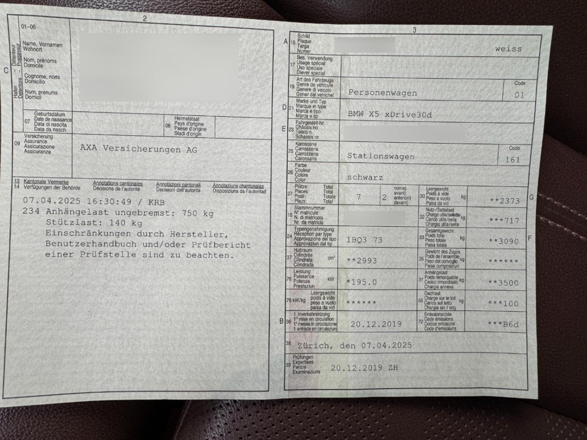 Aussenspiegelpaket, Warndreieck, Airbag: Knie-Airbag für Fahrer und Beifahrer, Dynamische Bremsleuchten, Innenraumbeleuchtung, Antiblockiersystem (ABS), DAB+ (Digital Audio Broadcasting), Vordersitze elektrisch verstellbar, Fahrersitz mit Memory-Funktion, Diebstahlwarnanlage, Window-Kopfairbags, Media: Concierge Service, Assist: Tempomat mit Bremsfunktion, ISOFIX Kindersitzvorrichtung, Parkbremse, elektromechanisch, Assist: ATTENTION ASSIST (Aufmerksamkeits-assistent), Vorbereitung Apple CarPlay, Beide Make up-Spiegel beleuchtet, Parkassistent vorne und hinten inkl. Rückfahrkamera, TeleService, Einstiegsschienen, Pollenfilter (Staubfilter), Bremsenergie-Rückgewinnung, Steckdose 12V, Vordersitze heizbar, Multifunktions-Sportlenkrad in Leder, Schliessystem mit Zentralverriegelung, Airbag: Airbag Fahrer und Beifahrer, Regensensor für Scheibenwischer vorne, Scheibenwaschdüsen beheizt, Connected Package Professional, Sitze: Sportsitze vorne, Wärmeschutzverglasung, Lackierung: Uni-Lackierung, Mittelarmlehne hinten, Auto Start-/Stop-Anlage, Reifenkontrollanzeige, ConnectedDrive Services, Partikelfilter und Oxydationskatalysator, Veloursfussmatten vorne und hinten, Licht: Heckleuchten in LED-Technik – einteilige LED-Heckleuchten mit Rauchglas Komponenten – Heckleuchte mit Schlusslicht, Bremslicht, Fahrtrichtungsanzeiger (LED-Technologie), Allradantrieb permanent, Klimatisierungsautomatik, Servotronic, Cupholder, Airbag: Seitenairbag für Fahrer und Beifahrer, Armlehne vorne mit Ablagefach, Auspuffblende, Leichtmetallfelgen im V-Speichen- 618 18J,, Intelligenter Notruf, Seitenaufprall-Schutzsystem, Real Time Traffic Information, Räder: Reifendruck-Kontrollanzeige, LED Nebelscheinwerfer, Licht: LED Scheinwerfer, Dachreling Aluminium satiniert, iDrive Controller Display, USB-Anschluss, Leder-Ausstattung, 8-Stufen-Automat sequentiell, Abschliessbare Radschrauben, Bremsbelag-Verschleissanzeige, Interieurleisten Aluminium Mesheffect dunkel, Fussgängerschutz, Assist: Crash-Sensor, Dynamische Stabilitätskontrolle (DSC), BMW BluePerformance mit AdBlue, Licht: Ambientes Licht, Airbag: Airbag Beifahrer deaktivierbar, Rücksitzlehne geteilt abklappbar, Remote Services, BMW Live Cockpit Professional, Umgebungsausleuchtung (Follow me home), Lenksäule in Höhe und Tiefe einstellbar