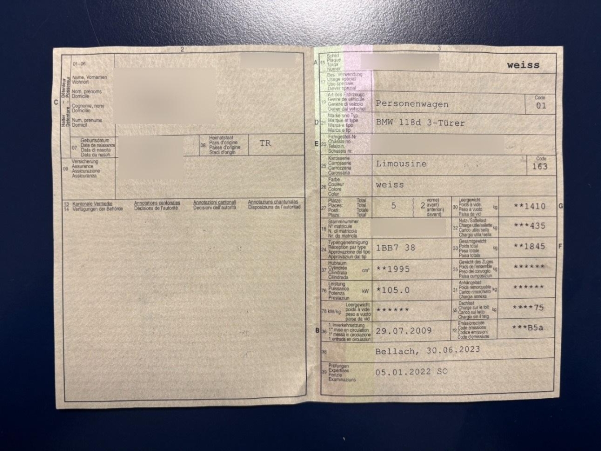 Heckscheibenheizung, Grün getönte Scheiben, Aussenspiegel rechts und links elektrisch verstellbar, Elektrische Fensterheber vorne, Zentralverriegelung mit Fernbedienung, Scheibenwischer vorne mit Intervall, Reifendruckverlust-Warnsystem, Gurtkontrolle, Drehzahlmesser, Wegfahrsperre elektronisch, Make up-Spiegel links, Make up-Spiegel rechts, Gurtstraffer vorne, Stossstangen und Aussenspiegel in Wagenfarbe, Wartungsintervall-Anzeige, Weisse Blinkleuchten, ISOFIX Kindersitzvorrichtung, Radiovorbereitung, Antenne, Entstörung und 6 LS, Vordersitze höhenverstellbar, Licht: Nebelschlussleuchte, Türgriffe in Wagenfarbe, Stoff-Ausstattung, Nichtraucherausführung, Airbag: Airbag Fahrer und Beifahrer, Radio BMW Business CD, Check-Control-System, Kofferraumfernentriegelung, Blinkleuchten seitlich vorn weiss, Digital Uhr, Tageskilometerzähler, Befestigungsösen im Laderaum, Durchladeklappe, Oelstandsanzeige, Bremsassistent (BAS), Assist: Cornering Brake Control (CBC), Skisack, Seitenairbags, Aussentemperaturanzeige, 3 Kopfstützen hinten, Lenkrad: Lenkrad längs- und höhenverstellbar, Interieurleisten in Silber, Halogenscheinwerfer, Kombi-Instrumente mit Chromzierringen, Schutzleisten für Stossstangen vorne und hinten, iDrive-System, Getriebe: 6-Stufen-Automat Steptronic, Heckscheiben-Wisch-/Waschanlage, Bremsbelag-Verschleissanzeige, Lenkung, elektrisch unterstützt, Abschliessbare Radschrauben, Bordcomputer, Window-Kopfairbags, Beleuchtetes Handschuhfach, 3-Punkt-Sicherheitsgurte auf allen Plätzen, Seitenaufprall-Schutzsystem, Aux-In Anschluss, Antiblockiersystem (ABS), Leuchtweitenregulierung elektrisch, Stahlräder, Zweiklanghorn, Tagfahrlicht, Drittes Bremslicht, Innenlicht-Abschaltverzögerung, Lackierung: Uni-Lackierung, Rücksitzlehne geteilt abklappbar, 12-Volt-Steckdose vorne, Partikelfilter und Oxydationskatalysator, Einstiegsschienen, Dynamische Stabilitätskontrolle (DSC), Lichtwarnsummer, Radzierblenden, Abblendlichtausschaltverzögerung 'Follow me home’, Automatische Stabilitäts- und Traktions- kontrolle, Armlehne vorne mit Ablagefach, Klima: Klimaanlage, Motor Start-/Stop-Anlage, Nebelscheinwerfer