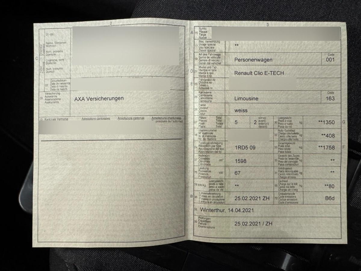 Licht: Voll-LED-Scheinwerfer mit C-Lichtsignatur, Assist: Automatische Notfallbremsfunktion (AEBS), Aussenspiegel in Wagenfarbe, Pack Aussen Chrome – Luftleitblechverzierungen, Seitenschutzring und Heckschürze in Chrom, Räder: Stahlfelgen 16-Zoll mit Radzierblenden Design Amicitia 195/55R16, Katalysator geregelt, Aussenspiegel elektrisch einstell- und beheizbar mit Temperatursensor,asphärisch auf der Fahrerseite, Assist: Spurhalteassistent, Dekor: Armaturenbrett Noir, Warnanzeige für nicht angelegten Fahrersicherheitsgurt / für nicht geschlossene Türen, Assist: Verkehrszeichenerkennung, Garantie: Renault Garantie 3 Jahre oder 100’000 km (ab 1. Inv.), Scheibenwischer vorne mit Intervall, Servolenkung, Assist: Abstandswarner, Licht: Tagesfahrlicht und Blinker mit LED, Sitze: Höhenverstellbarer Fahrersitz, Elektronisches Stabilitäts-Programm (ESP) – mit Antriebsschlupfregelung (ASR) und Untersteuerungskontrolle (CSV), Sitze: Dreipunktsicherheitsgurte (höhenverstellbar vorne), Sitze: Kopfstützen hinten höhenverstellbar, Polster: Stoffsitzbezug Mountain 3D Gris und Noir, Assist: Berganfahrhilfe (Hill Start Assist), Media: Apple CarPlay und Android Auto, Warnsummer für nicht angelegten Fahrsicherheitsgurt bei Fahrer und Passagieren, Zentralverriegelung, Räder: Reifenreparatur-Set (Tire Fit), Airbag: Seitenairbags „Kopf” vorne und hinten, Media: Integriertes Multimediasystem EASY LINK mit 7-Zoll Touchscreen, Türleiste Chrom, Elektrische Fensterheber vorne, Getriebe: Automatisiertes 6-Gang-Doppelkupplungsgetriebe, Licht: Nebelschlussleuchte, Lenkrad: Lederlenkrad, Türgriffe in Wagenfarbe, Assist: Tempomat mit Geschwindigkeitsbegrenzer, ISOFIX-Befestigungspunkte für Kindersitz an den äusseren Rücksitzen, Heckspoiler, Klima: Manuelle Klimaanlage mit Antipollen-Filter, Drehzahlmesser, Assist: Einparkhilfe hinten, Airbag: Airbag Fahrer und Beifahrer, Licht: Drittes Bremslicht, Assist: Renault automatischer Notruf (112), Dekor: Innenharmonie Gris, Manuelle Fensterheber hinten, Wegfahrsperre elektronisch, Lackierung: Uni-Lackierung, Licht: Nebelscheinwerfer, Heckscheibenheizung, Assist: ABS mit Notbremsassistent und Bremskraftverteilung, Analoge Instrumententafel 4.2-Zoll mit Geschwindigkeitsanzeige, Klima: Luftzirkulation, Bordcomputer, Räder: Reifendruckkontrollsystem, Heckscheibenwischer, Lenkrad: Lenkrad in Höhe und Tiefe verstellbar