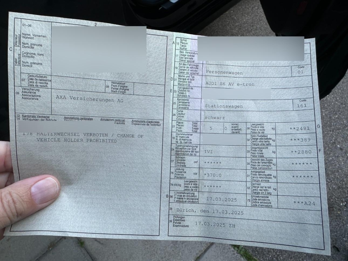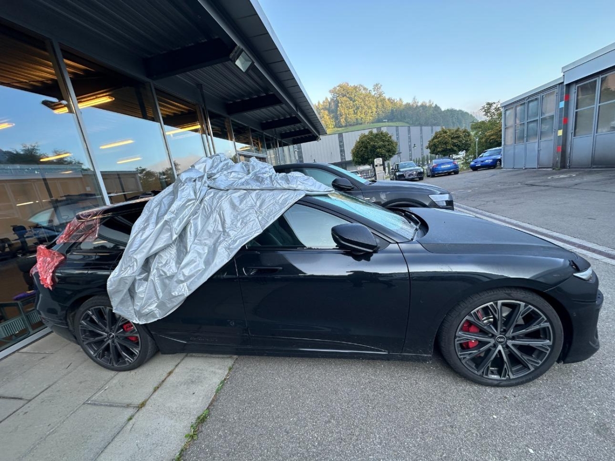 Komfortschlüssel ohne Safelock, Media: Digitaler Radioempfang, Telefonablage mit induktiver Ladefunktion, Media: Audi Application Store und Smartphone-Interface, Lenkrad: Sportlederlenkrad, 3-Speichen, oben und unten abgeflacht mit Multifunktion und Schaltwippen, Paket: Ambiente Lichtpaket, Sitze: Rücksitzbank ungeteilt, Lehne geteilt umlegbar (dreiteilig) mit Mittelarmlehne, Klima: 3-Zonen-Klimatisierungsautomatik, Servolenkung, Netztrennwand, Elektrische Fensterheber vorne, Frontkofferraum (Frunk), Media: Datenmodul Europa, Zweiter Ladezugang, Türen: Türgriffe in Wagenfarbe, Aussenspiegelgehäuse Chromoptik matt silber, On-board-Ladegerät bis 11 kW (AC), Verbandmaterial,Warndreieck und Warnveste, Assist: Verkehrszeichenbasierter Geschwindigkeitsbegrenzer, Sitze: Kindersitzbefestigung i-Size auf der Beifahrerseite und i-Size und Top Tether – auf den äusseren Fondsitzen, Gepäckraumklappe elektrisch öffnend und schliessend, Vorbereitung für Anhängevorrichtung, Aussenspiegel elektrisch einstell-, beheiz- und anklappbar, beidseitig automatisch abblendend, Media: Audi connect Navigation & Infotainment, Assist: Kreuzungsassistent, Media: FOD Funktionen online verfügbar, Ladeklappe elektrisch, Getriebe: Direktantrieb, kein Getriebe, Audi drive select, Elektronisches Stabilitäts-Programm (ESP), Garantie: Audi Garantie 2 Jahre ohne Kilometerbegrenzung (ab 1. Inv.), Licht: Tagesfahrlicht mit Assistenzfahrlicht u.Coming- u. Leaving-home Funktion automatisch, Airbag: Airbag Beifahrer deaktivierbar, Media: MMI experience plus, Dekor: Interieurelemente oben und unten Kunstleder plus, Dekor: Dekoreinlagen Aluminium matt gebürstet mit Linearprägung anthrazit, Fahrwerk: Adaptives S-Luftfederfahrwerk, Schlüssel für Schliesssystem mit Fernbedienung, Dachspoiler, Lackierung: Uni-Lackierung, Vorbereitung für intelligente Ladefunktionen, Sitze: Vordersitze heizbar, Licht: LED-Scheinwerfer plus, Assist: Traktionskontrolle, Lenkrad: Lenkradeinstellung manuell, Antiblockiersystem (ABS), Klima: Elektrische Luftzusatzheizung, Wärmeschutz- und Akustikverglasung Frontscheibe, Fussmatten vorne und hinten, Airbag: Seitenairbag vorn, mit Kopfairbag und Interaktionsairbag vorn, Zentralverriegelung mit Fernbedienung, Klima: Wärmepumpe, Airbag: Airbag Fahrer und Beifahrer, Klima: Automatische Umluftregelung, Interieur mit Sportsitzen, Leder/Kunstleder-Kombination mit S-Prägung, Fensterzierleisten Aluminiumoptik, Audi connect Notruf & Service mit Audi connect Remote & Control, Räder: Räder Audi Sport, 5-Speichen-Tripod, schwarz metallic, glanzgedreht – 8,0 J 9,0 J x 20, Reifen 235/45 265/40 R20, Media: Audi Soundsystem, Wegfahrsperre elektronisch, Paket: Assistenzpaket Fahren und Parken, Räder: Reifendruck-Kontrollanzeige, Innenspiegel automatisch abblendbar, Modellkennzeichnung am Heck, Ladedose Combo 2 (EU), Licht: Projektionsleuchte in den Aussenspiegeln, Akustikverglasung Türscheiben vorn, Stossfänger S-Modell, Digitaler Schlüssel, Ladekabel Mode 3 für öffentliches Laden bis 22 kW, Räder: Reifenreparatur-Set (Tire Fit), Assist: Aufmerksamkeits- und Müdigkeitserkennung, Audi virtual cockpit plus