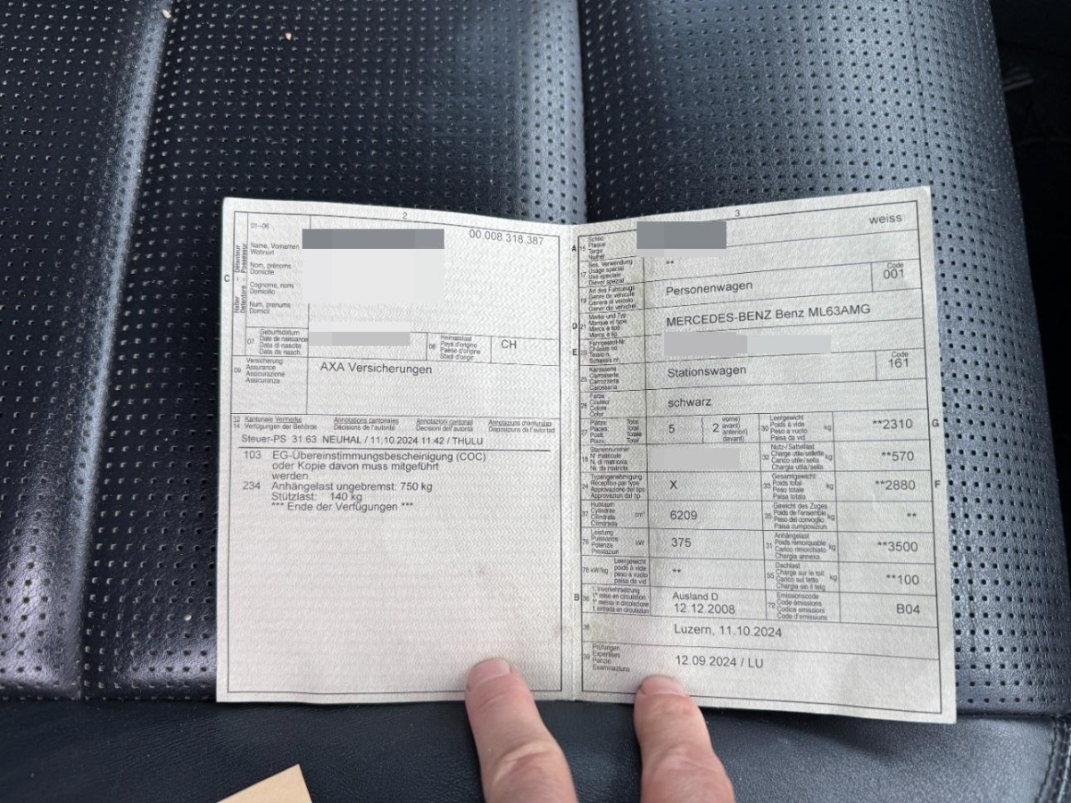 7-Stufen-Automat 7G-TRONIC, Licht:Ausstiegsleuchten in den Türen, Radiovorbereitung, Scheibenantenne, Ent- störung und 8 LS, Kotflügelverbreiterung, Aussentemperaturanzeige, Sitze: Rücksitzlehne geteilt abklappbar, Sitze: 3 Kopfstützen hinten, Fussraumbeleuchtung vorne, Sportpedalanlage, Antiblockiersystem (ABS), Tageskilometerzähler, Abblendlichtausschaltverzögerung 'Follow me home’, Sitze:Vordersitze heizbar, Leseleuchten hinten, Regensensor für Scheibenwischer vorne, Parameterlenkung, Ablagefach im Kofferraum, Gurtstraffer vorne und hinten, Drehzahlmesser, Pollenfilter (Staubfilter), Sportauspuffanlage, Nichtraucherausführung, Leseleuchten vorne, Innen- und Aussenspiegel automatisch abblendend, Analog-Uhr, Chrom-Paket, Kreuzstütze für Fahrersitz verstellbar, Airbag: Airbag Fahrer und Beifahrer, Audio 20 Radio CD/RDS, Assist: Berganfahrhilfe, Scheibenwischer vorne mit Intervall, Lackierung: Uni-Lackierung, Sport-Lederlenkrad, Licht:Fahrlichtautomatik, Airbag: Window-Kopfairbags, Bremsassistent (BAS), Räder:Reifenreparatur-Set mit Kompressor, Licht: Nebelschlussleuchte, Sitze: Armlehne vorne mit Ablagefach, Heckscheiben-Wisch-/Waschanlage mit, Blau getönte Scheiben, Dekor:Aluminium-Applikationen, Lichtwarnsummer, Wartungsintervall-Anzeige, Bremsbelagverschleiss, Multifunktionsanzeige, Licht:Nebelscheinwerfer, Stossstangenschutz hinten, Aux-In Anschluss (im Handschuhfach) für externe Audiogeräte, Aussenspiegel rechts und links beheizt und elektrisch verstellbar, asphärisch gewölbtes Spiegelglas, Kühlergrill verchromt, Ablagefach in Armlehne hinten, Elektronisches Stabilitäts-Programm (ESP) mit Anhängerstabilisierung, Schutzleisten in Wagenfarbe, Steckdose, Sitze:Vordersitze elektrisch verstellbar, Verbandskasten, Licht: Innenraumlicht-Paket, Klimatisierungsautomatik, Sportsitze vorne elektrisch verstellbar, Kombifilter, Sitze: ISOFIX Kindersitzvorrichtung, Unterfahrschutz, Türgriffe aussen in Wagenfarbe, Cupholder vorne und hinten, Lenkrad: Lenkrad-Wippschaltung (Paddles), Racetimer, Reifendruckverlust-Warnsystem, Beide Make up-Spiegel beleuchtet, Licht: Drittes Bremslicht, Katalysator geregelt, Multikontursitz für Fahrer, Elektr. Bergabfahr-Geschwindigkeits- regelung (DSR), Airbag: Seitenairbag für Fahrer und Beifahrer, Fahrwerk:Sportfahrwerk, Elektrische Fensterheber vorne + hinten, Abgedunkelte Heckleuchten, AMG Leichtmetallräder 19J, Abschliessbares Handschuhfach, Wegfahrsperre elektronisch, Lenkrad längs- und höhenverstellbar, Stossstangen und Aussenspiegel in Wagenfarbe, Beifahrersitz Multikontur, Leuchtweitenregulierung von innen, Höhenverstellbare Gurten vorne, Zentralverriegelung mit Fernbedienung, Allradantrieb permanent, AMG Optik Paket, Assist:Tempomat, Sitze: Gepäcknetze an beiden Vordersitzen, Sportbremsanlage, Einstiegsschienen vorne und hinten, Aufprallsensorik ARCADE, Verchromtes Auspuffendrohr, Nappa-Leder-Ausstattung, Steckdose im Kofferraum, Sitze: 3-Punkt-Sicherheitsgurte auf allen Plätzen, AIRMATIC Luftfederung mit elektronisch geregeltem Dämpfungssystem, Seitenaufprall-Schutzsystem, Flankenschutz / Trittbrett seitlich, Reiserechner