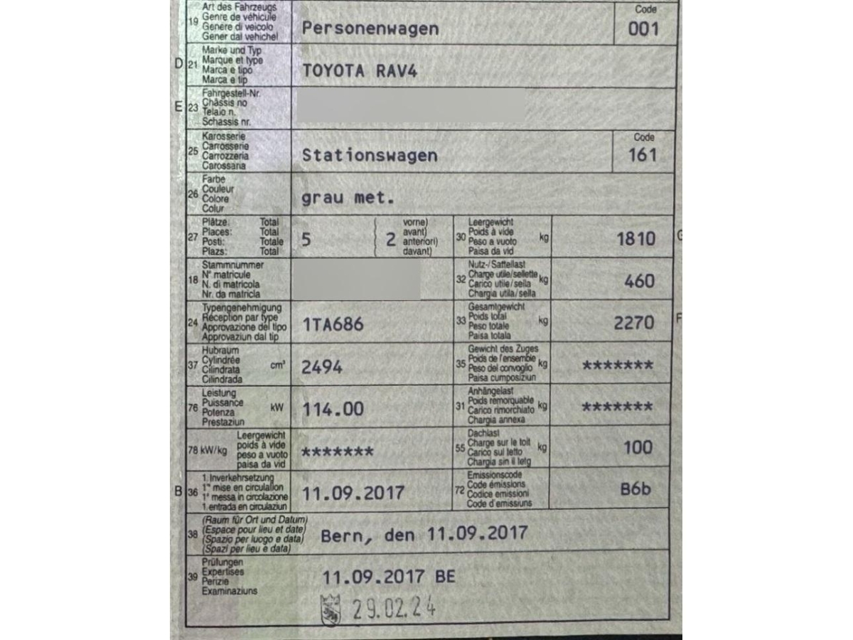 Drittes Bremslicht LED, Anhänger Stabilisierungkontrolle TSA, Lenkrad: Lenkrad längs- und höhenverstellbar, Aussentemperaturanzeige, Integriertes Fahrdynamikmanagement VDIM, Licht: LED-Tagfahrlicht, Tankdeckel-Entriegelung von innen, Gurtstraffer vorne, Tageskilometerzähler, Höhenverstellbare Gurten vorne, Lenkrad: Lenkradheizung, Servolenkung, Info-Display, Assist: Adaptiver Tempomat ACC, Notrad, Start-/Stop-Automatik, Handschuhfach, Elektrische Heckklappe, Scheinwerfer-Waschanlage, Kabelloses Ladesystem für mobile Endgeräte, Aschenbecher, Aussenspiegel rechts und links beheizt, elektrisch verstell- / und einklappbar, Heckscheibenheizung, ISOFIX Kindersitzvorrichtung, Lenkrad: Lederlenkrad, Pollenfilter (Staubfilter), Kopfstützen vorne höhenverstellbar, Airbag: Airbag Fahrer und Beifahrer, Regensensor für Scheibenwischer vorne, Räder: 4 Leichtmetallfelgen 18J mit Pneu, Dunkel getönte Scheiben, Easy-Flat-Floor-System, Assist: Verkehrszeichenerkennung RSI Road Sign Information System, Media: Multimedia Audiosystem Toyota Touch 2, Scheibenwischer vorne mit Intervall, Wärmeschutzverglasung, Licht: Nebelscheinwerfer, Mittelkonsole mit Ablagefach, Sitze: Fahrersitz höhenverstellbar, Zentralverriegelung mit Fernbedienung, Sitze: Vordersitze heizbar, 4 Scheibenbremsen, Licht: Halogenscheinwerfer, Assist: Kollisionswarnung, Bottleholder, Media: 6 Lautsprecher, Audiofernbedienung am Lenkrad, Beide Make up-Spiegel beleuchtet, Airbag: Knie-Airbag für Fahrer, Scheibenwischerablage beheizt, Blinker in Aussenspiegel, Assist: Rückfahrkamera, Polster: Stoff-Ausstattung, Elektrische Fensterheber vorne + hinten mit Komfortschliessung, Media: iPod + USB Anschluss, Airbag: Seitenairbag für Fahrer und Beifahrer, 3 Kopfstützen hinten, Bremsassistent (BAS), Räder: TPMS Reifendrucküberwachungssystem, Steckdose 12V, Media: DAB+ (Digital Audio Broadcasting), Digital Uhr, Wegfahrsperre elektronisch, Katalysator geregelt, Aussenspiegel und Türgriffe in Wagenfarbe, Sitze mit Schleudertrauma-Schutzsystem, Assist: Berganfahrhilfe (Hill Assist Control – HAC), Media: Bluetooth Freisprecheinrichtung, Automatisches Einschalten der Abblendlichter, Stabilitäts- und Traktionskontrolle (VSC und TRC), Assist: Park Distance Control vorne und hinten, Smart Key System und elektrische Heckklappe, Scheibenwischer-Enteiser, Airbag: Airbag Beifahrer deaktivierbar, Türwarnsummer, Haltegriffe 2 vorne und 2 hinten, Leseleuchten vorne, Lackierung: Uni-Lackierung, Farbmonitor, Gurtkontrolle, Assist: Müdigkeitserkennung, 3-Punkt-Sicherheitsgurte auf allen Plätzen, Licht: Nebelschlussleuchte, Licht: Innenraumbeleuchtung, Teppichfussmatten, Innenspiegel automatisch abblendbar, Heckscheiben-Wisch-/Waschanlage, Ablagen in den Türen, Unterfahrschutz hinten, Sitze: Rücksitzlehne geteilt abklappbar, Licht: Automatisches Fernlicht, Lenkrad: Multifunktionslenkrad, Drehzahlmesser, Assist: Spurhalteassistent, Media: AUX-Anschluss, Laderaumabdeckung, ABS, EBD elektronische Bremskraftverteilung, Cupholder vorne und hinten, Kartentaschen an den Rückenlehnen, Licht: Abblendlichtausschaltverzögerung 'Follow me home’, Airbag: Window-Kopfairbags, Klima: Klimatisierungsautomatik, Kofferraumbeleuchtung, Getriebe: Stufenloser Automat, Allradantrieb permanent, Kofferaumnetz, Bordcomputer mit Energieverbrauchanzeige und Fahrstatistik