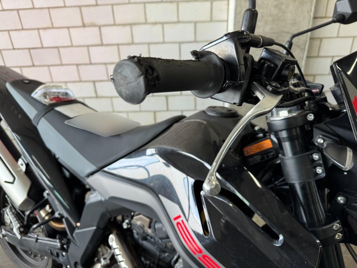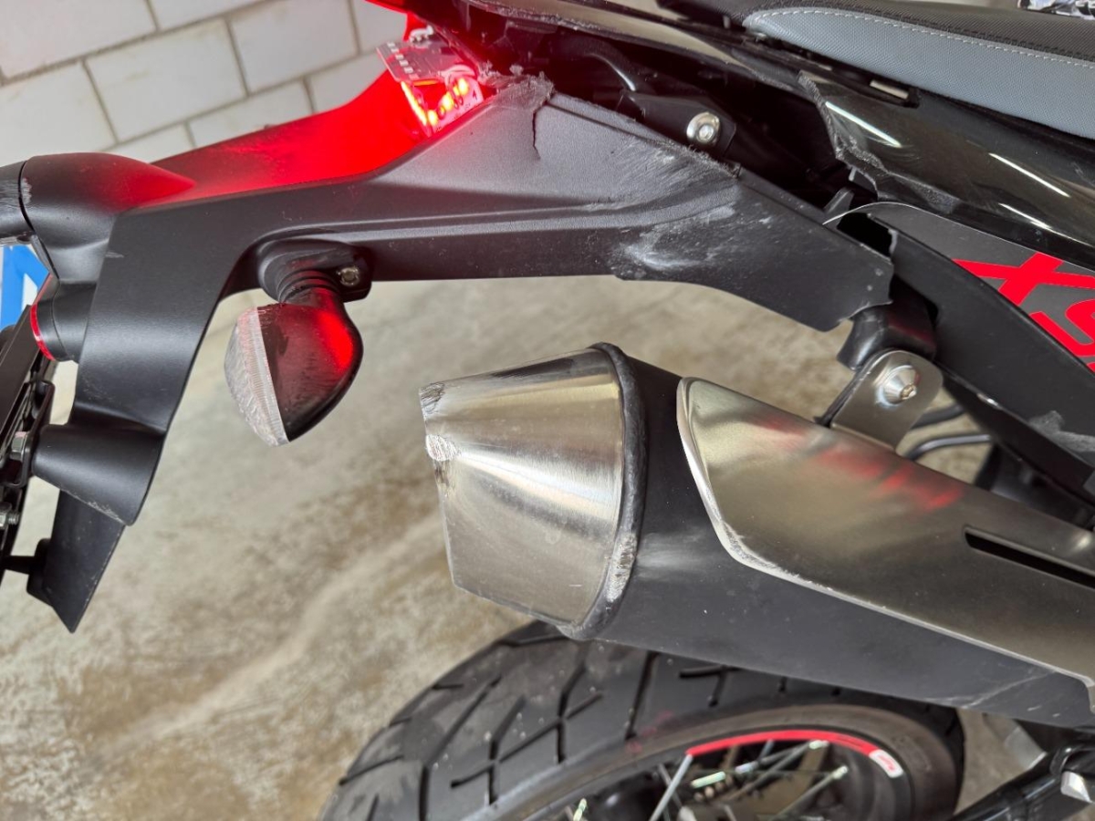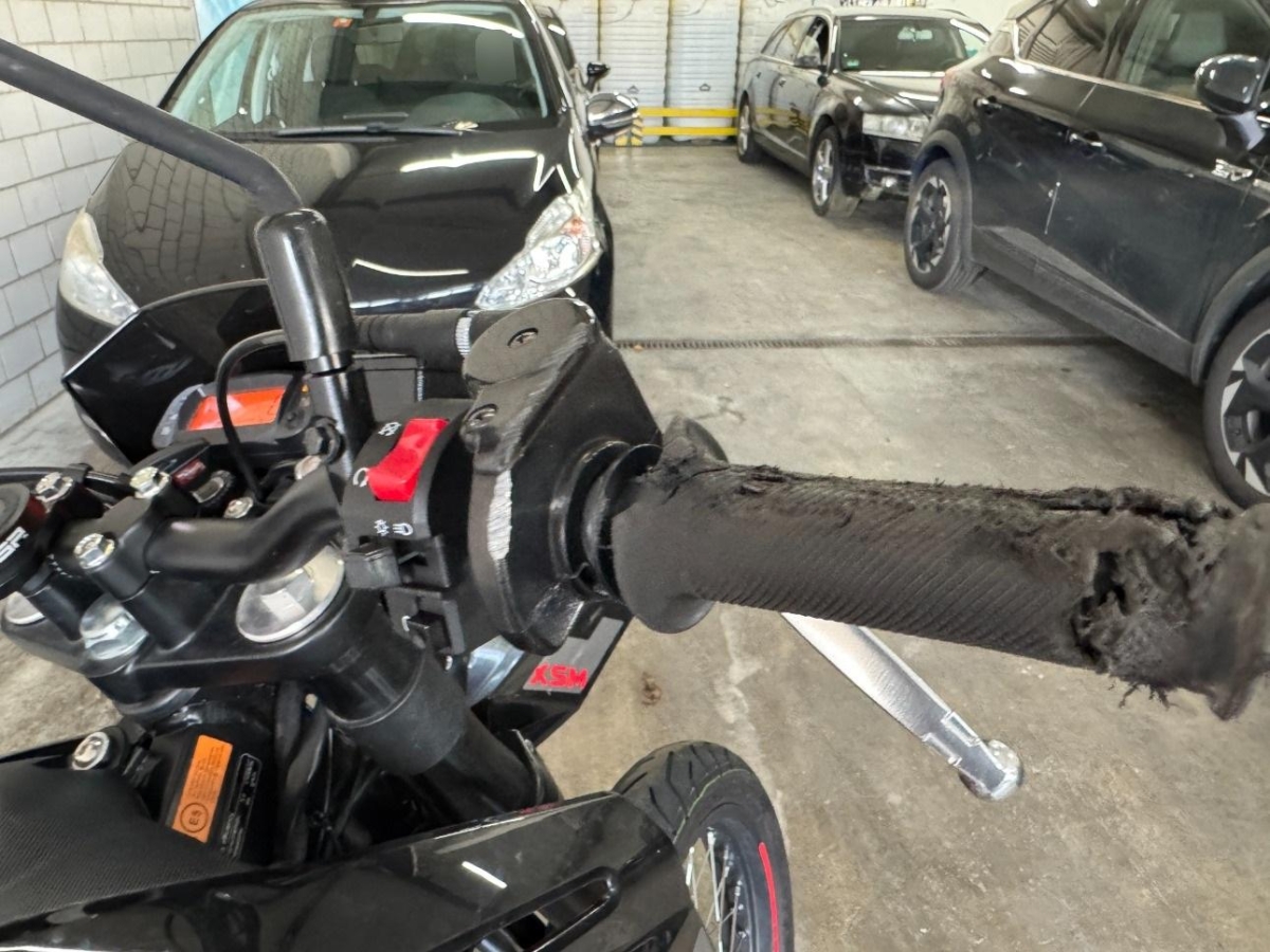Auspufftopf, Aussenspiegel rechts, Diverse Anbauteile, Fussraster rechts, Griff rechts, Heckverkleidung, Kupplungsgehäuse, Lenker, Rahmen, Rücklicht rechts, Schwinge, Verschalungen hinten, Verschalungen vorne