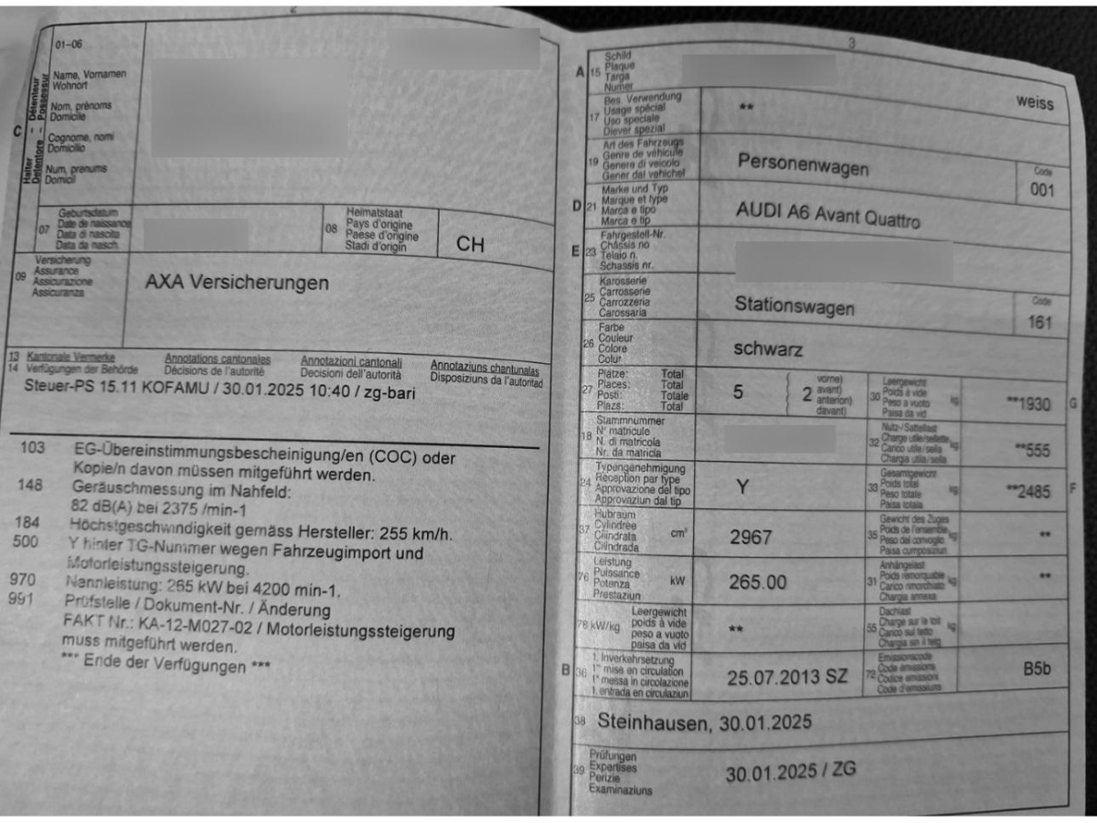 Laderaumabdeckung, Türgriffe aussen in Wagenfarbe, Sitze: Normalsitze, Aussentemperaturanzeige, Auspuffanlage mit 2 Endrohren (links und rechts), Zentralverriegelung mit Fernbedienung, Digital Uhr, Sitze: Vordersitze manuell verstellbar, Elektrische Fensterheber vorne + hinten, Sicherheitslenksäule, Stossstangen und Aussenspiegel in Wagenfarbe, Sitzbezüge Stoff, Kindersicherung an den hinteren Türen, Getriebe: 8-Stufen-Automat sequentiell, Brillenablage, Seitenaufprall-Schutzsystem, Beleuchtetes und abschliessbares Handschuhfach, Schublade unter Fahrersitz, LED Blinker im Aussenspiegel, Seitenairbag für Fahrer und Beifahrer, Abblendlichtausschaltverzögerung 'Follow me home’, Lackierung: Uni-Lackierung, Mittelarmlehne vorn in Kunstleder schwarz mit Kontrastnaht in Rot, 3 Kopfstützen hinten, Durchladesystem inkl.Skisack, Allradantrieb permanent, Kartentaschen an den Rückenlehnen, Sitze: Vordersitze höhenverstellbar, Frontscheibe Verbundglas, Mittelarmlehne hinten, Elektronische Parkbremse, Sitze: Vordersitze heizbar, Leseleuchten vorne, Aktive Kopfstützen, Leseleuchten hinten, Getönte Scheiben, Lenkrad: Lenkrad längs- und höhenverstellbar, Rücksitzlehne geteilt abklappbar, Gurtkontrolle, Warnblinkautomatik bei Vollbremsung, Heckscheibenheizung, Räder: Reifendruck-Kontrollanzeige, Antriebsschlupfregelung (ASR), ABS, EBD elektronische Bremskraftverteilung, Anfahrassistent, Gurtstraffer mit Gurtkraftbegrenzer, Assist: Bremsassistent (BAS), 12-Volt-Steckdose vorne, Licht: Tagfahrlicht, Dachreling blank, Veloursfussmatten vorne und hinten, MMI basic, Elektronische Differentialsperre (EDS), Drehzahlmesser, 3-Punkt-Sicherheitsgurte auf allen Plätzen, 12 Volt-Steckdose im Laderaum, Kreuzstützen für Vordersitze elektrisch verstellbar, Wartungsintervall-Anzeige, Klima: Pollenfilter (Staubfilter), Audi drive select, Tempomat mit Geschwindigkeitsbegrenzer, Einstiegsschienen, Airbag: Window-Kopfairbags, Innenlicht-Abschaltverzögerung, Wegfahrsperre elektronisch, Media: MMI Radio plus, Adaptives Bremslicht, Airbag: Airbag Fahrer und Beifahrer, Wassertemperaturanzeige, Scheibenwischer vorne mit Intervall, Servotronic, Kraftstofftank 75 Liter, Lichtwarnsummer, Bremsbelag-Verschleissanzeige, Zweiklanghorn, Alu-Räder 8Jx17 im 6-Arm-Design, Schienensystem im Laderaum mit variablen Verzurrösen, Nebelscheinwerfer, Ablagen in den Türen, Multifunktions-Lederlenkrad 4-Speichen mit Schaltwippen, Garantie: 2 Jahre ohne Kilometerbegrenzung (ab 1. Inv.), Dekoreinlagen Micrometallic platin, Gepäcksicherungsnetz(e) im Laderaum, Stop/Start-Technologie, Ausstiegsleuchten in den Türen vorn, Klimaautomatik Komfort, Lichtsensor, Instrumentenbeleuchtung, regelbar, Audi pre sense basic, Tageskilometerzähler, Elektronisches Stabilitäts-Programm (ESP), Regensensor für Scheibenwischer vorne, Start-/Stop-Knopf, Wagenheber, Schalthebelknauf in Leder, Media: Bluetooth-Schnittstelle, Partikelfilter und Oxydationskatalysator, Licht: Drittes Bremslicht, Schublade unter Beifahrersitz, Notrad, Glanzpaket: Fensterschachtleisten in eloxiertem Alu, Einstiegsleisten in Alu, Cupholder vorne, Höhenverstellbare Gurten vorne, Leuchtweitenregulierung elektrisch, Aschenbecher und Zigarettenanzünder, Licht: Halogenscheinwerfer, Media: Audi Sound System, Scheinwerfer-Waschanlage, Aussenspiegel rechts und links beheizt und elektrisch verstellbar, asphärisch gewölbtes Spiegelglas, Licht: Nebelschlussleuchte