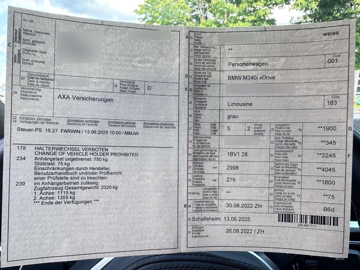 Media: harman/kardon Surround Sound-System – Digitaler Verstärker mit individuell einstellbarem Equalizing, 464 W Verstärkerleistung, 9 Kanäle. Lautsprecherblenden mit harman/kardon-Schriftzug, 16 Lautsprecher., Licht: Fernlicht-Assistent, Dekor: Interieurleisten Aluminium Mesheffect mit Akzentleiste Perlglanz Chrom, Active Protection Sicherheitspaket zur Einleitung von Schutzmassnahmen für die Insassen in drohenden Unfallsituationen: – Reversible Gurtstraffung – Automatisches Schliessen der Fenster bis auf einen Spalt – Ausstattungsabhängig Schliessen des Schiebedachs, Räder: 19″ M Leichtmetallräder Doppelspeiche 791 M Bicolor Jet Black glanzgedreht, mit Mischbereifung und Notlaufeigenschaften Vorn: 8 J×19/Bereifung 225/40 R 19 Hinten: 8,5 J×19/Bereifung 255/35 R 19, Glasdach, elektrisch, Fahrwerk: Adaptives M Fahrwerk – Straffere Feder-/Dämpferauslegung mit Fahrzeugtieferlegung – Durch elektronisch geregelte Dämpfer, die radindividuell angesteuert werden, deutlich erhöhte Sportlichkeit unter Beibehaltung eines hohen Komfortlevels – Angepasste Lenkübersetzung durch Koppelung zur SA 2VL «Variable Sportlenkung» inkl. Servotronic – Entsprechende elasto-/kinematische Auslegung – Änderung der Abstimmung je nach Einstellung des Fahrerlebnisschalters – Erweiterung des Fahrerlebnisschalters, Anhängerkupplung – Betätigungsschalter im Gepäckraum. Elektronisch einschwenkbare Anhängerkupplung. Kann vollständig unter die Heckschürze eingeschwenkt werden. Inklusive Anhänger-Stabilisierungskontrolle., Türen: Automatische Heckklappenbetätigung – Fernöffnen mit Schlüssel, Schliessen über Heckklappentaster und Schlüssel, Media: Telefonie mit Wireless Charging – Drahtlose Verbindung des Telefons mit dem Fahrzeug Smartphoneablage vorn vor den Cupholdern mit induktivem Laden gemäss QI-Standard für geeignete Mobiltelefone (inklusive LED-Ladezustandsanzeige und Handy-Vergessens-Warnung) und Verbindung zur Aussenantenne möglich., Lackierung: BMW Individual Lackierung, Sitze: M Sportsitze für Fahrer und Beifahrer, Sitze: Lordosenstütze für Fahrer und Beifahrer, Komfortzugang Beinhaltet folgende Funktionen: – Schlüsselloser Zugang zum Fahrzeug – Welcome Inszenierung bei Annäherung ans Fahrzeug – Automatische Entriegelung bei Annäherung ans Fahrzeug – Automatische Verriegelung beim Entfernen vom Fahrzeug – Berührungsloses Öffnen und Schliessen der Heckklappe (nur mit 316 Automatische Heckklappenbetätigung) Beinhaltet den BMW Digital Key mit folgenden Funktionen: – Ver- und Entriegeln sowie Starten des Fahrzeugs unter Verwendung eines kompatiblen Smartphon., Sitze: Sitzverstellung, elektrisch mit Memory, Paket: Innen- und Aussenspiegelpaket, Lenkrad: Lenkrad beheizbar, Licht: BMW Laserlicht – Abblendlicht (LED-Technologie) – Fernlicht (LED-Technologie mit Laser-Modul ab 60 km/h) – Tagfahrlicht, Iconlight in 3/4 Kreisform (LED-Technologie) – Fahrtrichtungsanzeiger, Augenbraue (LED-Technologie) – Adaptives Kurvenlicht (LED-Technologie) – Abbiegelicht (LED-Technologie) – BMW Selective Beam, der blendfreie Fernlichtassistent von BMW – Laser-Fernlicht-Modul mit über 500 m Reichweite – Inklusive spezifischen Designelementen in blau sowie exklusivem Schriftzug BMW Laser, Dekor: Galvanikapplikation für Bedienelemente – Tasten des Multifunktionslenkrades (in Verbindung mit SA 710 M Lederlenkrad in Schwarz) – Schaltzentrum Türe Fahrerseite und Beifahrerseite mit Fensterheber – Schalter Fensterheber im Fond – Türverriegelungs-Schalter, M Leuchten Shadow Line – Ausführung ausgewählter Chromelemente der Leuchte in Dunkel, Media: WLAN-Hotspot – Ermöglicht die Verbindung von mobilen Endgeräten ins Internet über die im Fahrzeug integrierte SIM-Karte. In Abhängigkeit von der örtlichen LTE-Verfügbarkeit können bis zu 10 Geräte mit max. 100 Mbit/s im Internet surfen., Media: BMW Live Cockpit Professional – Anzeigeverbund bestehend aus einem volldigitalem 12,3″ Instrumentendisplay und einem hochauflösendem 10,25″ Control Display – BMW Operating System 7, Navigationsfunktion – Intuitive Bedienmöglichkeiten wahlweise über den BMW Intelligent Personal Assistant – Persönliches Nutzerkonto Vierfach-Tuner mit Diversity-Empfang, RDS und TMC – 2 USB-Anschlüsse zum Laden und zur Übertragung von Daten, Bluetooth/WiFi-Schnittstelle – 4G LTE Connectivity: festverbaute SIM-Karte mit 4G Netz, Sonnenschutzverglasung, Paket: M Technik Paket Die erhöhte Wärmekapazität des Bremssystems und das Kühlsystem garantieren eine langanhaltende hohe Leistungsfähigkeit unter extremem Fahrverhalten (speziell in Kombination mit hohen Aussentemperaturen) Beinhaltet Upgrades für das Antriebsstrangkühlsystem sowie einen Zollsprung der M Sportbremse von 17″ auf 18″ an der Vorderachse (Hinterachse: 17″), Alarmanlage, M Hochglanz Shadow Line mit erweiterten Umfängen – Nierenrahmen und -stäbe in Schwarz hochglänzend – Endrohrblenden in Schwarz Chrom, Akustikverglasung Die serienmässige Akustikverglasung der Frontscheibe wird erweitert um die beiden Front-Seitenscheiben in Verbundsicherheitsglas. Dadurch gesteigerter Fahrkomfort durch Reduzierung der Aussengeräusche inkl. Filterung von bestimmten Frequenzbändern, höherer Einbruchschutz da durchschlaghemmend, geringere Gefahr der Verletzung an Splittern sowie höherem UV-Schutz, Dekor: Instrumententafel in Sensatec – Instrumententafel Oberteil in schwarz mit grauer Doppelnaht