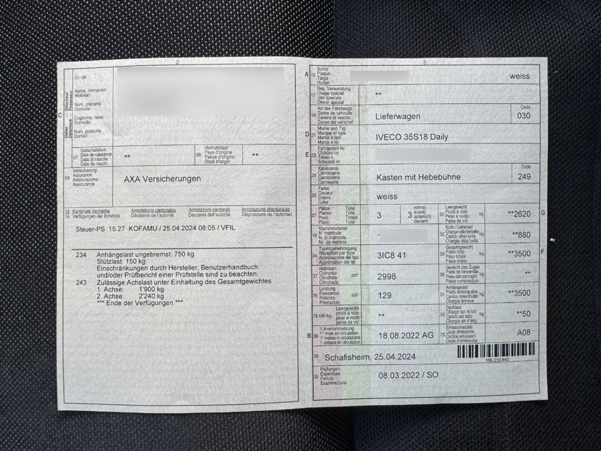 | Fahrzeugausweis | Vorhanden |