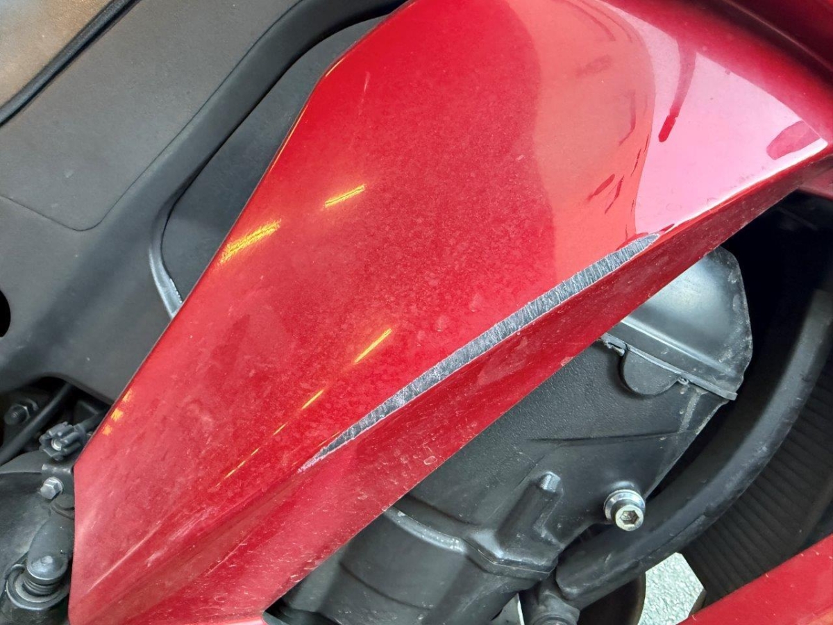 Antrieb, Armaturen, Auspuffkollektor, Auspufftopf, Fussraster links, Fussraster rechts, Gabelholm, Getriebe, Heck, Heckverkleidung, Kabelstrang, Kühler, Lenkanschlag, Lenkschloss, Motor, Rad hinten, Rad vorne, Rahmen, Rücklicht, Scheinwerfer, Schutzblech hinten, Schutzblech vorne, Schwinge, Sitz, Tank, Verschalungen hinten, Windschutzscheibe, Zündschloss