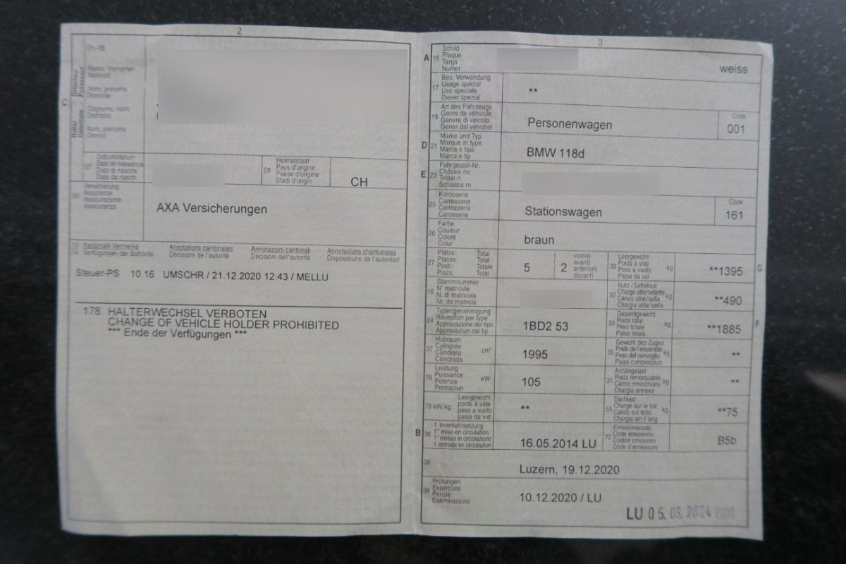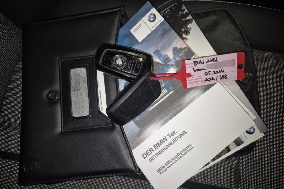Reifendruckverlust-Warnsystem, Nichtraucherausführung, Partikelfilter und Oxydationskatalysator, Sitze: Beifahrersitz höhenverstellbar, Lenkrad: Lenkrad längs- und höhenverstellbar, Dynamische Stabilitätskontrolle (DSC), Window-Kopfairbags, Make up-Spiegel rechts, Check-Control-System, Verbandskasten, TeleService, Aux-In Anschluss, Schlüsselloser Motorstart, Klima: Klimaanlage, ISOFIX Kindersitzvorrichtung, Motor Start-/Stop-Anlage, Durchladeklappe, Lederlenkrad, Airbag: Airbag Fahrer und Beifahrer, Make up-Spiegel links, Elektronische Differentialsperre, Cupholder, Bremsassistent (BAS), Antiblockiersystem (ABS), Kopfstützen hinten, Anfahrassistent, Radio BMW Business CD, Gangempfehlung, ISOFIX-Befestigungspunkte für Kindersitz an den äusseren Rücksitzen, Veloursfussmatten vorne und hinten, 12-Volt-Steckdose vorne, Intelligenter Notruf, Zusätzliche 12V Steckdosen, Elektrische Lenkung (EPS), Leuchtweitenregulierung von innen, DAB+ (Digital Audio Broadcasting), Rücksitzlehne geteilt abklappbar, Gurtstraffer vorne, Dynamische Bremsleuchten, Stossstangen und Aussenspiegel in Wagenfarbe, Bremsbelag-Verschleissanzeige, Befestigungsösen im Laderaum, Bordcomputer, Schliessystem mit Zentralverriegelung, Auspuffblende, verchromt, Türgriffe in Wagenfarbe, Dachzierleiste in Wagenfarbe, BMW Mobility System, Assist: Crash-Sensor, Fahrersitz höhenverstellbar, Wegfahrsperre elektronisch, Blinker in Aussenspiegel, Drittes Bremslicht, Elektrische Fensterheber vorne + hinten, Innenraumbeleuchtung, Getriebe: 6-Gang-Getriebe, Kopfstützen hinten abklappbar, Wärmeschutzverglasung, Bremsenergie-Rückgewinnung, Seitenairbags, 3-Punkt-Sicherheitsgurte auf allen Plätzen, Aussenspiegel rechts und links beheizt und elektrisch verstellbar, asphärisch gewölbtes Spiegelglas, Assist: Cornering Brake Control (CBC), Automatische Stabilitäts- und Traktions- kontrolle, Licht: Nebelschlussleuchte, Akzentleisten Oxidsilber matt, Armauflage vorne, verschiebbar, Einstiegsschienen mit Logo, Interieurleisten Acrylglas schwarz, Leichtmetallfelgen im V-Speichen-Design 411, 16J, Servotronic, Sport-Lederlenkrad, Stoff-/ Leder, Metro Ausstattung