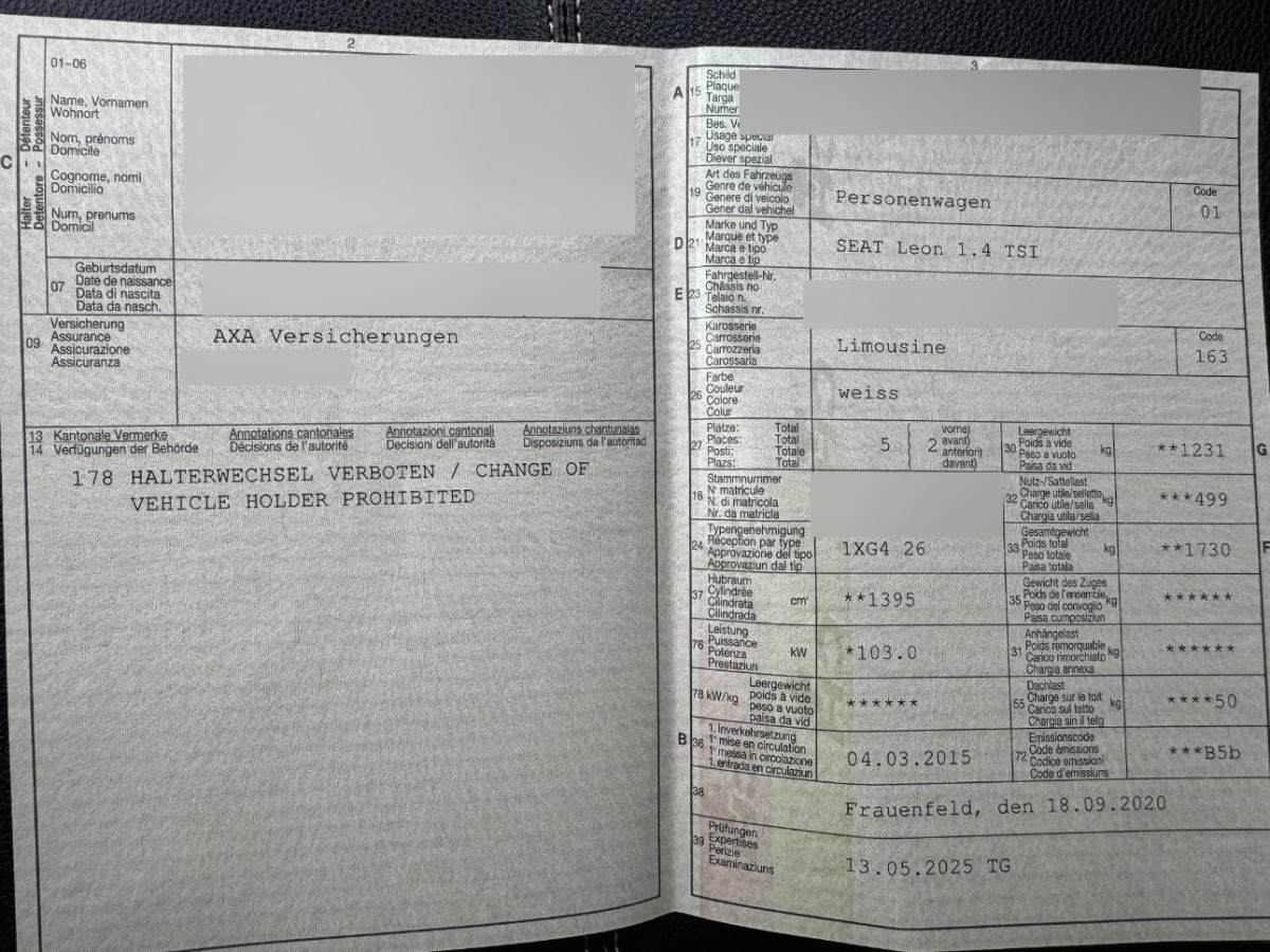 Aussenspiegel und Türgriffe in Wagenfarbe, Katalysator geregelt, Lackierung: Uni-Lackierung, Heckscheiben-Wisch-Waschanlage mit Intervall, Fahrwerk: Sportfahrwerk, Schalthebelknauf in Leder, Sitze: Mittelarmlehne vorne, XDS inkl. Berganfahrassistent, Media: Mobiltelefon Freisprecheinrichtung Bluetooth, Licht: Coming-home-Funktion, Kopfstützen hinten (3), Klima: 2-Zonen-Klimaautomatik, Gurtstraffer vorne, Elektronisches Stabilitäts-Programm (ESP) mit Reifendruckkontrolle, Bremsassistent (BAS) und Sperrdifferential, 12-Volt-Steckdose vorne, Bordcomputer, Airbag: Beifahrerairbag deaktivierbar, Elektronische Traktionskontrolle (ASR/TCS), Assist: Tempomat, Assist: Berganfahrhilfe (Hill Holder), Cupholder vorne, Auspuffanlage mit 2 Endrohren, Kofferraumbeleuchtung, Servolenkung, Leuchtweitenregulierung von innen, ABS, EBD elektronische Bremskraftverteilung, Sonnenblende Fahrer und Beifahrerseite mit beleuchtetem Spiegel, Abgedunkeltes Scheibenglas (ab B-Säule), 5” Farbdisplay Touchscreen, SEAT Garantie: Garantie 2 Jahre ohne Kilometerbe-grenzung (ab 1. Inv.), USB-Anschluss, Licht: LED Heckleuchten, Teppichfussmatten vorne und hinten, Sitze: Vordersitze höhenverstellbar, Zentralverriegelung mit Fernbedienung, Motor Start-/Stop-Anlage, Sitze: Rücksitzlehne geteilt abklappbar 1/3 – 2/3, Lenkrad längs- und höhenverstellbar, Lenkrad: Ledermultifunktionslenkrad, Media: Lautsprecher 8, Einstiegsleisten in Aluminium, Airbag: Fahrer und Beifahrer Airbag, Handschuhfach Beleuchtet, Airbag: Seitenairbag für Fahrer und Beifahrer, 3-Punkt-Sicherheitsgurte auf allen Plätzen, Elektrische Fensterheber vorne und hinten mit Komfortbetätigung und Einklemmschutz, Gurte Höhenverstellbar vorne, Aussenspiegel rechts und links beheizt, elektrisch verstell-/ und einklappbar, Media: Radio/CD-Player mit MP3, SEAT Media System Color, Ambientes Licht, Aussentemperaturanzeige, Seitenaufprall-Schutzsystem, Kindersitzvorrichtung ISOFIX Beifahrerseite, Sportsitze vorne mit Lendenwirbelstütze, Getriebe: 6-Gang-Getriebe, Räder: 4 Leichtmetallfelgen 17J mit Pneu, Gurtkontrolle, Airbag: Knie-Airbag für Fahrer, Gurtstraffer mit Gurtkraftbegrenzer vorne, Kopfstützen vorne höhenverstellbar, Airbag: Window-Kopfairbags vorne und hinten, Wegfahrsperre elektronisch, Licht: Nebelscheinwerfer mit Cornering-Funktion, Aussenspiegel mit LED Blinker, Licht: Tagfahrlicht, Wärmeschutzverglasung, Reifenpannen-Set (Tire Kit)
