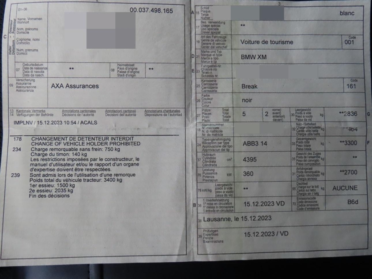 Antiblockiersystem (ABS), Assist: Dynamische Stabilitäts Control (DSC) mit erweiterten Umfängen, Bremsscheiben hinten, innenbelüftet, Sitze: M Multifunktionssitze für Fahrer und Beifahrer Beinhaltet: – für Fahrer und Beifahrer – beinhaltet die Funktionen der Sitzverstellung, elektrisch mit Memory (Memoryfunktion auch für Beifahrersitz) und Lordosenstütze für Fahrer und Beifahrer – elektrische Einstellung für oberes Lehnensegment, Lehnenbreite und Oberschenkelauflage – platzierte Perforation inklusive XM spezifischem Nahtbild – beleuchtetes M Logo auf der Kopfstütze, BMW Gestiksteuerung – Spezifisch festgelegte Funktionen können im Erkennungsbereich oberhalb der vorderen Mittelkonsole durch Gestik per Hand gesteuert werden., Lenkrad: Schaltwippen am Lenkrad, Media: harman/kardon Surround Sound-System – digitaler Verstärker mit individuell einstellbarem Equalizing, 415 W Verstärkerleistung, 9 Kanäle. Lautsprecherblenden mit Harman Kardon Schriftzug – 16 Lautsprecher, Licht: LED-Scheinwerfer – adaptiver LED-Scheinwerfer – Abblendlicht (LED-Matrix Technologie) – Fernlicht (LED-Matrix Technologie) – Tagfahrlicht und Fahrtrichtungsanzeiger (in separater Leuchteneinheit) – Leuchtweitenregulierung (automatische Anpassung an die Fahrsituation über vertikalen Schwenkmechanismus und Zu-/Abschalten von LED-Segmenten) – Automatisches Abbiegelicht (Cornering Light) – Standlicht – Heckleuchten – alle Außenleuchten in LED Technologie, Bremsscheiben vorne, innenbelüftet, Lenkrad: M Lederlenkrad, Fensterheber, elektrisch – Einklemmschutz und Komfortöffnung/-schließung, BMW ID Mit der BMW ID wird der Fahrer auf dem Display persönlich begrüßt und alle personalisierten Funktionen stehen zur Verfügung. Bei Verknüpfung der BMW ID mit dem Schlüssel wird die BMW ID bereits mit Entriegelung automatisch aktiviert. Die BMW ID ermöglicht es personalisierte Einstellungen zu speichern und auf andere BMW Fahrzeuge zu übertragen. Für Fahrer im Gastprofil sind Funktionen, die persönliche Daten verarbeiten, nicht verfügbar., Komfortzugang Beinhaltet folgende Funktionen: – Schlüsselloser Zugang zum Fahrzeug – Welcome Inszenierung bei Annäherung ans Fahrzeug – Automatische Entriegelung bei Annäherung ans Fahrzeug – Automatische Verriegelung beim Entfernen vom Fahrzeug – Berührungsloses Öffnen und Schliessen der Heckklappe Beinhaltet den BMW Digital Key mit folgenden Funktionen: – Ver- und Entriegeln sowie Starten des Fahrzeugs unter Verwendung eines kompatiblen Smartphon., Assist: Akustischer Fussgängerschutz – Künstlich generierter Sound beim elektrischen Fahren zum Schutz anderer Verkehrsteilnehmer (akustische Wahrnehmung). Beim Neu-Start immer aktiv (Default On)., Media: Personal eSIM, Bremsbelagverschleisssensoren vorne und hinten, Ablagemöglichkeiten – Handschuhkasten, abschließbar – Türtaschen vorn und hinten (eine 1,0 l Flasche kann bequem in der Türtasche abgestellt werden) – Ablageschale sowie -fach mit Deckel in der Mittelkonsole – Fach vor Getränkehalter – Getränkehalter: zwei vorn, zwei in Mittelarmlehne hinten, Assist: Geschwindigkeitsregelung mit Bremsfunktion, BMW Niere Iconic Glow – Optisches Exterieur-Highlight: Inszenierung der BMW Niere durch innovative LED-Fasertechnologie, Airbag: Frontairbagsystem für Fahrer und Beifahrer, Dekor: BMW Individual Instrumententafel lederbezogen Instrumententafel und Türbrüstungen lederbezogen: – bei Polster VC 'BMW Individual Leder 'Merino” in Walknappa Schwarz – bei Polster VD 'BMW Individual Leder 'Merino” mit Exklusivumfängen in Walknappa Vintage Coffee, Getriebe: Steptronic Sport Getriebe, 8-Gang Automatik, Klima: Klimatisierungsautomatik 4- Zonen – Temperaturregelung für Fahrer, Einstellung von Luftmenge und Luftverteilung Automatikprogramm mit 5 Intensitätsstufen für Fahrer, Beifahrer und Fondpassagiere getrennt – Automatikprogramm mit 5 Intensitätsstufen – Einstellung der Temperaturschichtung für Fahrer und Beifahrer getrennt über MMI – Klimabedienteil vorn mit Vollfarbdisplay – separates Klimabedienfeld für Fondpassagiere in der Mittelkonsole hinten – SYNC-Funktion, M Sportbremse, schwarz hochglänzend Schwarz hochglänzend lackierte Bremssättel mit M-Schriftzug, Licht: Fernlicht-Assistent – Automatisches Ein- und Ausschalten des Fernlichtes abhängig von der Verkehrssituation – Steuerung über Sensor an der Vorderseite des Innenspiegels, Assist: Speed Limiter, BMW Garantie: Repair Inclusive 4 Jahre oder 200’000 km – es gilt das zuerst Erreichte., Türen: Automatische Heckklappenbetätigung – Elektrisch öffnende/schliessende Heckklappe – Bedienungstasten in Türverkleidung Fahrerseite und Heckklappe – Heckklappenschloss, elektrisch mit Verriegelungsüberwachung – Öffnen/ Schließen mit Fernbedienungsschlüssel möglich, Media: ConnectedDrive Services, Einstiegsleisten beleuchtet mit Schriftzug, M Hochglanz Shadow Line Ausstattungsumfänge: – Schachtabdeckung unten Schwarz, oben in Nightgold – Spiegeldreieck und Spiegelrahmen in Schwarz, M Sicherheitsgurte – beinhaltet Sicherheitsgurte schwarz mit Farbcodierung in M Farben für erste und zweite Sitzreihe, Warndreieck – inklusive Erste-Hilfe-Set, Licht: Dynamische Bremsleuchten, Paket: Erweitertes Außenspiegelpaket – elektrisch einstellbar und beheizt, asphärisch – mit elektrischer Anklappfunktion – Bordsteinautomatik – Abblendfunktion Fahrerseite, Assist: Auto-Hold-Funktion, AC-Laden – Für ein besonders schnelles Aufladen an AC-Ladestationen ist serienmäßig fahrzeugseitig ein Ladegerät mit einer maximalen Ladeleistung von bis zu 11 kW verbaut., Gesetzlicher Notruf, Assist: Parking Assistant Plus, Media: DAB+ Tuner, Klima: Nanofilter, Fahrwerk: M Sportdifferential – Verbesserung von Traktion, Agilität, Stabilität sowie Fahrverhalten – Komfort durch harmonisches Übergangsverhalten bei impulsiven Lenkimpulsen – Systemseitige Einstell