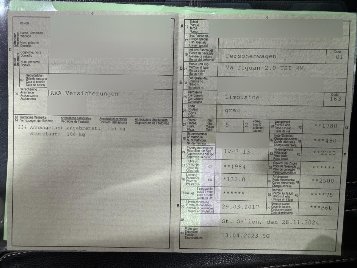 Gurtkontrolle, Wegfahrsperre elektronisch, Warndreieck, Sequentielles 7-Gang-Getriebe DSG mit Automatikfunktion, iPod + USB Anschluss, Blinker in Aussenspiegel, Scheinwerfer-Waschanlage, Elektronische Differentialsperre (EDS), Beleuchtetes Handschuhfach, Ablagefach, Schublade unter Fahrersitz, Airbag: Airbag Beifahrer deaktivierbar, Multifunktionslenkrad mit Schaltwippen, Schublade unter Beifahrersitz, Seitenairbag für Fahrer und Beifahrer, Höhenverstellbare Gurten vorne, Sitze: Fahrersitz höhenverstellbar, Tageskilometerzähler, Servolenkung geschwindigkeitsabhängig, Sitze: Kreuzstützen für Vordersitze verstellbar, Elektronisches Stabilitäts-Programm ESP, Mittelarmlehne vorne, Bremsenergie-Rückgewinnung, Auto-Hold-Funktion, Bluetooth-Schnittstelle mit Freisprecheinrichtung, Seitenschweller Aluminium, ParkPilot, Park Distance Control vorne und hinten, Innenlicht-Abschaltverzögerung, 4 Leichtmetallfelgen 18J mit Pneu, Komfortblinker, Garantie: VW Garantie: 2 Jahre ohne Kilometerbegrenzung (ab 1. Inv.), Elektrische Fensterheber vorne + hinten, Airbag: Airbag Fahrer und Beifahrer, Heckscheibenheizung, Bremsassistent (BAS), Media: Digitaler Radioempfang (DAB/DAB+), Elektronische Parkbremse, Wartungsintervall-Anzeige, Ablagen in den Türen, Make up-Spiegel rechts, Umfeldbeobachtung 'Front-Assist’ mit City-Notbremsfunktion, Sitze: Beifahrersitz höhenverstellbar, Nebelscheinwerfer mit integrierter Abbiegelichtfunktion, 4 Scheibenbremsen, LED-Scheinwerfer mit aktivem Kurvenlicht, Chrom-Paket, Media: Multimediabuchse AUX-IN, Klima: Pollenfilter (Staubfilter), Seitenschutzleisten verchromt, Ladekantenschutz in Kunststoff, Ablagefach im Dachbereich, Media: DAB+ (Digital Audio Broadcasting), Dachreling eloxiert, Ambientepaket, Licht: Fernlichtregulierung Dynamic Light Assist, LED Heckleuchten, dunkelrot, Radiosystem Composition Media, Kennzeichenbeleuchtung in LED, Gurtstraffer vorne, Schalthebelknauf in Leder, Aktive Kopfstützen, Applikationen Chrom, Lackierung: Uni-Lackierung, Allradantrieb permanent, Licht: Drittes Bremslicht, CD-Laufwerk, Assist: Spurhalteassistent Lane Assist, Abgedunkelte Seiten- und Heckscheibe, Stossstangen in Wagenfarbe, Kopfstützen hinten höhenverstellbar, Licht: LED-Tagfahrlicht, Tempomat mit Geschwindigkeitsbegrenzer, 12-Volt-Steckdose hinten, Reifendruck-Kontrollanzeige, Aussenspiegel und Türgriffe in Wagenfarbe, Handschuhfach gekühlt, Pre-Crash-Sicherheitsystem, Wärmeschutzverglasung, Zentralverriegelung mit Fernbedienung, Sitze: Durchlademöglichkeit in der Rücksitzbank, LED Leseleuchten, Wagenheber, Sportsitze vorne, Heckscheiben-Wisch-/Waschanlage mit, Laderaumbeleuchtung, Polster: Velours-Ausstattung, Laderaumabdeckung, Fahrprofilauswahl, Vordersitze beheizbar, Beifahrersitz umklappbar, Multikollisionsbremse, Klapptische an den Rückenlehnen der Vordersitze, Elektronische Differentialsperre (XDS), Katalysator geregelt, Stopp-/Start-System, Knie-Airbag für Fahrer, Licht: Nebelschlussleuchte, Licht: Leuchtweitenregulierung dynamisch, Teppichfussmatten vorne und hinten, Antiblockiersystem (ABS), Assist: Müdigkeitserkennung, Aussentemperaturanzeige, Fussraumbeleuchtung, Airbag: Window-Kopfairbags, Make up-Spiegel links, Scheibenwaschdüsen beheizt, Assist: Automatische Distanzregelung ACC, Getönte Scheiben, Nichtraucherausführung, Active Info-Display, Befestigungsösen im Laderaum, 12 Volt-Steckdose im Laderaum, 12-Volt-Steckdose vorne, Lichtwarnsummer, Kartentaschen an den Rückenlehnen, Lenkrad: Lenkrad längs- und höhenverstellbar, Einstiegsschienen beleuchtet, Warnblinkautomatik bei Vollbremsung, ISOFIX Kindersitzvorrichtung, Komfortsitze, Cupholder vorne und hinten, Aussenspiegel rechts und links beheizbar und elektrisch verstellbar, Bremsbelag-Verschleissanzeige, Drehzahlmesser, Klima: Klimatisierungsautomatik Climatronic, Kühlergrill verchromt, 3-Punkt-Sicherheitsgurte auf allen Plätzen, Assist: Automatische Distanzregelung ACC bis 210 km/h – Umfeldbeobachtung Front-Assist mit City-Notbremsfunktion