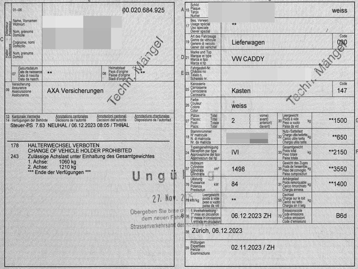 Die (vom Fahrzeugexperten) ermittelten Reparaturkosten beziehen sich auf das versicherte Ereignis. Allfällige zusätzliche, nicht versicherte Schäden/Vorschäden, sind in den Reparaturkosten nicht enthalten. Die deklarierten Ausstattungsmerkmale können von der effektiven Ausstattung abweichen.