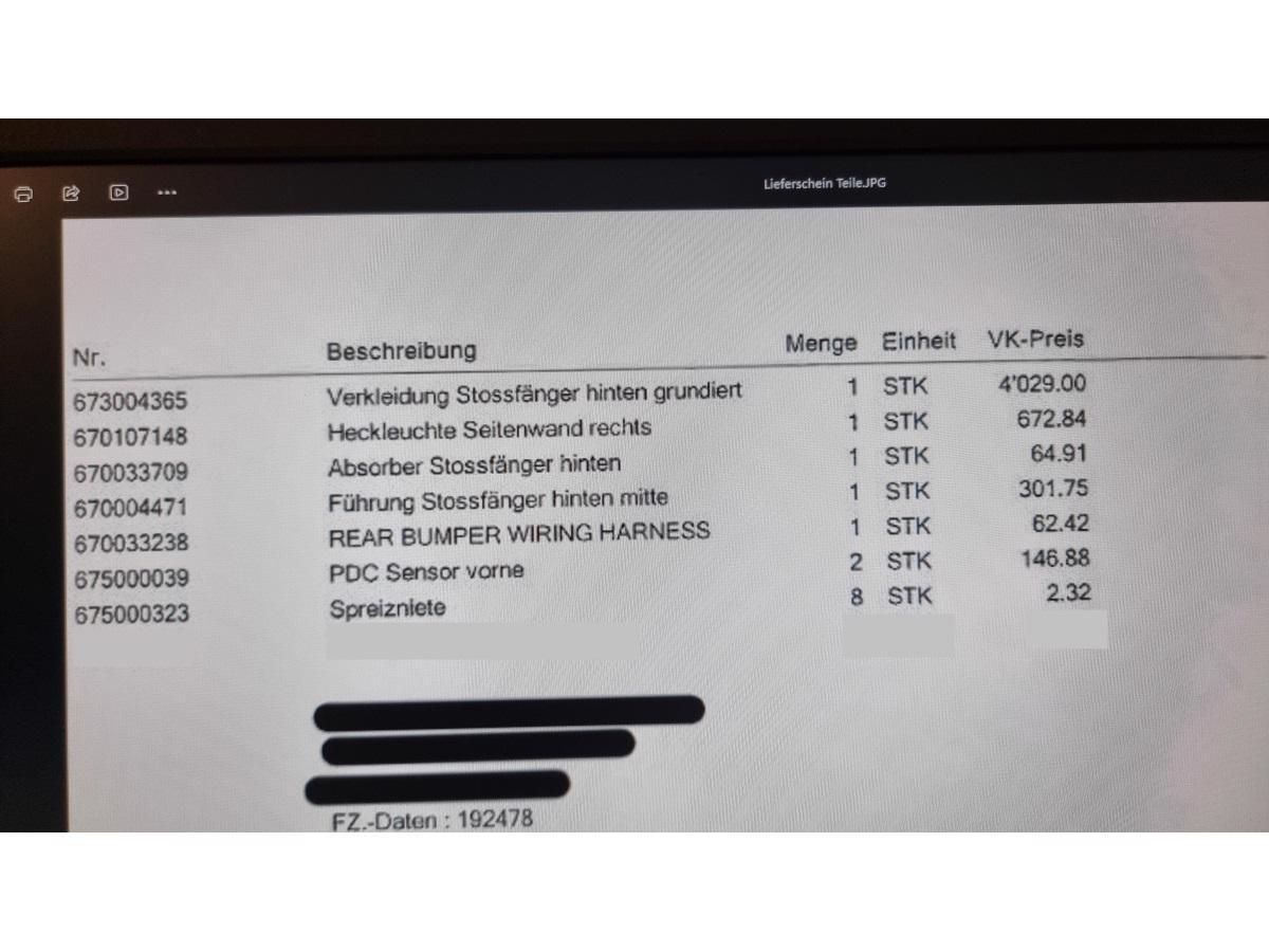 Die (vom Fahrzeugexperten) ermittelten Reparaturkosten beziehen sich auf das versicherte Ereignis. Allfällige zusätzliche, nicht versicherte Schäden/Vorschäden, sind in den Reparaturkosten nicht enthalten. Die deklarierten Ausstattungsmerkmale können von der effektiven Ausstattung abweichen.