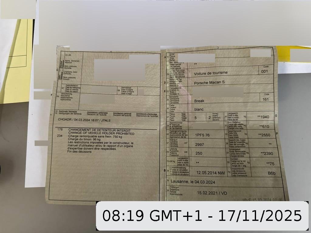 Allradantrieb permanent, Audiosystem CDR Plus, Heckklappe automatisch, Mittelarmlehne hinten, Stoff-/Alcantara-Ausstattung, Steckdose 12V, Cupholder vorne und hinten, Ablagefach im Kofferraum, Airbag: Curtain Airbag, Bremssättel lackiert, Licht: Fahrlichtassistent (automatisches Fahrlicht), Lenkrad: Sportlenkrad, Antiblockiersystem (ABS), Elektronische Parkbremse, Airbag: Airbag Beifahrer deaktivierbar, Heckscheibenheizung, Auspuffanlage mit 2 Endrohren, Bremsassistent (BAS), Sitze: Komfortsitze vorne elektr. verstellbar, Aktivkohlefilter (Geruchsfilter), Zentralverriegelung mit Fernbedienung, Beleuchtetes und abschliessbares Handschuhfach, Nebelscheinwerfer, Licht: Drittes Bremslicht LED, ISOFIX Kindersitzvorrichtung, Ablagen in den Türen, Tempomat mit Geschwindigkeitsbegrenzer, Vorbereitung für Anhängevorrichtung, Auto Start-Stop-Funktion, Elektrische Fensterheber vorne + hinten mit Komfortschliessung, Airbag: Thorax Seitenairbag für Fahrer und Beifahrer, Licht: Nebelschlussleuchte, Mittelkonsole mit Ablagefach, Bremsbelag-Verschleissanzeige, Katalysator geregelt, Assist: Seitenaufprall-Schutzsystem, Lenkrad: Multifunktionslenkrad mit Schaltwippen, Licht: LED-Tagfahrlicht, Licht: LED Heckleuchten, Räder: Reifendruckkontrollsystem ( RDK ), Lackierung: Uni-Lackierung, Multifunktionsanzeige, Lenkrad: Lenkrad längs- und höhenverstellbar, Regensensor für Scheibenwischer vorne, Sitze: Rücksitzlehne geteilt abklappbar, Pollenfilter (Staubfilter), Scheibenwischer vorne mit Intervall, Räder: Reifenreparatur-Set mit Kompressor, Airbag: Airbag Fahrer und Beifahrer, Airbag: Seitenairbags, Sequentielles 7-Gang-Getriebe mit Automatikfunktion, Fahrstabilisierungssystem Porsche – Stability-Management (PSM), Heckscheiben-Wisch-/Waschanlage, Klima: 2-Zonen-Klimaautomatik, Bordcomputer, Gurtstraffer vorne, Wegfahrsperre elektronisch, Einstiegsschienen mit Logo, Wärmeschutzverglasung, Handschuhfach gekühlt, Dachhimmel, Laderaumabdeckung, Aussentemperaturanzeige, Aussenspiegel rechts und links beheizt, elektrisch verstell- / und einklappbar, Höhenverstellbare Gurten vorne, Wartungsintervall-Anzeige, 4 Leichtmetallfelgen 18J mit Pneu, Licht: LED Blink- und Positionsleuchten, Leseleuchten