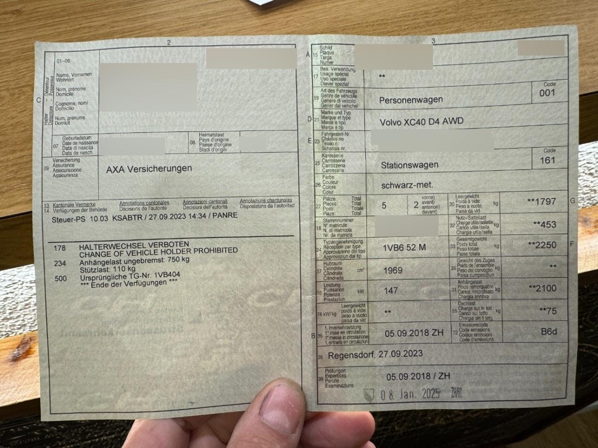 Licht: Nebelschlussleuchte, Ladekantenschutz in Edelstahl, Mittelarmlehne vorne mit Ablagefach, Aussenspiegel in Wagenfarbe, Volvo On Call mit WiFi-Hotspot, Klima: Pollenfilter (Staubfilter), Assist: TPMS Reifendrucküberwachungssystem, LKAS (Lane Keeping Assist System), City Safety automatische Notbremsung bis zu einer Geschwindigkeit von 50 km/h, Sitze: Beifahrersitz höhenverstellbar, Assist: Oncoming Lane Mitigation, Sitze: Komfortsitze, Servolenkung geschwindigkeitsabhängig, Höhenverstellbare Gurten vorne, LED Blinker im Aussenspiegel, Media: Bluetooth Freisprecheinrichtung, Airbag: Knie-Airbag für Fahrer, Frontgrill, Assist: Berganfahrhilfe (Hill Launch Assist), Allradantrieb permanent, Fahrwerk: Dynamisches Fahrwerk, Tempomat mit Geschwindigkeitsbegrenzer, Kindersicherung an den hinteren Türen, Media: USB-Anschluss, Klimaanlage, Textil / T-Tec Ausstattung, Airbag: Airbag Fahrer und Beifahrer, IDIS (Intelligent Driver Information System), Assist: Driver Alert – Aufmerksamkeitswarner, ESC – Fahrdynamikregelung, Elektrische Fensterheber vorne + hinten, Einstiegsschienen vorne, 3-Punkt-Sicherheitsgurte auf allen Plätzen, Gurtkontrolle, Licht: Licht- und Regensensor, Dekoreinlagen, Colorverglasung, CZIP (Clean Zone Interior Package), Aussenspiegel rechts und links beheizbar und elektrisch verstellbar, Dekor: Dekoreinlagen Aluminium, Lenkrad: Lenkrad längs- und höhenverstellbar, Warndreieck, Erste Hilfe Kasten, Lenkrad und Schalthebelgriff in Leder, Anhänger Stabilisierungkontrolle TSA, Mittelarmlehne hinten mit 2 Getränkehaltern, Verkehrsschilder-Erkennung RSA (Road Sign Assist), Sitze: Elektrisch einstellbare Lendenwirbelstütze für Vordersitze, Licht: Drittes Bremslicht, Wegfahrsperre elektronisch, Federung zur Wankstabilisierung, Partikelfilter und Oxydationskatalysator, Lenkrad: Lederlenkrad mit Dekoreinlagen, ISOFIX-Befestigungspunkte für Kindersitz an den äusseren Rücksitzen, Keyless Start, Airbag: Seitenairbags für Fahrer und Beifahrer, Heckscheibenheizung, Assist: Road Edge Detection – System zum Schutz vor unbeabsichtigtem Verlassen der Fahrbahn durch Lenk- und Bremseingriffe, Verzurrösen, Elektronische Differentialsperre, Textilfussmatten, Sitze: Rücksitzlehne geteilt abklappbar, Räder: Reifenreparatur-Set mit Kompressor, Licht: LED Scheinwerfer mit Fernlichtassistent und integriertem LED-Tagfahrlicht, ABS, EBD elektronische Bremskraftverteilung, Zentralverriegelung mit Fernbedienung und automatischer Türverriegelung, Assist: Einparkhilfe hinten, Aussentemperaturanzeige, Leichtmetallräder im 5-Speichen-Design 18J, Bordcomputer, Lenkrad: Multifunktionslenkrad, Stop/Start-Technologie, Licht: Adaptives Bremslicht, Media: Audiosystem High Performance, Innenraumbeleuchtung, Assist: Bremsassistent (BAS), Automatische Parkbremse, Dachreling Alu-Look, Getriebe: 8-Stufen-Automat sequentiell, Getönte Scheiben, Airbag: Airbag Beifahrer deaktivierbar, Beide Make up-Spiegel beleuchtet, Lenkrad: Sicherheitslenksäule, Media: Dachantenne, Digitale Instrumentierung 12,3”, Airbag: Kopf -/ Schulterairbag, Sitze: Durchlademöglichkeit in der Rücksitzbank, Sitze: Fahrersitz höhenverstellbar, Media: 8 Lautsprecher, Gurtstraffer mit Gurtkraftbegrenzer, Komfortschliessanlage mit Funk-Fernbedienung, Media: Infotainment System Sensus Connect mit High Performance Sound, Steckdose 12V, Dachspoiler, Gurtstraffer vorne und hinten, Schleudertrauma-Schutzsystem (Backguard)
