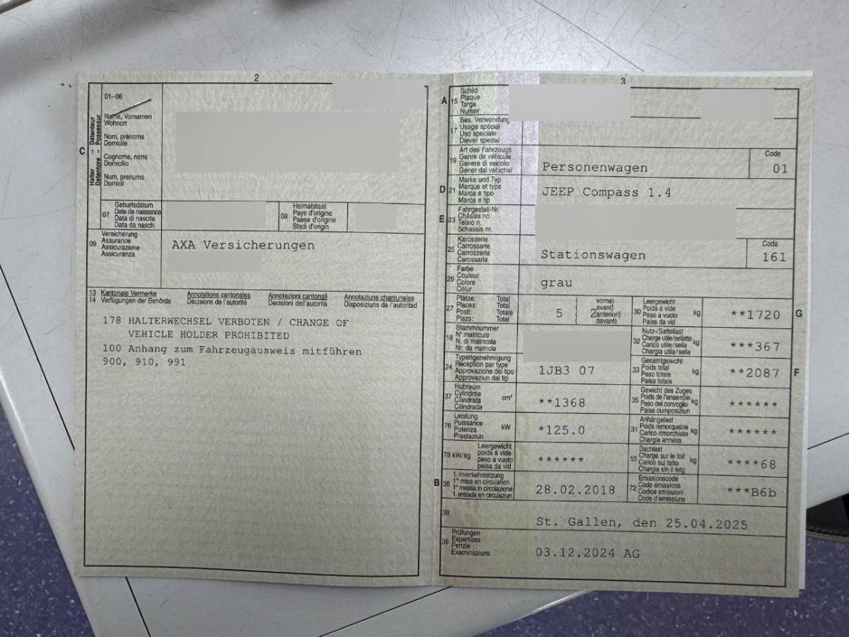 Klima: 2-Zonen-Klimaautomatik, Assist: Spurhalteassistent Lane Assist, Licht: Adaptives Bremslicht, Airbag: Airbag Beifahrer deaktivierbar, Pollenfilter (Staubfilter), Sitze: Mittelarmlehne vorne, Sitze: Beifahrerlehne umklappbar, Dachreling silber, Regensensor für Scheibenwischer vorne, Drehzahlmesser, Lenkrad: Lenkrad längs- und höhenverstellbar, Steckdose 220/230V, LED Scheinwerfer mit LED-Signatur, Cupholder vorne, Polster: Stoff Schwarz mit grauen Ziernähten, Sitze: 3 Kopfstützen hinten, Assist: Berganfahrhilfe – Hill Start Assist, Elektrische Fensterheber vorne + hinten, Raucherpaket, Licht: Ambiente Beleuchtung LED, Räder: Reifenreparatur-Set (Tire Fit), Abgedunkelte Seiten- und Heckscheibe, Elektronisches Stabilitäts-Programm (ESP) mit Anhängerstabilisierung, Innenspiegel automatisch abblendbar, Katalysator geregelt, Aussenspiegel in Wagenfarbe, Überrollschutzsystem, Steckdose 12V, Licht: Drittes Bremslicht, Lackierung: Uni-Lackierung, Fahrer-Informationssystem mit Farbdisplay, Lenkrad: Multifunktionslenkrad, Verzurrösen, Airbag: Seitenairbag für Fahrer und Beifahrer, Start/Stop-Funktion, ISOFIX Kindersitzvorrichtung, Diebstahlwarnanlage, Elektronische Parkbremse, Servolenkung, Heckscheibenheizung, Antiblockiersystem (ABS), Türgriffe in Wagenfarbe, Licht: Nebelscheinwerfer mit Abbiegelicht, Räder: Reifendruck-Kontrollanzeige, Fahrersitz höhenverstellbar, Airbag: Airbag Fahrer und Beifahrer, Sitze: Rücksitzlehne geteilt abklappbar, Allradantrieb permanent, Assist: Parksensoren hinten, Licht: Nebelschlussleuchte, Assist: Auffahrwarnsystem, Licht: LED Heckleuchten, Gummifussmatten vorne und hinten, Assist: Tempomat mit Geschwindigkeitsbegrenzer, Airbag: Window-Kopfairbags, Sitze: Fahrersitz manuell einstellbar, Zentralverriegelung mit Fernbedienung, Höhenverstellbare Gurten vorne, Sitze: Kreuzstütze für Fahrersitz elektrisch verstellbar, Räder: 4 Leichtmetallfelgen 18J mit Pneu 225/55R18, 3-Punkt-Sicherheitsgurte auf allen Plätzen, Keyless Entry, Getriebe: 9-Stufen-Automat sequentiell, Lenkrad und Schalthebelgriff in Leder, Uconnect Touchscreenradio mit 7” Bildschirm, USB, AUX-IN, Bluetooth Audiostreeming, DAB+, 6 Lautsprecher, 12 Volt-Steckdose im Laderaum, Getönte Scheiben, Bremsassistent (BAS), Antriebsschlupfregelung (ASR), Aussenspiegel rechts und links beheizt, elektrisch verstell- / und einklappbar