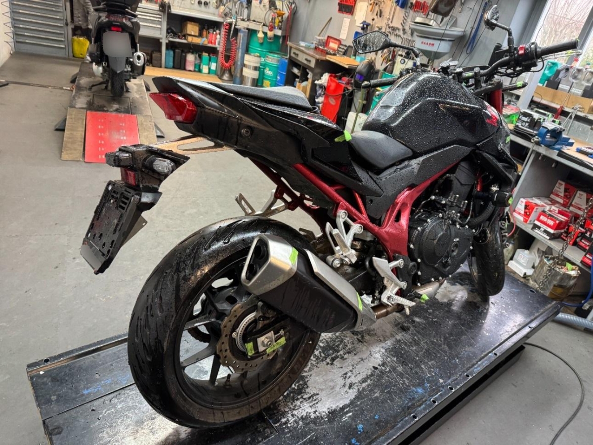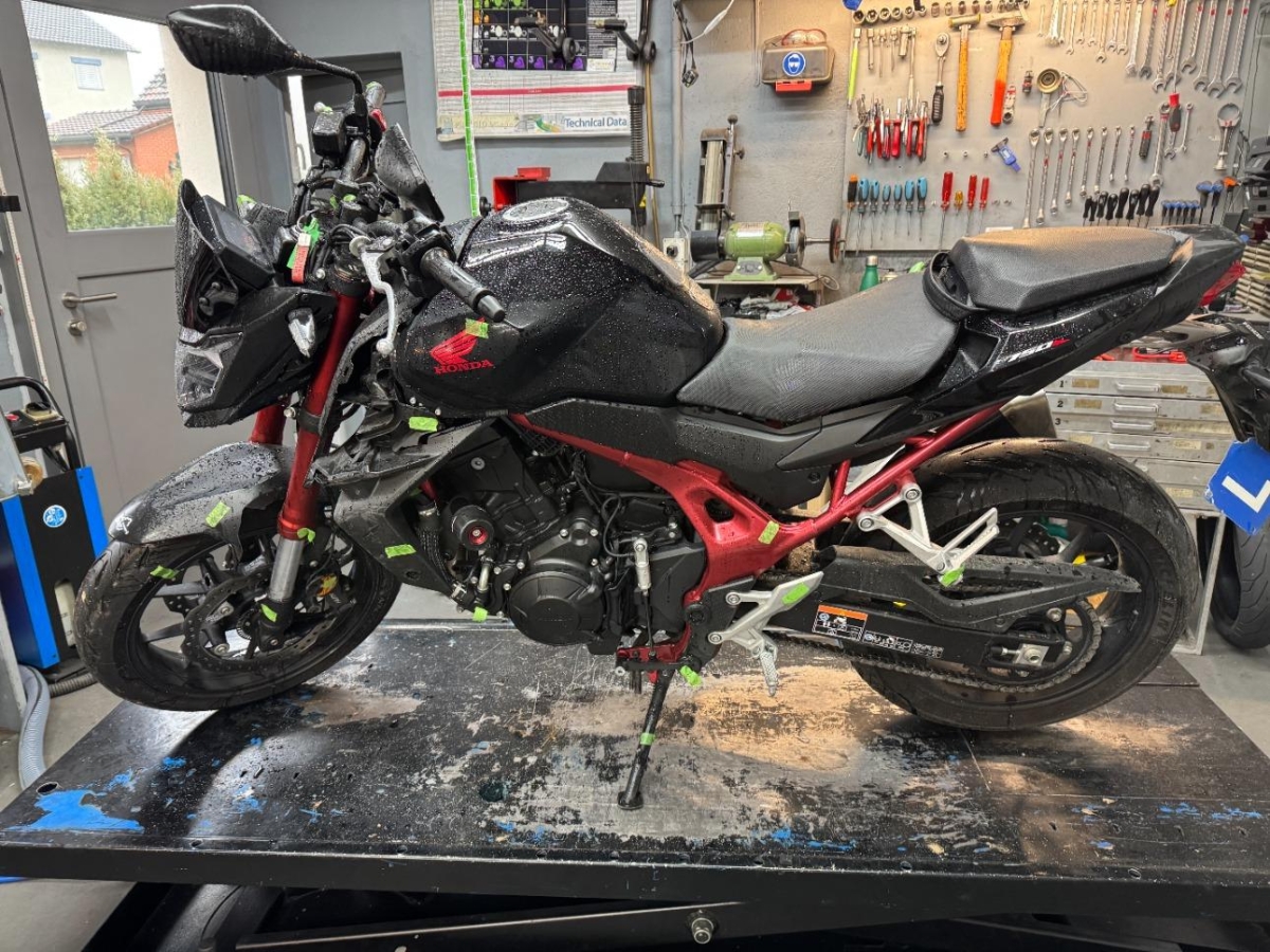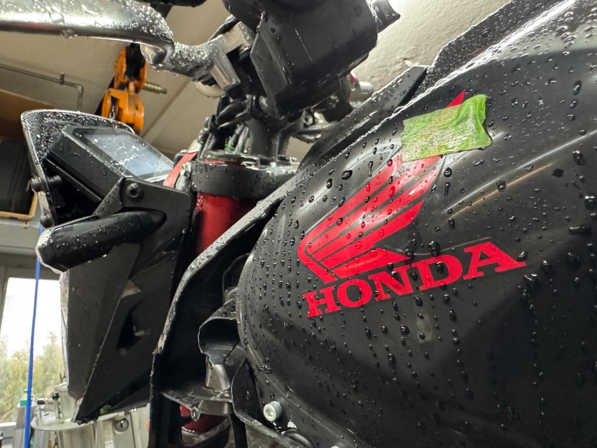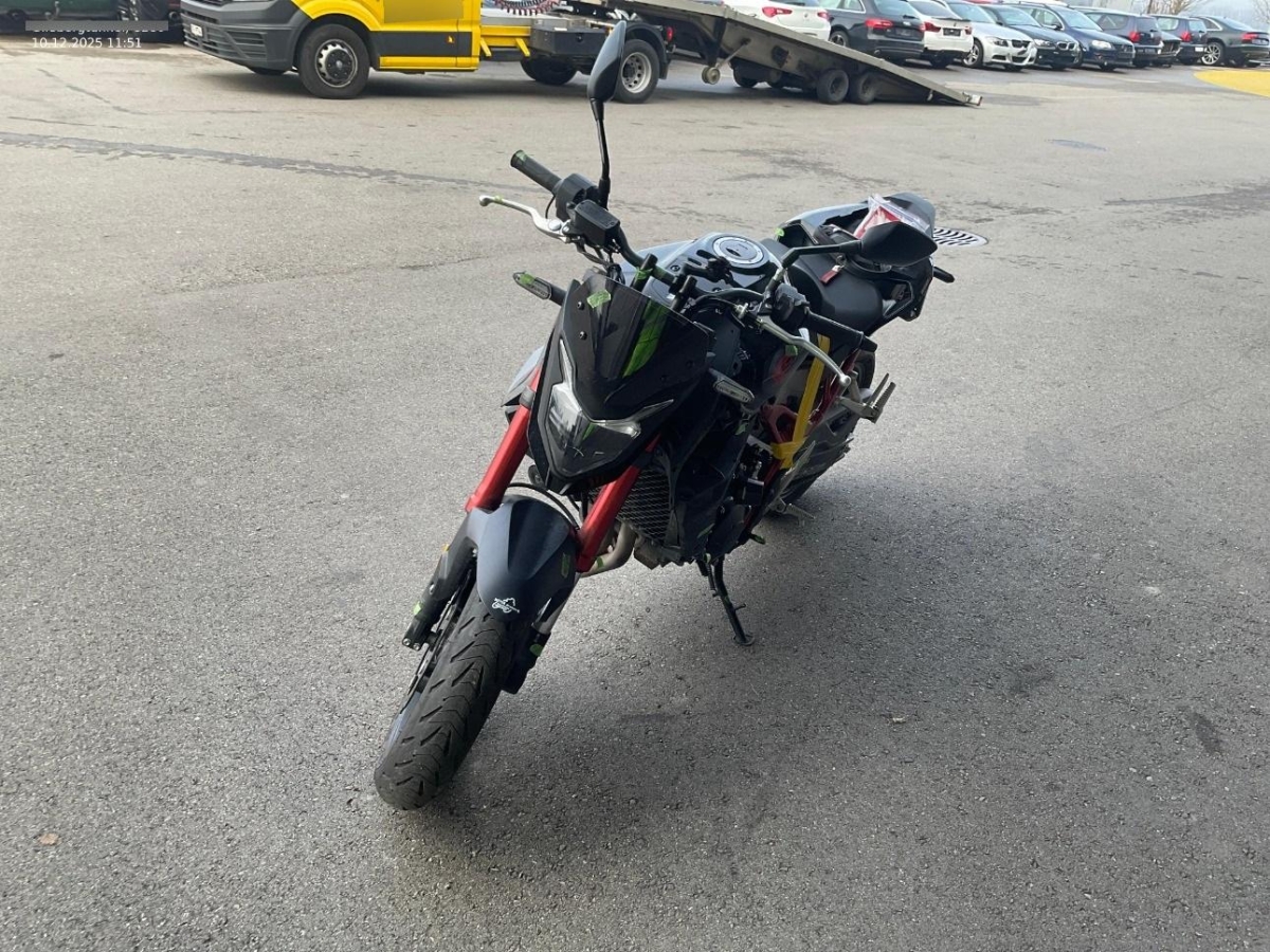 Auspufftopf, Aussenspiegel links, Aussenspiegel rechts, Diverse Anbauteile, Front, Fussraster links, Fussraster rechts, Gabelholm, Griff links, Griff rechts, Heckverkleidung, Kühler, Lenker, Rad vorne, Schutzblech vorne, Schwinge, Tank, Verschalungen links, Verschalungen rechts, Verschalungen vorne