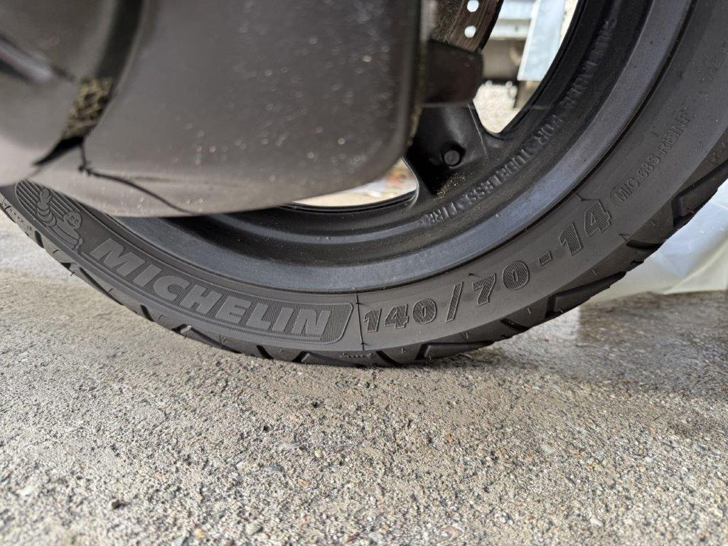 Antrieb, Auspufftopf, Fussraster links, Kupplungsgehäuse, Motor, Rad hinten, Rücklicht, Schutzblech hinten, Schwinge, Sitz, Tank, Verschalungen hinten