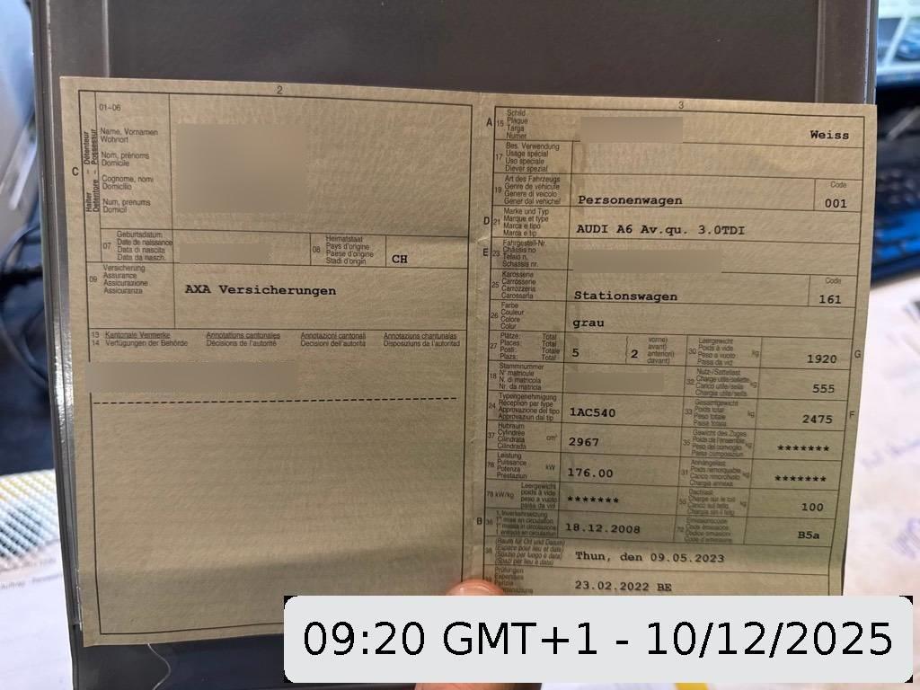 Sitze: Vordersitze heizbar, Aschenbecher und Zigarettenanzünder, Ladesicherungsnetz zum Gepäckraum, Aktive Kopfstützen, Radiovorbereitung, Scheibenantenne, Ent- störung und 8 LS, Leuchtweitenregulierung elektrisch, Aussenspiegel rechts und links beheizt und elektrisch verstellbar, asphärisch gewölbtes Spiegelglas, Fahrer-Informationssystem, Schienensystem im Laderaum mit variablen Verzurrösen, Nebelscheinwerfer, Licht: Nebelschlussleuchte, Zentralverriegelung mit Fernbedienung, Rücksitzlehne geteilt abklappbar, Klima: Pollenfilter (Staubfilter), Teppichfussmatten vorne und hinten, Heckscheibenheizung, Seitenairbag für Fahrer und Beifahrer, Alu-Räder 7,5Jx17 im 7-Arm-Design, Doppelter Ladeboden mit darunter liegender Schmutzwanne, Gurtstraffer vorne, Seitenaufprall-Schutzsystem, Assist: Bremsassistent (BAS), Automatikgurt in Fondmitte, Airbag: Airbag Fahrer und Beifahrer, Radio/CD-Player, 3 Kopfstützen hinten, Mittelarmlehne hinten, Servotronic, Schalthebelknauf in Leder, Bremsbelag-Verschleissanzeige, Drehzahlmesser, Lenkrad: Lenkrad längs- und höhenverstellbar, Tempomat, Türgriffe aussen in Wagenfarbe, Scheinwerfer-Waschanlage, Antiblockiersystem (ABS), Elektronische Differentialsperre (EDS), Lichtwarnsummer, Tageskilometerzähler, Licht: Tagfahrlicht, Lichtsensor, Elektronisches Stabilitäts-Programm (ESP), Klima: Klimatisierungsautomatik, Laderaumabdeckung, Stossstangen und Aussenspiegel in Wagenfarbe, Reserverad analog Felgen/Reifen Variante, Getönte Scheiben, Diebstahlwarnanlage mit Innenraum- überwachung, Aluminium-Applikationen, Ausstiegsleuchten in den Türen vorn, Digital Uhr, Zweiklanghorn, Antriebsschlupfregelung (ASR), Kühlergrill verchromt, Sitze: Vordersitze höhenverstellbar, Lackierung: Uni-Lackierung, Airbag: Window-Kopfairbags, Fahrwerk: Dynamisches Fahrwerk, Brillenablage, Leseleuchten vorne, Regensensor für Scheibenwischer vorne, MMI basic, 3-Punkt-Sicherheitsgurte auf allen Plätzen, Garantie: 2 Jahre ohne Kilometerbegrenzung (ab 1. Inv.) mit ASSP+ – Audi Swiss Service Package Plus – 3 Jahre bzw. 100’000 km Reparaturen kostenlos: Service kostenlos bis 100’000km, max. 10 Jahre (ab 1. Inv.), Heckscheiben-Wisch-/Waschanlage mit, Fensterschachtzierleisten in Aluminium, Abblendlichtausschaltverzögerung 'Follow me home’, Dachreling blank, Innenlicht-Abschaltverzögerung, Wartungsintervall-Anzeige, Leseleuchten hinten, Wassertemperaturanzeige, Elektronische Parkbremse, Autobahnblinkfunktion, Aussentemperaturanzeige, Partikelfilter und Oxydationskatalysator, Polster: Stoff-Ausstattung, Durchladesystem inkl.Skisack, Beleuchtetes Handschuhfach, Mittelarmlehne vorn in Kunstleder schwarz mit Kontrastnaht in Rot, Scheibenwaschdüsen beheizt, Allradantrieb permanent, Elektrische Fensterheber vorne + hinten, Scheibenwischer vorne mit Intervall, Beide Make up-Spiegel beleuchtet, Wegfahrsperre elektronisch, Cupholder vorne, Steckdose im Kofferraum, 6-Stufen-Automat Tiptronic, Lederlenkrad, Licht: Drittes Bremslicht, Höhenverstellbare Gurten vorne, Kraftstofftank 80 Liter