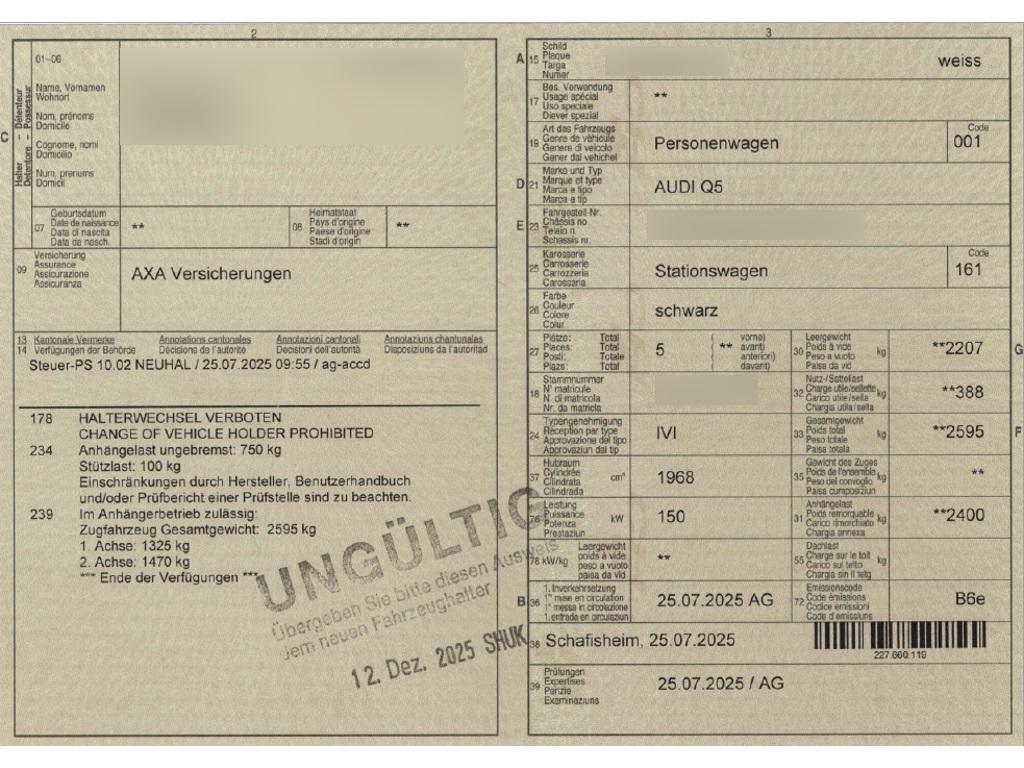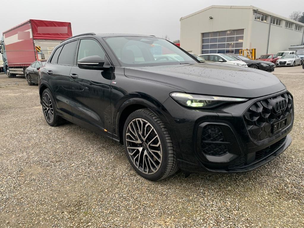 Paket: edition one mit Akzenten schwarz (Dachreling in Schwarz, Aussenspiegelgehäuse in Schwarz, Räder: Räder Audi Sport, 5-Arm-Split, schwarz metallic, glanzgedreht – 8,5 J x 21, Reifen 255/40 R21, Launchmodell, Paket: Exterieur S line, Endrohrblenden verchromt dunkel, Fensterzierleisten und Anbauteile dunkel mit Audi Ringen vorn und hinten in Anthrazitgrau, Lackierung: Kontrastlackierung Mythosschwarz Metallic), Paket: Exterieur S line (S line, Einleger in Chromoptik matt anthrazit, Räder: Räder, 5-Doppelspeichen – 8,0 J x 19, Reifen 235/55 R19, Stossfänger S line, Wabengitter in Schwarz matt, Lackierung: Volllackierung, Kühlerschutzgitter in Phantomschwarz, Licht: Projektionslicht Heckscheibe, Aufsatzleiste Schweller in Chromoptik matt anthrazit, Einleger der Lufteinlässe in Chromoptik matt anthrazit, Rahmen und Einleger im Kühlerschutzgitter in Chromoptik matt anthrazit), Paket: Paket Premium Experience Q5 (Sitze: Vordersitze elektrisch verstellbar, Sitze: Fahrersitz und Aussenspiegel mit Memoryfunktion, Media: LTE-Unterstützung für Audi phone box, Paket: MMI experience pro, Digitaler Schlüssel, Media: Audi Phone Box), Paket: MMI experience pro (Head-Up Display, Media: MMI experience pro, Media: Bang & Olufsen Premium Soundsystem mit 3D Klang, Media: USB-Schnittstellen mit erhöhter Ladeleistung), Paket: Tech pro (Paket: Komfortpaket plus, Licht: Digitale Lichtsignaturen, Assist: Proaktiver Insassenschutz Front, Seite und Heck, Licht: Digitale OLED-Heckleuchten, Media: MMI Beifahrerdisplay, Aussenspiegel elektrisch einstell-, beheiz- und anklappbar, beidseitig automatisch abblendend, Assist: Spurverlassenswarnung inkl. Notfallassistent, Scheinwerfer-Reinigungsanlage, Licht: Projektionsleuchte in den Aussenspiegeln, Licht: Matrix LED-Scheinwerfer, Licht: LED-Scheinwerfer plus, Assist: Einparkhilfe plus mit Distanzanzeige, Assist: Parkassistent plus, Insassenerkennung im Fond, Paket: Assistenzpaket Schutz- und Warnsysteme plus, Assist: Umgebungskameras, Innenspiegel automatisch abblendbar, Airbag: Seitenairbag vorn und hinten, mit Kopfairbag und Interaktionsairbag vorn, Lenkrad: Lenkradheizung, Paket: Klimatisierungspaket, Lenkrad: Lenkradeinstellung elektrisch, Garagentoröffner, Sitze: Sitzheizung vorne und hinten, Klima: 3-Zonen-Klimatisierungsautomatik, Paket: Assistenzpaket Fahren und Parken plus, Assist: Adaptiver Geschwindigkeitsassistent, Assist: Spurwechsel- und Ausstiegswarnung, Querverkehrassistent hinten und Abbiegeassistent hinten), Paket: Interieur S mit Sportsitzen, Mikrofaser Dinamica/Leder-Kombination schwarz (Dekor: Akzentflächen und Bedientasten schwarz glänzend, Sitze: Kopfstützen vorn, Dekor: Interieurelemente oben und unten Mikrofaser Dinamica, Lenkrad: Sportlederlenkrad, 3-Speichen, oben und unten abgeflacht mit Multifunktion und Schaltwippen, Pedalerie und Fussstütze in Edelstahl, Polster: Mikrofaser Dinamica/Leder-Kombination mit Rautensteppung und S-Prägung, Dekor: Instrumententafel-Oberseite schwarz mit Kontrastnaht, Sitze: 4-Wege-Lendenwirbelstütze für die Vordersitze, Sitze: Sportsitze vorne, Interieurausstattung 13, Dachhimmel in Stoff schwarz, Einstiegsleisten mit Aluminiumeinlagen, vorne, beleuchtet, mit S-Schriftzug, Komfortmittelarmlehne vorne, Lenkrad: Lenkradapplikation Chromoptik, S-Emblem, Lenkradgriffe perforiertes Leder und Kontrastnaht), Paket: Tech (Licht: Fernlicht-Assistent, Licht: LED-Heckleuchten pro, Fond-Hinweis, Assist: Spurverlassenswarnung, Paket: Komfortpaket, Paket: Assistenzpaket Fahren und Parken, Lenkrad: Lenkradeinstellung manuell, Sitze: Vordersitze heizbar, Airbag: Seitenairbags vorn, mit Kopfairbag und Interaktionsairbag vorn, Assist: Rückfahrkamera), Lackierung: Metallic-Lackierung, Anhängevorrichtung, Fahrwerk: Adaptive air suspension, Akustikverglasung für Türscheiben vorn, Panorama-Glasdach, Räder: Räder Audi Sport, Vielspeichen-S, schwarz metallic, glanzgedreht – 8,5 J x 21, Reifen 255/40 R21, Sonnenschutzverglasung, abgedunkelt