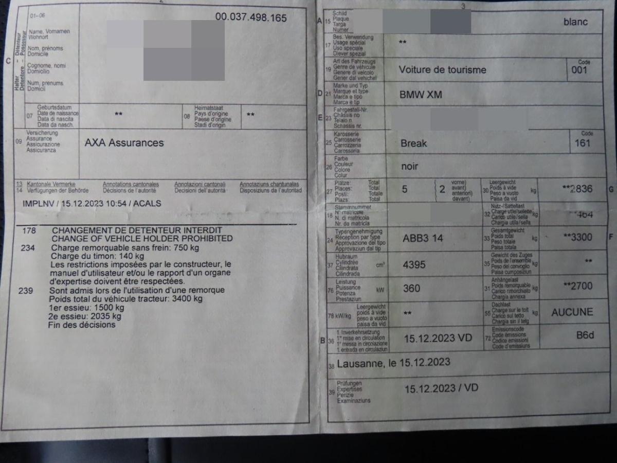Bremsbelagverschleisssensoren vorne und hinten, Paket: M Aerodynamicpaket, Licht: Innenbeleuchtung beinhaltet: – Leselicht vorne (Fahrer/Beifahrer) – Leselicht hinten (mittig) – Make-Up-Spiegel-Leuchten (Fahrer/Beifahrer) – Handschuhkasten innen – Türausstiegsleuchte vorne (links / rechts) – Fußraumleuchte vorne (links / rechts) – Gepäckraum Lichtband (links / rechts), Ladekabel (Mode 3) für öffentliches Laden – AC-Laden an öffentlichen Ladesäulen für Typ2-Märkte – 11 kW (3-phasig) – Kabellänge: 5m – Aufbewahrung in Tasche im Gepäckraum, Bremsscheiben hinten, innenbelüftet, Licht: LED-Scheinwerfer – adaptiver LED-Scheinwerfer – Abblendlicht (LED-Matrix Technologie) – Fernlicht (LED-Matrix Technologie) – Tagfahrlicht und Fahrtrichtungsanzeiger (in separater Leuchteneinheit) – Leuchtweitenregulierung (automatische Anpassung an die Fahrsituation über vertikalen Schwenkmechanismus und Zu-/Abschalten von LED-Segmenten) – Automatisches Abbiegelicht (Cornering Light) – Standlicht – Heckleuchten – alle Außenleuchten in LED Technologie, Sonnenblenden mit Make-Up-Spiegel beleuchtet, M Sportbremse, schwarz hochglänzend Schwarz hochglänzend lackierte Bremssättel mit M-Schriftzug, Paket: Erweitertes Außenspiegelpaket – elektrisch einstellbar und beheizt, asphärisch – mit elektrischer Anklappfunktion – Bordsteinautomatik – Abblendfunktion Fahrerseite, Klima: Nanofilter, BMW ID Mit der BMW ID wird der Fahrer auf dem Display persönlich begrüßt und alle personalisierten Funktionen stehen zur Verfügung. Bei Verknüpfung der BMW ID mit dem Schlüssel wird die BMW ID bereits mit Entriegelung automatisch aktiviert. Die BMW ID ermöglicht es personalisierte Einstellungen zu speichern und auf andere BMW Fahrzeuge zu übertragen. Für Fahrer im Gastprofil sind Funktionen, die persönliche Daten verarbeiten, nicht verfügbar., Fahrwerk: M Sportdifferential – Verbesserung von Traktion, Agilität, Stabilität sowie Fahrverhalten – Komfort durch harmonisches Übergangsverhalten bei impulsiven Lenkimpulsen – Systemseitige Einstellung des Sperrgrad (Hinterachse), je nach Fahrsituation und Fahrbahnbeschaffenheit zwischen 0 und 100 %, BMW Gestiksteuerung – Spezifisch festgelegte Funktionen können im Erkennungsbereich oberhalb der vorderen Mittelkonsole durch Gestik per Hand gesteuert werden., M Sicherheitsgurte – beinhaltet Sicherheitsgurte schwarz mit Farbcodierung in M Farben für erste und zweite Sitzreihe, Fensterheber, elektrisch – Einklemmschutz und Komfortöffnung/-schließung, Airbag: Frontairbagsystem für Fahrer und Beifahrer, Einstiegsleisten beleuchtet mit Schriftzug, Klima: Klimatisierungsautomatik 4- Zonen – Temperaturregelung für Fahrer, Einstellung von Luftmenge und Luftverteilung Automatikprogramm mit 5 Intensitätsstufen für Fahrer, Beifahrer und Fondpassagiere getrennt – Automatikprogramm mit 5 Intensitätsstufen – Einstellung der Temperaturschichtung für Fahrer und Beifahrer getrennt über MMI – Klimabedienteil vorn mit Vollfarbdisplay – separates Klimabedienfeld für Fondpassagiere in der Mittelkonsole hinten – SYNC-Funktion, Media: DAB+ Tuner, Assist: Akustischer Fussgängerschutz – Künstlich generierter Sound beim elektrischen Fahren zum Schutz anderer Verkehrsteilnehmer (akustische Wahrnehmung). Beim Neu-Start immer aktiv (Default On)., Getränkehalter, temperiert – Getränkehalter beheizt und gekühlt in der Mittelkonsole – Einzeln aktivierbar über Tasten (links und rechts) – Klimafunktion dargestellt über Ambiente Beleuchtung (Blau und Rot), Media: BMW Live Cockpit Professional – rahmenloses Curved Display mit 12,3” Instrumentendisplay und 14,9″ Touch-Display – Augmented View im Touch-Display – Einstellungen in Fahrerprofilen speicherbar, Lenkrad: Schaltwippen am Lenkrad, BMW Niere Iconic Glow – Optisches Exterieur-Highlight: Inszenierung der BMW Niere durch innovative LED-Fasertechnologie, Komfortzugang Beinhaltet folgende Funktionen: – Schlüsselloser Zugang zum Fahrzeug – Welcome Inszenierung bei Annäherung ans Fahrzeug – Automatische Entriegelung bei Annäherung ans Fahrzeug – Automatische Verriegelung beim Entfernen vom Fahrzeug – Berührungsloses Öffnen und Schliessen der Heckklappe Beinhaltet den BMW Digital Key mit folgenden Funktionen: – Ver- und Entriegeln sowie Starten des Fahrzeugs unter Verwendung eines kompatiblen Smartphon., 3-Punkt-Sicherheitsgurte auf allen Plätzen, Bremsscheiben vorne, innenbelüftet, Fussmatten in Velours, Sitze: M Multifunktionssitze für Fahrer und Beifahrer Beinhaltet: – für Fahrer und Beifahrer – beinhaltet die Funktionen der Sitzverstellung, elektrisch mit Memory (Memoryfunktion auch für Beifahrersitz) und Lordosenstütze für Fahrer und Beifahrer – elektrische Einstellung für oberes Lehnensegment, Lehnenbreite und Oberschenkelauflage – platzierte Perforation inklusive XM spezifischem Nahtbild – beleuchtetes M Logo auf der Kopfstütze, Airbag: Kopfairbag 1. und 2. Sitzreihe, Intelligenter Notruf, Teleservices, Assist: Dynamische Stabilitäts Control (DSC) mit erweiterten Umfängen, Condition Based Service, Licht: Heimleuchten, Türen: Soft-Close-Automatik für Türen – Ermöglicht ein bequemes und sicheres Schliessen der Türen ohne viel Kraftaufwand und störende Zuschlaggeräusche. Versehentlich nicht richtig geschlossene Türen werden automatisch zugezogen., Lackierung: Metallic-Lackierung, Assist: Geschwindigkeitsregelung mit Bremsfunktion, Fahrwerk: M xDrive, Assist: Speed Limiter, Dekor: M Interieurleisten Carbon Fibre, Licht: Fernlicht-Assistent – Automatisches Ein- und Ausschalten des Fernlichtes abhängig von der Verkehrssituation – Steuerung über Sensor an der Vorderseite des Innenspiegels, Sonnenschutzverglasung Reduziert bei Sonneneinstrahlung die Aufheizung des Fahrzeuginnenraums. Stärker eingefärbte Verglasung im hinteren Fahrzeugbereich bewirkt eine stärkere Absorption des Sonnenli