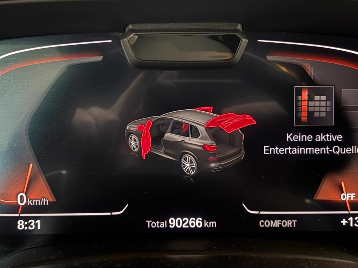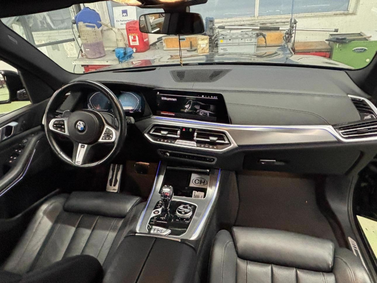 Sitze: Sitzheizung vorne und hinten, Klima: Klimatisierungsautomatik 4- Zonen, Active Protection Sicherheitspaket zur Einleitung von Schutzmassnahmen für die Insassen in drohenden Unfallsituationen: – Reversible Gurtstraffung – Automatisches Schliessen der Fenster bis auf einen Spalt – Ausstattungsabhängig Schliessen des Panoramadaches, Akustikverglasung – Verwendung von verstärkten Verbundglasscheiben für die Seitenscheiben – Verstärkung der Frontscheibe von 4,5 mm auf 5 mm – Gesteigerter Fahrkomfort durch Reduzierung der Aussengeräusche, Anhängerkupplung – Betätigungsschalter im Gepäckraum. Elektronisch einschwenkbare Anhängerkupplung. Kann vollständig unter die Heckschürze eingeschwenkt werden. Inklusive Anhänger-Stabilisierungskontrolle., Assist: Driving Assistant Professional, Assist: Parking Assistant Plus, BMW Display Key Schlüssel-Masse: ca. 90×55×15 mm Funktionsumfänge: – LCD-Farbdisplay inkl. Touchbedienfeld – Anzeigemöglichkeit von Fahrzeug-Statusinformationen (z. B. Reichweite, Service-Hinweise, Fahrzeug-Verriegelung etc.) – Regulation der Temperatur im Fahrzeuginneren – Bedienmöglichkeit der Standheizung (in Verbindung mit SA 536 Standheizung) – Höhenverstellung des Fahrzeuges von aussen – Kabelloses Laden des Schlüssels – Zusätzliches USB-Ladekabel – Funktionelle Reichweite: 300 m, BMW Garantie: BMW Gewährleistungsverlängerung – 4 Jahre/200000 km (es gilt das zuerst Erreichte), BMW Gestiksteuerung – Spezifisch festgelegte Funktionen können im Erkennungsbereich oberhalb der vorderen Mittelkonsole durch Gestik per Hand gesteuert werden., BMW Head-Up Display – Vollfarbige Projektion fahrrelevanter und situationsspezifischer Informationen auf die Windschutzscheibe., Dekor: BMW Individual Instrumententafel lederbezogen – Instrumententafel oben und Türbrüstungen in Leder Walknappa Schwarz mit Nahtbild – Instrumententafel unten in Weltfarbe, Dekor: Glasapplikation CraftedClarity für Interieurelemente Handgefertigte geschliffene Kristall-Glaselemente: – Wählhebel mit beleuchtetem «X» Symbol – iDrive Controller – Start Stopp Knopf, Integrierte Universal Fernbedienung – Zur Fernsteuerung von elektrischen Toren, Lackierung: Metallic-Lackierung, M Hochglanz Shadow Line mit erweiterten Umfängen Ausstattungsumfänge in Schwarz Hochglanz: – Nierenrahmen – Nierenstäbe – Air Breather – Endohrblenden, M Sportabgasanlage X5 M spezifische Abgasanlage, Panorama-Glasdach, Räder: 22" M Leichtmetallräder Doppelspeiche 742 M Bicolor Jet Black, glanzgedreht, mit Mischbereifung Vorn: 9,5 J×22/Bereifung 275/35 R 22 Hinten: 10,5 J×22/Bereifung 315/30 R 22, Sonnenschutzverglasung – Stärker eingefärbte Verglasung ab der B-Säule im hinteren Fahrzeugbereich, Travel & Comfort System – 2×USB Typ C, Laden mit 3 A in der Rückenlehne der 1. Sitzreihe – 2×Vorbereitungen Multifunktionshalter in der Rückenlehne der 1. Sitzreihe, Türen: Soft-Close-Automatik für Türen – Ermöglicht ein bequemes und sicheres Schliessen der Türen ohne viel Kraftaufwand und störende Zuschlaggeräusche. Versehentlich nicht richtig geschlossene Türen werden automatisch zugezogen.
