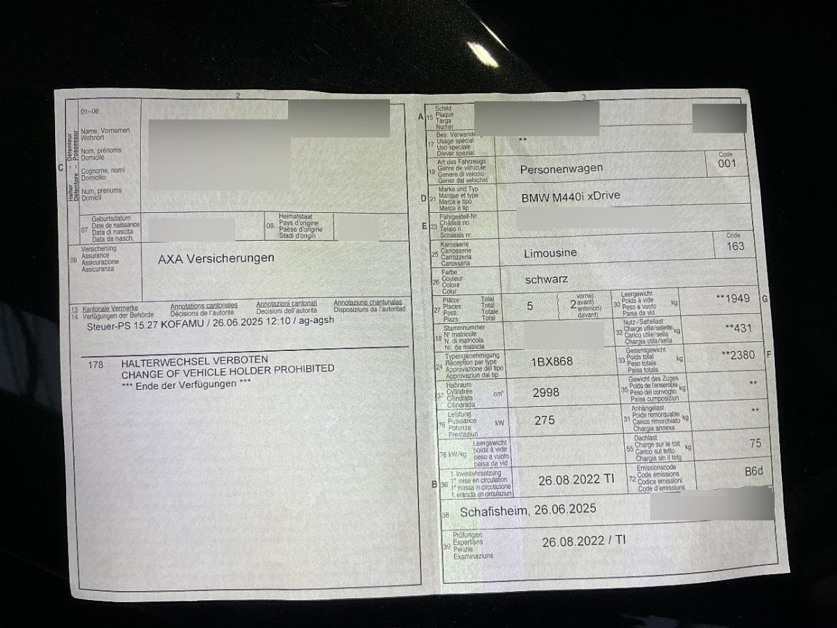 Lenkrad: Lenkrad längs- und höhenverstellbar, Licht: Heimleuchten, Start/Stop-Funktion, Mittelkonsole, hinten, Klima: 3-Zonen-Klimaautomatik mit erweiterten Umfängen, Active Guard Plus – Spurverlassenswarnung mit aktiver Rückführung (ab ca. 70 km/h) – Auffahr- und Personenwarnung mit City-Bremsfunktion – Speed Limit Info mit manuellem Speed Limit Assist, Dynamische Stabilitäts Control (DSC) mit erweiterten Umfängen, Airbag: Seitenairbag für Fahrer und Beifahrer, Media: HiFi Lautsprechersystem – HiFi-Lautsprechersystem, digitaler Verstärker, 205 W Verstärkerleistung – 10 Lautsprecher: – 1 Mitteltöner in der Armaturentafel – 3 Hochtöner in den Spiegeldreiecken und der Instrumententafel – 4 Mitteltöner in den Türverkleidungen vorne und hinten – 2 Zentralbässe unter den Vordersitzen, Teleservices, Steckdose 12V, Fahrerlebnisschalter, Airbag: Airbag Fahrer und Beifahrer, Reifendruckverlust-Warnsystem, Räder: Radschraubensicherung, Sonnenblenden, M Leuchten Shadow Line – Ausführung ausgewählter Chromelemente der Leuchte in Dunkel, Räder: 18″ M Aerodynamikräder 858 M Bicolor 8,5 J×18/Bereifung 245/45 R 18, Kindersitzbefestigung ISOFIX, Getränkehalter, Media: BMW Live Cockpit Professional – Anzeigeverbund bestehend aus einem volldigitalem 12,3″ Instrumentendisplay und einem hochauflösendem 10,25″ Control Display – BMW Operating System 7, Navigationsfunktion – Intuitive Bedienmöglichkeiten wahlweise über den BMW Intelligent Personal Assistant – Persönliches Nutzerkonto Vierfach-Tuner mit Diversity-Empfang, RDS und TMC – 2 USB-Anschlüsse zum Laden und zur Übertragung von Daten, Bluetooth/WiFi-Schnittstelle – 4G LTE Connectivity: festverbaute SIM-Karte mit 4G Netz, Airbag: Kopfairbags für alle 4 äusseren Sitzplätze, Armauflage, Media: Freisprecheinrichtung mit USB Schnittstelle, iDrive Controller, Airbag: Airbag Beifahrer deaktivierbar, Licht: Begrüssungslicht, Schliessystem mit Zentralverriegelung, Fahrwerk: Variable Sportlenkung – Erhöhte Sportlichkeit ohne Schwächung der Alltagstauglichkeit (durch entsprechende Lenkübersetzung und Lenkungsabstimmung) – Sportliches, direktes Einlenken durch geringeren Lenkwinkelbedarf – Leichtgängiges Einlenken bei langsamer Fahrt wie Einparken oder Abbiegen – Intuitives, leichtes Fahrverhalten bis in den Grenzbereich – Deutliche Differenzierung zwischen Komfort und Sport Sport: höhere Lenkkräfte, weniger Dämpfung Komfort: geringere Lenkkräfte, höhere Dämpfung, Verzurrösen, Assist: Crash-Sensor, Assist: Geschwindigkeitsregelung mit Bremsfunktion, Türen: Automatische Heckklappenbetätigung – Fernöffnen mit Schlüssel, Schliessen über Heckklappentaster und Schlüssel, M Hochglanz Shadow Line glänzend mit erweiterten Umfängen – Nierenrahmen in Schwarz hochglänzend – Endrohrblenden in Schwarz Chrom – M440i xDrive: zusätzlich Air Curtain-Blenden vorne in Schwarz hochglänzend, Spiegelkappen in Wagenfarbe, Warndreieck, Check-Control, Lenkrad: M Lederlenkrad, Beleuchtete Bügeltürgriffe vorn und hinten, BMW Mobile Care – BMW Mobile Care: Pannen- und Unfallhilfe – Die BMW Pannen- und Unfallhilfe ist an 365 Tagen im Jahr rund um die Uhr im In- und Ausland für Sie da und das bis zu fünf Jahre nach der Erstzulassung Ihres Fahrzeugs., Durchladesystem, Personal Profile, Innenbeleuchtung, M Heckspoiler – Gurney in Wagenfarbe, Antiblockiersystem (ABS), M Sportbremsen Blau lackierte Bremssättel mit M-Schriftzug, Fussmatten in Velours, Elektronische Wegfahrsperre, Alarmanlage, Polster: Alcantara-/Sensatec-Kombination, Licht: LED-Scheinwerfer – Abblendlicht (Bi-LED-Technologie) – Fernlicht (Bi-LED-Technologie) – Tagfahrlicht LED-Technologie) – Fahrtrichtungsanzeiger Augenbraue (LED-Technologie), M Sicherheitsgurte – Sicherheitsgurte in schwarz mit M spezifischen Streifen, Condition Based Service, Aussenspiegel rechts und links beheizt und elektrisch verstellbar, asphärisch gewölbtes Spiegelglas, Media: Lautsprechersystem Stereo, Ambientes Licht – Mit Ambiente-Lichtdesigns – Umfasst 11 vordefinierte wählbare Lichtdesigns in 6 Farben (Orange, Grün, Blau, Flieder, Bronze und Weiss) – Zusätzlich inszeniert der Lichtteppich im Ein- und Ausstiegsbereich links und rechts durch Lichtprojektion eine ambiente Lichtgrafik, Lenkrad: Multifunktionslenkrad, Paket: M Aerodynamicpaket – Aerodynamik-Komponenten in Wagenfarbe bestehend aus Verkleidung Stossfänger vorn und hinten sowie Seitenschwellern – Einsatz Verkleidung Stossfänger hinten in Dark Shadow metallic (M440i xDrive: in Schwarz hochglanz) – Diffusoreinsatz in Schwarz hochglanz, BMW Garantie: BMW Service Plus – Gewährleistung und Gratis-Reparatur bis 100’000 km oder 3 Jahre. Es gilt das zuerst Erreichte – Verschleissreparaturen, wie Ersatz von Bremsbelägen und Bremsscheiben, sowie sonstige Reparaturen übernehmen wir mit BMW Originalteilen während 100’000 km oder 3 Jahren. Zudem profitieren Sie von bis zu sechs saisonalen Räderwechseln (zwei pro Jahr) und dem Austausch der Wischerblätter. – Gratis-Service bis 100’000 km oder 10 Jahre. Es gilt das zuerst Erreichte,, Getriebe: Steptronic Sport Getriebe, 8-Gang Automatik, Speed Limit Info, Media: USB-Anschluss, Intelligenter Notruf, Einstiegsleisten, Ablagemöglichkeiten, Media: ConnectedDrive Services – Beinhaltet die kostenlose Nutzung von Fahrzeug Apps über BMW Online (inkl. Zugriff auf Wetterinformationen, Nachrichten, Adresssuche etc.) für 3 Jahre – Registrierung erforderlich für personalisierbare Dienste – Der Dienst BMW Online ist ab 2 Wochen vor Ablaufdatum via BMW ConnectedDrive Store kostenpflichtig verlängerbar, Leuchtweitenregulierung, Assist: ATTENTION ASSIST (Aufmerksamkeits-assistent), Licht: Heckleuchten in LED-Technik, Sitze: Ausführung 4 Sitzplätze, M Sportbremse, rot hochglänzend, Servotronic, 3-Punkt-Sicherheitsgurte auf allen Plätzen, Fahrwerk: M Sportdifferential – Verteilung des Antriebsmomen