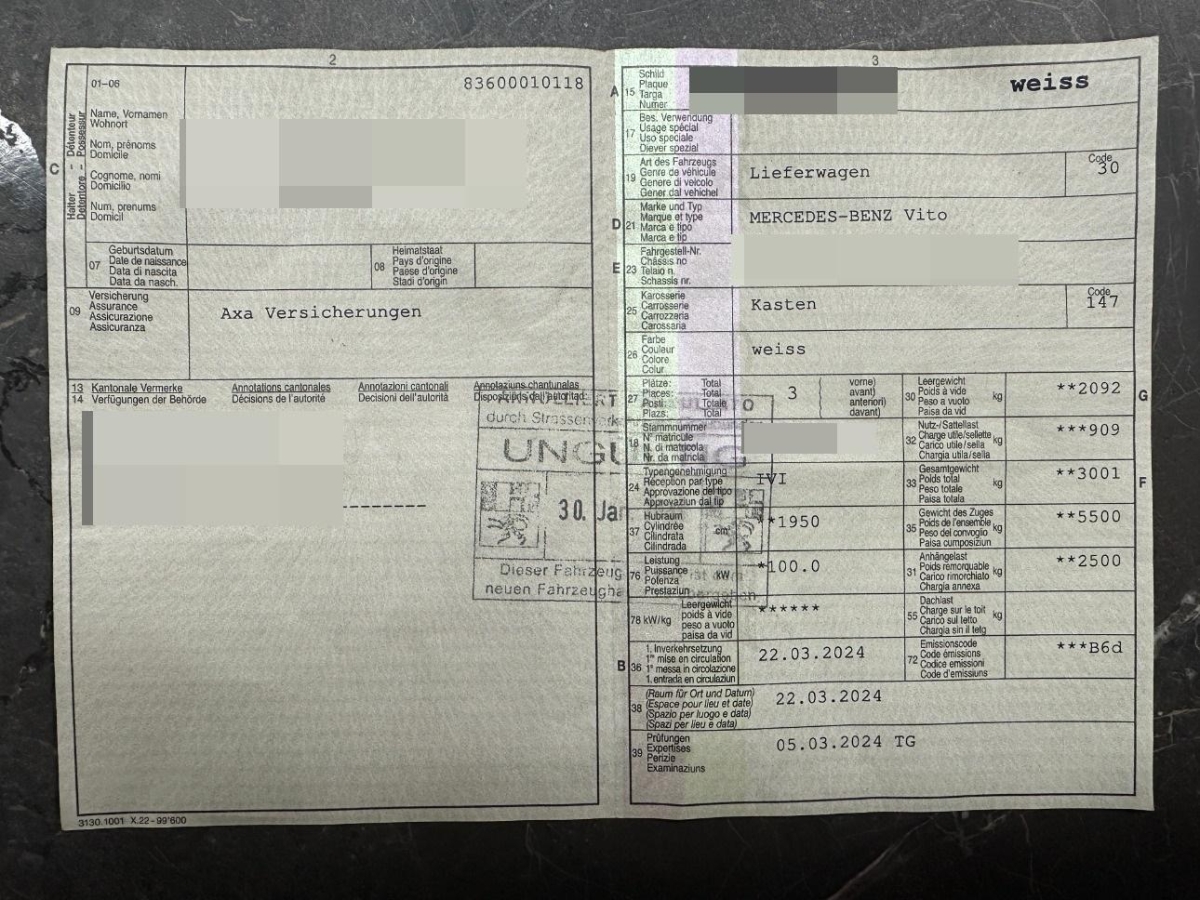 Türen: Heckklappe, Licht: 3. Bremsleuchte, Gurtwarneinrichtung für Beifahrersitz, Licht: Adaptives Bremslicht, Gurtwarneinrichtung für Fahrersitz, Drehzahlmesser elektronisch, Fahrwerk: Basisfahrwerk, Getriebe: Achsübersetzung i = 2,733, Antiblockiersystem (ABS), Abschliessbares Handschuhfach, Elektrik für Anhängersteckdose, Getriebe: Partikelfilter und Oxydationskatalysator, Trennwand durchgehend, Emissionsklasse Euro 6d-TEMP N1 GR.III/N2, Räder: Stahlräder 6,5 J x 17, Pufferbatterie für Startvorgang, Haupttank 70 Liter, Getriebe: 9G-TRONIC, 12V Steckdose, Media: Audio 10 Mit dem Audio 10 können Sie viel mehr als Radio hören – zum Beispiel über die Freisprechfunktion telefonieren oder Musik von einem mobilen Endgerät abspielen. Dazu verfügt das 1-DIN-Gerät über eine Bluetooth® Schnittstelle und einen USB-C-Anschluss mit Ladefunktion., Anhängelast 2500 kg, Gewichtsvariante 3.050 kg, Fahrwerk: Scheibenbremse an VA und HA, Polster: Polster Stoff Caluma schwarz, Abgasreinigung SCR Generation 3, Aussenspiegel heizbar und elektrisch verstellbar, Aussentemperaturanzeige, Assist: Reifendrucküberwachung an VA u. HA, drahtlos, Assist: Wartungsintervall 40.000 km, Media: Radiogeneration 2, Vliesbatterie 12 V/92 Ah, Zuheizer elektrisch, Lenkrad: Multifunktionslenkrad mit Reiserechner, Assist: Wartungsintervallanzeige ASSYST, Assist: Seitenwindassistent, Licht: Leuchtweitenregulierung, Assist: ATTENTION ASSIST, Airbag: Airbag Fahrerseite, Airbag: Airbag Beifahrer, Media: 2-Wege-Lautsprecher vorn, Media: Digitaler Radioempfang (DAB/DAB+), Regensensor, Bereifung ohne Vorgabe Fabrikat, Assist: Tempomat, Antriebsschlupfregelung (ASR), Dieselpartikelfilter, Wärmedämmendes Glas rundum, Multi-Tasten Funkfernbedienung, Licht: Scheinwerfer Halogen, Garantie: Garantie: 2 Jahre, Assist: Warnlampe für Wischwasserfüllstand, Media: Kombiinstrument mit Pixel-Matrix-Display, Türen: Schiebetür rechts, Befestigungspunkte im Dachrahmen, Komfort Fensterheber elektrisch F/BF, Paket: BlueEFFICIENCY-Paket Das BlueEFFICIENCY Paket verbessert durch verschiedene Effizienzmaßnahmen die Verbrauchswerte und den CO2-Ausstoß. Verbrauchsreduzierende Maßnahmen – effektiv kombiniert., Generatormanagement, Assist: Pannenmanagement, Fahrwerk: Allradantrieb permanent, Feststellbremse (Fusspedal), Lackierung: Uni-Lackierung, Generator 14 V / 185 A, ECO Start-Stopp-Funktion, Assist: Berganfahrhilfe, Verbandstasche, Warndreieck, Licht: Fahrlichtassistent (automatisches Fahrlicht), Zentralverriegelung mit Funk-Fernbedienung, Sitze: Fahrersitz Manuell in 6 Richtungen einstellbar für hohen Sitzkomfort., Sommerreifen, Assist: Mercedes-Benz Notrufsystem, Abschleppöse vorne/hinten einschraubbar, Lenkrad: Lenkrad in Neigung und Höhe verstellbar, Fahrwerk: Elektrische Lenkung, Media: Kommunikationsmodul (LTE) für digitale Dienste, Dekor:Innenverkleidung Laderaum, seitlich, Elektronisches Stabilitäts-Programm (ESP), Zwei Cupholder, Wegfahrsperre elektronisch, Sitze: Beifahrersitz verstellbar Manuell in 4 Richtungen einstellbar für hohen Sitzkomfort.
