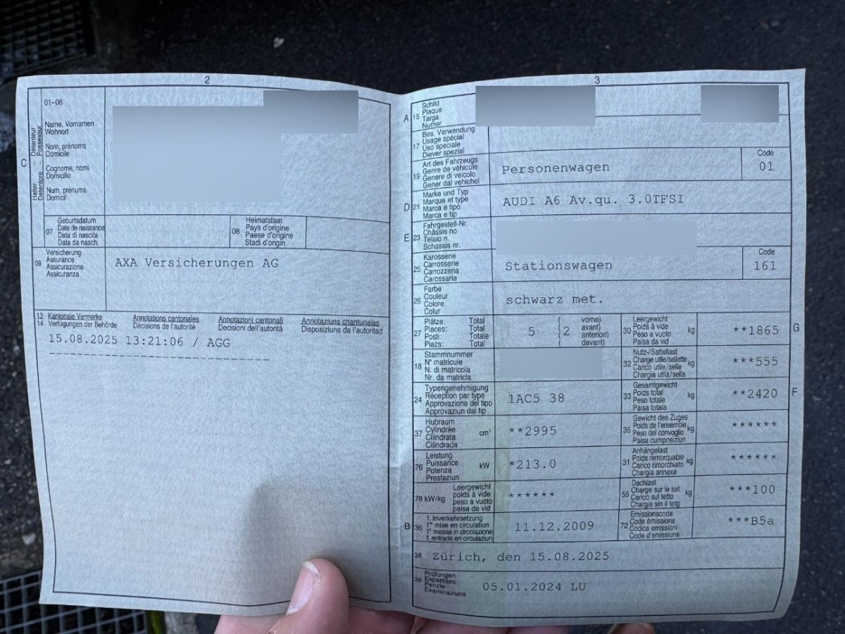 Garantie: 2 Jahre ohne Kilometerbegrenzung (ab 1. Inv.) mit ASSP+ – Audi Swiss Service Package Plus – 3 Jahre bzw. 100’000 km Reparaturen kostenlos: Service kostenlos bis 100’000km, max. 10 Jahre (ab 1. Inv.), Reserverad analog Felgen/Reifen Variante, Heckscheibenheizung, Regensensor für Scheibenwischer vorne, Seitenairbag für Fahrer und Beifahrer, Kraftstofftank 80 Liter, Polster: Stoff-Ausstattung, Cupholder vorne, Stossstangen und Aussenspiegel in Wagenfarbe, Sitze: Vordersitze heizbar, Abblendlichtausschaltverzögerung 'Follow me home’, Nebelscheinwerfer, Mittelarmlehne hinten, Elektronisches Stabilitäts-Programm (ESP), Wegfahrsperre elektronisch, Wartungsintervall-Anzeige, Katalysator geregelt, Schalthebelknauf in Leder, Scheibenwaschdüsen beheizt, Radiovorbereitung, Scheibenantenne, Ent- störung und 8 LS, Ausstiegsleuchten in den Türen vorn, Höhenverstellbare Gurten vorne, Aktive Kopfstützen, Airbag: Window-Kopfairbags, Aluminium-Applikationen, Allradantrieb permanent, Automatikgurt in Fondmitte, Bremsbelag-Verschleissanzeige, Rücksitzlehne geteilt abklappbar, Elektronische Differentialsperre (EDS), Digital Uhr, Drehzahlmesser, Gurtstraffer vorne, Durchladesystem inkl.Skisack, Fensterschachtzierleisten in Aluminium, 3-Punkt-Sicherheitsgurte auf allen Plätzen, Schienensystem im Laderaum mit variablen Verzurrösen, Alu-Räder 7,5Jx17 im 7-Arm-Design, Elektronische Parkbremse, Aschenbecher und Zigarettenanzünder, Fahrer-Informationssystem, Beleuchtetes Handschuhfach, Heckscheiben-Wisch-/Waschanlage mit, Elektrische Fensterheber vorne + hinten, Ladesicherungsnetz zum Gepäckraum, Innenlicht-Abschaltverzögerung, Klima: Pollenfilter (Staubfilter), Aussentemperaturanzeige, Zentralverriegelung mit Fernbedienung, Lederlenkrad, Autobahnblinkfunktion, Assist: Bremsassistent (BAS), Leuchtweitenregulierung elektrisch, MMI basic, Licht: Tagfahrlicht, Airbag: Airbag Fahrer und Beifahrer, Beide Make up-Spiegel beleuchtet, Antriebsschlupfregelung (ASR), Getönte Scheiben, Lichtsensor, Tageskilometerzähler, Seitenaufprall-Schutzsystem, 6-Stufen-Automat Tiptronic, Tempomat, Scheibenwischer vorne mit Intervall, Zweiklanghorn, Türgriffe aussen in Wagenfarbe, Klimaautomatik Komfort, Leseleuchten hinten, Licht: Drittes Bremslicht, Lenkrad: Lenkrad längs- und höhenverstellbar, Wassertemperaturanzeige, Dachreling blank, Leseleuchten vorne, Lackierung: Uni-Lackierung, Brillenablage, Laderaumabdeckung, Mittelarmlehne vorn in Kunstleder schwarz mit Kontrastnaht in Rot, Servotronic, Diebstahlwarnanlage mit Innenraum- überwachung, Doppelter Ladeboden mit darunter liegender Schmutzwanne, Kühlergrill verchromt, Antiblockiersystem (ABS), Radio/CD-Player, Aussenspiegel rechts und links beheizt und elektrisch verstellbar, asphärisch gewölbtes Spiegelglas, Fahrwerk: Dynamisches Fahrwerk, 3 Kopfstützen hinten, Steckdose im Kofferraum, Licht: Nebelschlussleuchte, Sitze: Vordersitze höhenverstellbar, Teppichfussmatten vorne und hinten, Scheinwerfer-Waschanlage, Lichtwarnsummer