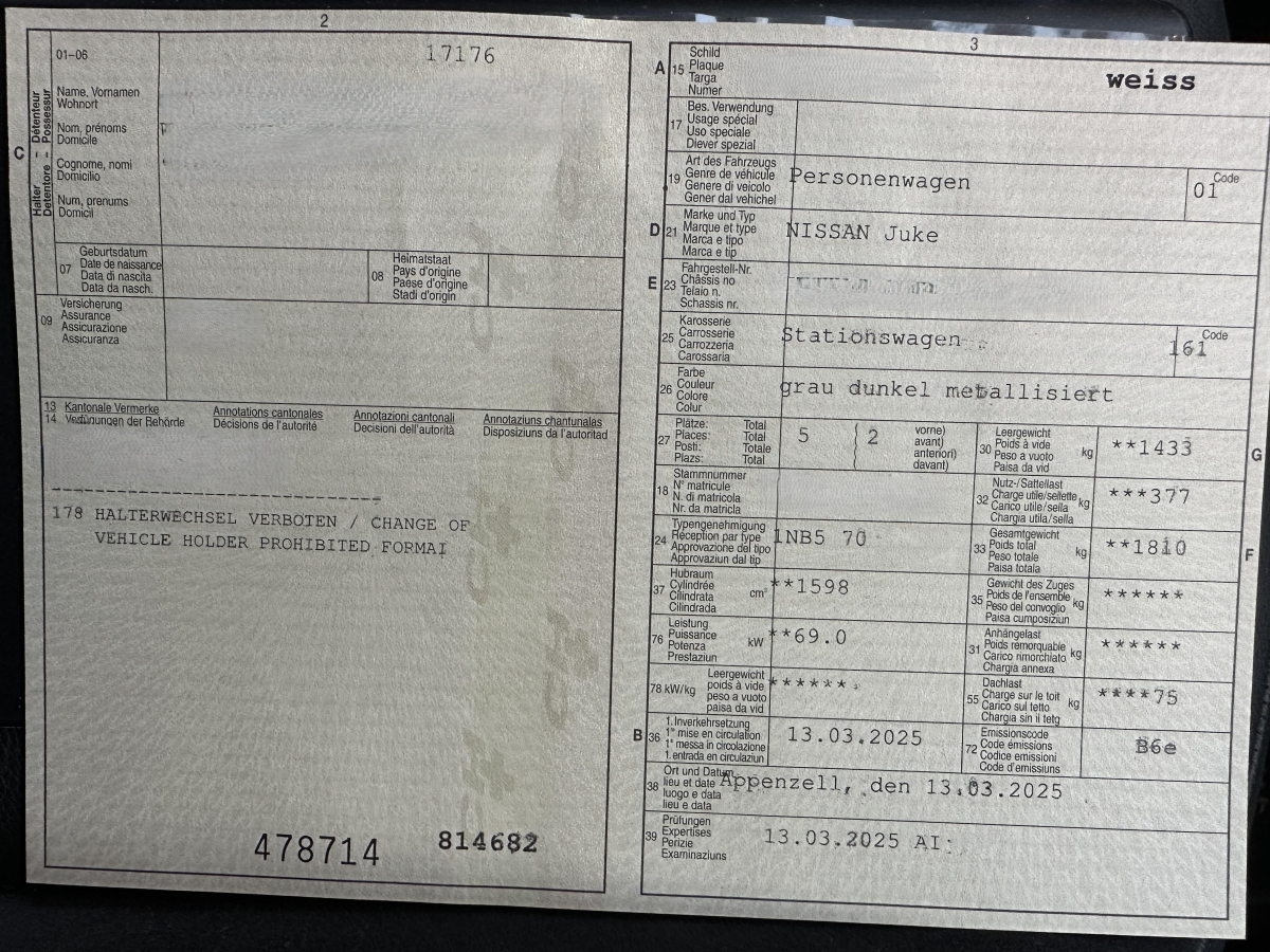 EV-Modus Schalter, Dekor: Armaturenbrett in schwarzem Kunststoff, Fahrer-Informationssystem mit 7″-TFT-Farbdisplay, Getriebe: Intelligentes Multi-Mode-Hybridgetriebe, Assist: Antiblockiersystem (ABS) mit elektronischer Bremskraftverteilung (EBD) und NISSAN Brems-Assistent, Lackierung: Uni-Lackierung, Lenkrad: Lenkrad längs- und höhenverstellbar, Elektronisches Stabilitäts-Programm (ESP), Media: Infotainment-System TFT-Bildschirm 12.3″, Apple CarPlay und Android Auto ohne Kabel, Licht: LED-Nebelschlussleuchte, Media: Smartphone-Ladesystem, kabellos, Lenkrad: Lenkradfernbedienung für- – Audiosystem, – Geschwindigkeitsbegrenzer undTempomat, – Bordcomputer., Mittelkonsole mit integrierter langer Armlehne, Licht: Dritte Bremsleuchte, Aussentemperaturanzeige, Assist: Intelligente Müdigkeitserkennung, INTELLIGENT KEY mit Start-/Stopp-Knopf, mit automatischer Ver- und Entriegelung (bei Annäherung/Entfernung vom Fahrzeug), Aussenspiegel, elektrisch anklappbar und beheizbar, Sitze: Rückenlehne asymmetrisch (60:40) umklappbar, Licht: Voll-LED-Scheinwerfer – LED-Abblendlicht, – LED-Fernlicht, Räder: 17″-Leichtmetallfelgen schwarz diamantgeschliffen (BiColor-Design) mit Bereifung 215/60 R17, Heckscheiben-Wisch-/Waschanlage, Katalysator geregelt, NissanConnect Services – In-Car Internet, – Basis Services NissanConnect App (kostenfrei), – Premium Services NissanConnect App (in den ersten drei Jahren kostenfrei), – Nissan on Google Assistant (erfordert Google-Assistant-fähiges Endgerät), Klima: Klimaautomatik inkl. Pollenfilter, Media: USB-Anschluss hinten, Türgriffe aussen in Wagenfarbe, Drehzahlmesser, Garantie: 12 Jahre Garantie gegen Durchrostung, Servolenkung geschwindigkeitsabhängig, Notruf und Pannenanruf (eCall), Kleiderhaken im Fahrgastraum, Assist: Rückfahrkamera in Farbe, Zentralverriegelung mit Fernbedienung, Kofferraumbeleuchtung, Dachhimmel schwarz, Becherhalter in den Türen, vorne und hinten, Assist: Einparkhilfe vorne und hinten, Media: 6 Lautsprecher, 3-Punkt-Sicherheitsgurte auf allen Plätzen, Leselampe, vorne und hinten, Aussenspiegel elektrisch einstellbar – mit integriertem Blinklicht – mit Spiegelkappen in Black, Assist: Warnblinkautomatik, Assist: Geschwindigkeitsbegrenzer und Tempomat, Sitze: Fahrersitz höhenverstellbarr, Media: NissanConnect Navigationssystem – TomTom Services inkl. Premium-Verkehrsinformationen, – 3 Jahre kostenlose Kartenaktualisierung, – Integrierte Spracherkennung für Audio und Telefon, Türgriffe innen verchromt, Kofferraum -variabler Kofferraumboden, D-Mode-Schalter: Auswahl des Fahrmodus „Sport”, „Eco” oder „Normal”, Verdunkelte Seitenscheiben ab B-Säule, Wegfahrsperre elektronisch, Räder: Reifenreparatur-Set, Garantie: Garanie 3 Jahre oder 100’000 km (ab 1. Inv.), Airbag: Fahrer- und Beifahrerairbag, Kopfairbags und Seitenairbags vorne, Sitze: Mittelarmlehne inkl. Staufach, vorne, Licht: Fernlicht-Assistent, Airbag: Airbag Beifahrer deaktivierbar, ISOFIX-Kindersitz-Befestigungspunkte auf den hinteren Sitzplätzen inkl. Top-Tether, e-Pedal Step, Kniepolsterung an der Mittelkonsole, Chassis Control Technologie (CCT) – Intelligente Fahrkomfortregelung – Intelligente Spurkontrolle, Polster: Sitzbezug Stoff/synthetisches Leder, schwarz, Assist: Intelligenter Autonomer Notbrems-Assistent mit Fussgänger- und Radfahrerkennung, Media: Spracherkennung, Licht: LED-Nebelscheinwerfer, Flaschenhalter in den Türen, vorne und hinten, Licht: LED-Rückleuchten, Dekor: Mittelkonsole und Türinnenverkleidungen in Dunkelgrau,Kunstleder, Räder: Reifendruck-Kontrollsystem (TPMS), Assist: Berganfahr-Assistent, Assist: Elektronische Parkbremse (e-PKB) mit automatischer Deaktivierung beim Anfahren, Assist: Intelligenter Spurhalte-Assistent aktiv mit korrigierendem Bremseingriff, Elektrische Fensterheber vorne + hinten mit Komfortfunktion (Fahrerseite), Assist: Verkehrszeichenerkennung, Garantie: 5 Jahre Garantie (bis 100 000 km) auf hybrid-spezifische Komponenten, Innenspiegel automatisch abblendbar, rahmenlos, Laderaumabdeckung, Lenkrad: Lenkradfernbedienung für Spracherkennung, Media: Haifischantenne in Black, Garantie: Garanie 3 Jahre Lackgarantie, Lenkrad: Lenkrad und Schalthebelknauf, lederummantelt, Sitze: Monoforme Sportsitze, Kopfstützen auf den hinteren Sitzplätzen höhenverstellbar, 3, Warnsignal für nicht angelegte Sicherheitsgurte, Sonnenblenden mit Make-Up-Spiegel auf Fahrer- und Beifahrerseite, Assist: Regensensor für Scheibenwischer vorne, Media: Audiosystem Radio AM/FM/DAB, RDS – Bluetooth-Schnittstelle für Mobiltelefone und Audio-Streaming, – USB-Schnittstelle, iPod-Gateway, – 2 USB-Anschlüsse vorne (Typ A und C) und 12-Volt-Steckdose, – 2 USB-Anschlüsse hinten (Typ A und C), Dachspoiler