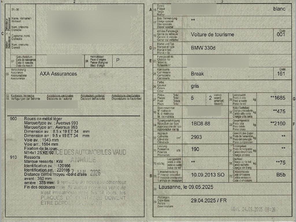 Antiblockiersystem (ABS), Veloursfussmatten vorne und hinten, TeleService, ISOFIX Kindersitzvorrichtung, Sonnenblende rechts, Dynamische Bremsleuchten, Schlüsselloser Motorstart, Automatische Stabilitäts- und Traktions- kontrolle, Windschutzscheibe aus Verbundglas, Einstiegsschienen mit Logo, Bremsassistent (BAS), Airbag: Airbag Beifahrer deaktivierbar, Lenkrad: Multifunktionslenkrad, Radiovorbereitung, Antenne, Entstörung und 6 LS, Zusätzliche 12V Steckdosen, Sonnenblende links, Airbag: Airbag Fahrer und Beifahrer, Blinker in Aussenspiegel, Airbag: Seitenairbag für Fahrer und Beifahrer, Mittelarmlehne vorne, Assist: Crash-Sensor, Befestigungsösen im Laderaum, Partikelfilter und Oxydationskatalysator, Durchladesystem, Bremsenergie-Rückgewinnung, Start-/Stop-Knopf, Nebelscheinwerfer, Drittes Bremslicht, Licht: Nebelschlussleuchte, Bordcomputer, Kopfstützen hinten, Steckdose im Kofferraum, Servotronic, Assist: Cornering Brake Control (CBC), Anfahrassistent, Automatische Heckklappenbetätigung, Abschliessbare Radschrauben, Radio BMW Professional, Mittelarmlehne hinten mit 2 Getränkehaltern, Aux-In Anschluss, BMW Mobility System, Klimatisierungsautomatik, Wegfahrsperre elektronisch, Elektrische Fensterheber vorne + hinten, Türgriffe in Wagenfarbe, Window-Kopfairbags, Rücksitzlehne geteilt abklappbar, 8-Stufen-Automat sequentiell, Bereifung mit Notlaufeigenschaft, Licht: Heckleuchten in LED-Technik – einteilige LED-Heckleuchten mit Rauchglas Komponenten – Heckleuchte mit Schlusslicht, Bremslicht, Fahrtrichtungsanzeiger (LED-Technologie), Bremsbelag-Verschleissanzeige, Steckdose 12V, Aktive Kopfstützen, Dynamische Stabilitätskontrolle (DSC), Intelligenter Notruf, Weisse Blinkleuchten, Aussenspiegel rechts und links beheizt und elektrisch verstellbar, asphärisch gewölbtes Spiegelglas, Vordersitze mechanisch längsverstellbar, Verbandskasten, Lenkrad: Lenkrad längs- und höhenverstellbar, Elektronische Differentialsperre, Aufklappbare Heckscheibe, Elektrische Lenkung (EPS), Nichtraucherausführung, Leuchtweitenregulierung elektrisch, Auto Start-/Stop-Anlage, Décor: Baguettes intérieures en argent soyeux mat, Equipement en tissu/move, Jantes à étoile 394, en alliage léger 17J avec pneus, Sièges AV réglables en hauteur, Volant en cuir