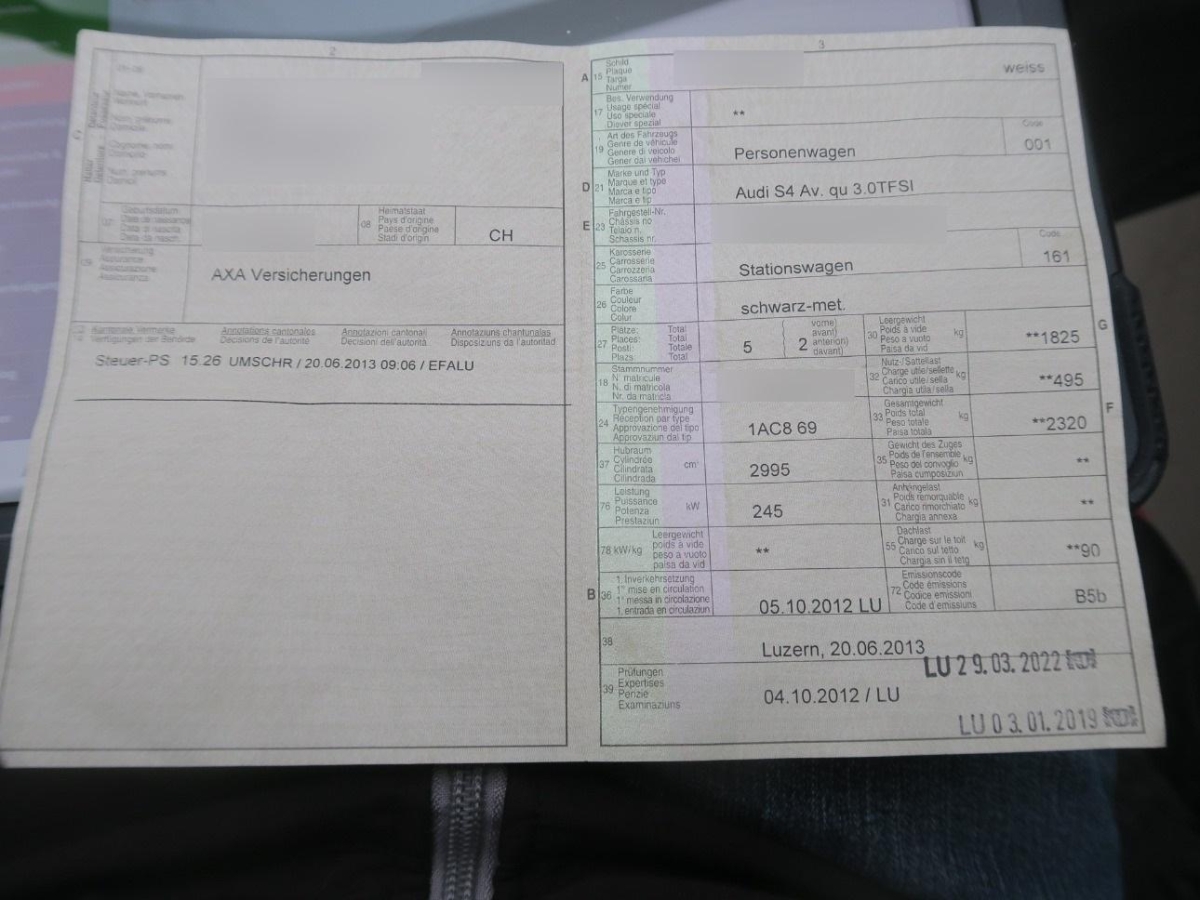 Tageskilometerzähler, 3 Kopfstützen hinten, Scheibenwischer vorne mit Intervall, Türgriffe aussen in Wagenfarbe, Fahrwerk: Dynamisches Fahrwerk, Multifunktions-Sportlederlenkrad mit Schaltwippen, Aussentemperaturanzeige, Kreuzstützen für Vordersitze elektrisch verstellbar, Kofferraumfernentriegelung, Aschenbecher und Zigarettenanzünder, Airbag: Airbag Fahrer und Beifahrer, Gurtstraffer vorne, Licht: Nebelschlussleuchte, Mittelarmlehne vorn in Kunstleder schwarz mit Kontrastnaht in Rot, Elektronische Differentialsperre (EDS), Elektrische Fensterheber vorne + hinten, Höhenverstellbare Gurten vorne, Lederlenkrad, Mittelarmlehne hinten, Wassertemperaturanzeige, Sitze: Vordersitze manuell verstellbar, Seitenairbag für Fahrer und Beifahrer, Licht: Tagfahrlicht, Durchladesystem inkl.Skisack, Brillenablage, Wartungsintervall-Anzeige, Digital Uhr, Drehzahlmesser, Lichtwarnsummer, Stop/Start-Technologie, Xenon Plus-Scheinwerfer, Autobahnblinkfunktion, Allradantrieb permanent, Servotronic, Alu-Räder im 5-Speichen-Design 8x18J, Garantie: 2 Jahre ohne Kilometerbegrenzung (ab 1. Inv.), Notrad, Lichtpaket, Klima: Klimatisierungsautomatik, Sitze: Vordersitze heizbar, Aussenspiegel in Alu, MMI basic, Wagenheber, Bremsbelag-Verschleissanzeige, Zentralverriegelung mit Fernbedienung, Dekoreinlagen in Aluminium matt gebürstet, Getönte Scheiben, Antriebsschlupfregelung (ASR), Bordcomputer, 3-Punkt-Sicherheitsgurte auf allen Plätzen, Innenlicht-Abschaltverzögerung, Assist: Bremsassistent (BAS), Radiovorbereitung, Scheibenantenne, Ent- störung und 8 LS, Leuchtweitenregulierung elektrisch, Sitze: Vordersitze höhenverstellbar, Fahrer-Informationssystem, Wegfahrsperre elektronisch, Lackierung: Uni-Lackierung, Rücksitzlehne geteilt abklappbar, Befestigungsösen im Laderaum, Dachreling blank, Klima: Pollenfilter (Staubfilter), Katalysator geregelt, Antiblockiersystem (ABS), Tempomat, Lenkrad: Lenkrad längs- und höhenverstellbar, Seitenaufprall-Schutzsystem, Beide Make up-Spiegel beleuchtet, Teppichfussmatten vorne und hinten, Cupholder vorne, Aktive Kopfstützen, Scheibenwaschdüsen beheizt, Nebelscheinwerfer, Sequentielles 7-Gang-Getriebe mit Automatikfunktion, Elektronisches Stabilitäts-Programm (ESP), Airbag: Window-Kopfairbags, Radio Chorus, Alcantara-/Leder-Ausstattung, S Sportfahrwerk, Elektronische Parkbremse, Fensterschachtzierleisten in Aluminium, Heckscheibenheizung, Aussenspiegel rechts und links beheizt und elektrisch verstellbar, asphärisch gewölbtes Spiegelglas, Scheinwerfer-Waschanlage, Abschliessbare Radschrauben, Sportsitze vorne mit Kreuzstütze, Licht: Drittes Bremslicht, Leseleuchten vorne