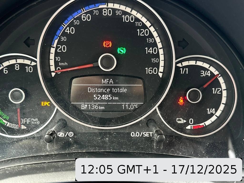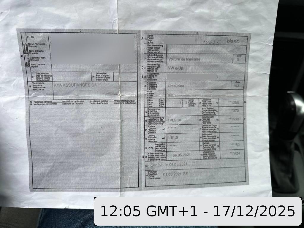 Media: Smartphone Integration „maps + more dock”, Fensterheber vorne elektrisch, Sitze: Sitzbelegungserkennung hinten, Gepäckraumbeleuchtung, Räder: Tire Mobility Set: 12-Volt-Kompressor und Reifendichtmittel, Sitze: Sitzplätze 2 vorne / 2 hinten / Rücksitzbank ungeteilt, Lehne asymetrisch geteilt umklappbar, Airbag: Kopf- und Seitenairbag vorne, kombiniert Kopfairbagsystem für Frontund Fondpassagiere – inkl. Seitenairbags vorne, Regensensor, Gepäckraumabdeckung inkl. Gepäcknetz, Warndreieck, Licht: Lichtdreh- und Heizungsschalter in Chrom, Räder: Radvollblenden für Stahlräder, Radsicherungsschrauben, Assist: Verkehrszeichenerkennung über Navigationssystem maps&more, Innenspiegel manuell abblendbar, Nichtraucherausführung, 12-V-Steckdose vorne, Multifunktionsanzeige, Kombiinstrument mit elektronischem Tachometer in Chrom (e-spezifisch), Hochton-Signalhorn, Scheibenwischer vorne und Heckscheibenwischer mit Intervallschaltung, Gepäckraumboden in 2 Höhen einstell- und herausnehmbar, Bordwerkzeug und Wagenheber, Ohne Fussmatten, Ablagefächer in die Türen (vorne mit Halterung für 1,0-l-Flaschen), Ladedose AC-Normalladen mit bis zu 7.2 kW, Typ 2 Stecker, Bremsenergierückgewinnung, Räder: Stahlräder – 4 Stahlräder 5 J x 14 – Reifen 165/70 R14 Hankook Reifen – Mit Radvollblenden, Taste für Fahrprofilauswahl (eco, eco+), Ladekabelunterbringung im Kofferraum, Mittelkonsole inkl. 1 Becherhalter vorne und 1 Becherhalter hinten, Licht: Nebelschlussleuchte, Dachhimmel in light grey, Taschenhalter, Schalthebelknauf in Kunststoff, Sitze: Vordersitze mit höheneinstellung, Scheibenbremsen vorne, innenbelüftet / Trommelbremsen hinten, Lackierung: Uni-Lackierung (teal blue uni), Media: USB-Schnittstelle auch für iPod/iPhone, Zentralverriegelung mit Funkfernbedienung mit zwei Funkklappschlüssel, Handschuhfach mit Klappe, Sonnenblende für Fahrer und Beifahrer, auf Beifahrerseite mit Makeup-Up-Spiegel, Aussenspiegel mit integrierten Blinker, Ohne zusätzliche Leuchten (Beleuchtung innen), Elektronisches Stabilisierungsprogramm (ESP) inkl. ABS mit Bremsassistent – inkl. ASR, EBV, MSRund Berganfahrassistent, Ladekabel Mode 3 Typ 2, 32 A Stecker fahrzeugseitig und netzseitig – geeignet für öffentliche AC-Ladeinfrastruktur, Assist: Lane Assist, Warnton und -leuchte für nicht angelegten Fahrergurt, optisch für den Fond, 2 Kopfstützen hinten, höhenverstellbar (L-Form), Heckscheibenheizung, Ladedose DC-Schnellladen mit bis zu 40 kW, Combo Stecker (Combined Charging System CCS), Licht: LED Tagfahrlicht im Lüftungsgitter, Frontscheibe in Wärmeschutzglas, unbeheizt, Car-Net und e-Remote – Fernsteuerung der Heizung/Klimatisierung per Mobiltelefon, Programmierung der Vorklimatisierung auch ohne Stromnetzverbindung, Abrufen der Informationen über die Batterieladung, Einstellen der Abfahrtszeit, Abfrage allgemeiner Fahrzeuginformationen), ersten 3 Jahre Vertragslaufzeit gratis, Dekorleiste an der Heckklappe in Blau, Klima: Klimaanlage „Climatronic”, Lenkrad: Lenkrad Kunststoff, Licht: Halogen-Hauptscheinwerfer und Blinkleuchten unter gemeinsamer Klarglasabdeckung, Media: Radiosystem „composition phone” mit 5.0″-Farbdisplay – Multimediabuchse AUX-IN, FM-Empfang, SD-Kartenschacht und Mobiltelefonvorbereitung (Bluetooth), Dash pad „black cube”, Sitze: Kopfstützen vorne im Sitz integriert, Sound Aktor mit „e-Sound”, Airbag: Airbag für Fahrer und Beifahrer, mit Beifahrerairbag-Deaktivierung über Schlüssel, ISOFIX-Halteösen (Vorrichtung zur Befestigung von 2 Kindersitzen auf der Rücksitzbank) – inkl. Top-Tether-Vorrichtung, Getriebe: 1-Gang Getriebe automatisiert, Media: Telefonschnittstelle, Garantie: 2 JAHRE NEUWAGEN-GARANTIE OHNE KILOMETER-BEGRENZUNG, Polster: Sitzbezüge in Stoff Dessin „fusion”, Zentralverriegelung ohne Safe-Sicherung inkl. Funkfernbedienung, Dreipunkt-Automatiksicherheitsgurte hinten, aussen mit ECE-Label, Schwellerverbreiterung in Wagenfarbe, Licht: Fahrlichtschaltung automatisch, mit Tagfahrlicht, Leaving home-Funktion – inkl. manueller Coming home-Funktion, Basisladekabel AC-Normalladen mit bis zu 1.8 kW, Typ 2 Stecker fahrzeugseitig und Typ 13 Stecker net – Haushaltssteckdose, Handbremshebelgriff in Kunststoff, 4 Türen, Seitenscheiben hinten ausstellbar, Garantie: VW Garantie: 12 Jahre Karosserie-Garantie gegen Durchrostung, Media: Sound „plus” – 6 Lautsprecher, Stossfänger in Wagenfarbe mit Lufteinlässen in Wabenstruktur, Garantie: VW Garantie: 8 Jahre oder 160’000 km Garantie auf HV-Batterie, Media: Digitaler Radioempfang DAB+, Reifendruckkontrollanzeige, Servolenkung elektromechanisch, Entfall des Schriftzugs auf der Heckklappe „e-up!”