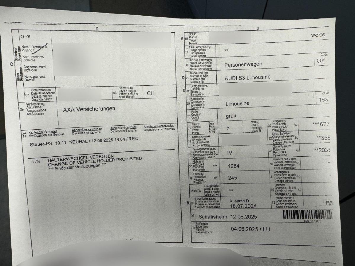 Paket: Assistenzpaket Schutz- und Warnsysteme plus (Assist: Ausweichassistent und Abbiegeassistent, Assist: Spurwechselwarnung mit Ausstiegswarnung und Querverkehrassistent hinten), Paket: Ablagen- und Gepäckraumpaket (12 Volt-Steckdose im Laderaum, Ablagefach Fahrerseite, Handschuhfach abschliessbar, Sitze: Ablagenetz an der Rückseite der Vordersitzlehne, 2. Gepäckraumleuchte links in LED, Komfort-Cupholder, Gepäckraumnetz), Paket: Navigationspaket (Head-Up Display, Media: SONOS Premium Soundsystem, Audi virtual cockpit plus, Media: MMI Navigation plus mit MMI touch, Paket: Infotainmentpaket 2), Paket: Komfortpaket pro (Aussenspiegel elektrisch einstell-, beheiz- und anklappbar, automatisch abblendend, mit Memory, Sitze: Vordersitze elektrisch einstellbar mit Memory-Funktion für den Fahrersitz, Sitze: 4-Wege-Lendenwirbelstütze für die Vordersitze, Innenspiegel automatisch abblendend, rahmenlos), Paket: Assistenzpaket Fahren und Parken pro und Assistenzpaket Schutz- und Warnsysteme plus (Paket: Assistenzpaket Schutz- und Warnsysteme plus, Assist: Adaptiver Geschwindigkeitsassistent, Assist: Erweitertes Sicherheitssystem (PreCrash), Paket: Assistenzpaket 5), Paket: Klimatisierungspaket plus (Klima: 3-Zonen-Klimatisierungsautomatik, Sitze: Sitzheizung vorne), Paket: Infotainmentpaket Connectivity (Paket: Infotainmentpaket 1, Audi virtual cockpit), Assist: Adaptiver Fahrassistent mit Notfallassistent, Lackierung: Perleffekt-Lackierung, Interieur S mit Sportsitzen, Mikrofaser Dinamica/Kunstleder-Kombination schwarz – Ambiente-Lichtpaket pro – Armauflage Kunstleder – Dachhimmel Stoff schwarz – Einstiegsleisten mit Aluminiumeinlegern vorn, beleuchtet, S-Schriftzug – Interieurapplikationen Aluminiumoptik – Interieurpaket 9 – Lenkradapplikation Chromoptik, S-Emblem, Lenkradgriffe perforiertes Leder und Kontrastnaht – Mikrofaser Dinamica/Kunstleder-Kombination mit Rautensteppung und S-Prägung – Pedalerie aus Edelstahl – Rücksitzlehne geteilt umklappbar – Sportsitze vorn, Sitze: Lendenwirbelstütze, pneumatisch einstellbar mit Massagefunktion für die Vordersitze, Sonnenschutzverglasung, abgedunkelt, Sitze: Rücksitzlehne, geteilt umklappbar, Assist: Parkassistent mit Einparkhilfe plus, Media: Audi Phone Box, Media: LTE-Unterstützung für Audi phone box, Paket: Ambiente-Lichtpaket pro – Dachmodul inklusive Leseleuchten – Make-up-Spiegel beleuchtet – Ambiente Türbeleuchtung – Einstiegsleuchten an der Unterseite der Türen vorn – beleuchtetes Ablagefach der Mittelkonsole – Fussraumbeleuchtung vorn – Konturbeleuchtung Instrumententafel – Ambiente Türbeleuchtung vorn und hinten – Konturbeleuchtung in den Türen vorn und hinten – Ablagefach Mittelkonsole – Einstiegsleuchten an der Unterseite der Türen hinten – Fussraumbeleuchtung – Durchleuchtetes Stofffeld in den Türen, Assist: Rückfahrkamera, Fahrwerk: S-Sportfahrwerk mit Dämpferregelung, Licht: Einstiegs-LED mit S-Logoprojektion vorn, Räder: Diebstahlsicherung für Räder, Performance-Abgasanlage, Endschalldämpfer Titan, Dekor: Dekoreinlage Mikrofaser Dinamica schwarz, Licht: Matrix LED-Scheinwerfer, LED-Heckleuchten und Scheinwerfer-Reinigungsanlage – LED-Heckleuchten mit dynamischer Lichtinszenierung und dynamischem Blinklicht – Matrix LED-Scheinwerfer mit dynamischer Lichtinszenierung und dynamischem Blinklicht – Matrix LED-Scheinwerfer mit dynamischer Lichtinszenierung und dynamischem Blinklicht – Scheinwerfer-Reinigungsanlage, Assist: Halteassistent, Panorama-Glasdach, Räder: Räder Audi Sport, Vielspeichen S-Design, anthrazitschwarz, glanzgedreht – Grösse 8,0 J x 19, Reifen 235/35 R19, Aussenspiegel in Wagenfarbe, Paket: Optikpaket schwarz plus – schwarze Akzente im Bereich des Audi Singleframe, der Zierleisten an den Seitenscheiben und der Stossfanger vorn und hinten – Audi Ringe vorn und hinten in Anthrazitgrau, Sitze: Kindersitzbefestigung ISOFIX vorn, Top Tether und i-Size für die äusseren Fondsitze