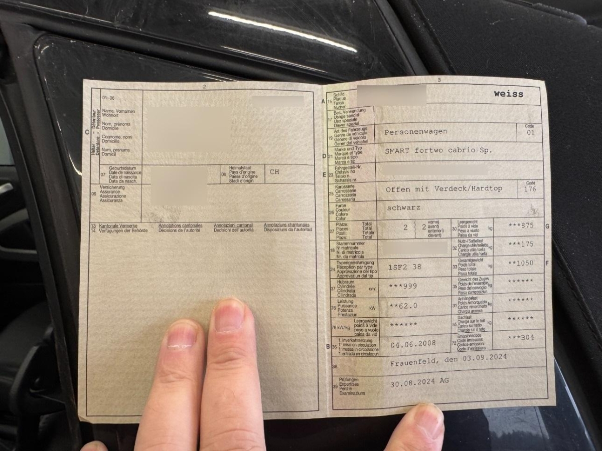 Elektrisches Verdeck, Halogenscheinwerfer, Wassertemperaturanzeige, Ablagefach unter dem Beifahrersitz, Aussenspiegel von innen verstellbar, Scheibenwischer vorne mit Intervall, Sicherheitszelle in schwarz, Uni-Lackierung, Katalysator geregelt, Elektronisches Stabilitäts-Programm (ESP), Analog-Uhr, Drittes Bremslicht, Multifunktionsanzeige, Kofferraum-Entriegelung von innen, 4 Leichtmetallfelgen 15J mit Pneu, Kofferraumfernentriegelung, Tankdeckel-Entriegelung von innen, Zentralverriegelung mit Fernbedienung, Wegfahrsperre elektronisch, Leuchtweitenregulierung von innen, Licht: Nebelschlussleuchte, Elektrische Fensterheber vorne, Antiblockiersystem (ABS), Nebelscheinwerfer, Schalthebelknauf in Leder, Tageskilometerzähler, Heckscheibenheizung, Gurtstraffer vorne, 3 Speichen-Lederlenkrad, Aussentemperaturanzeige, Wartungsintervall-Anzeige, Weisse Blinkleuchten, Stoff-Ausstattung, Airbag: Airbag Fahrer und Beifahrer, Anfahrassistent, Beifahrersitz-Rückenlehne umklappbar, Steckdose, Drehzahlmesser, Bremsassistent (BAS), Make up-Spiegel rechts, Ablagefach, Sequentielles 5-Gang-Getriebe