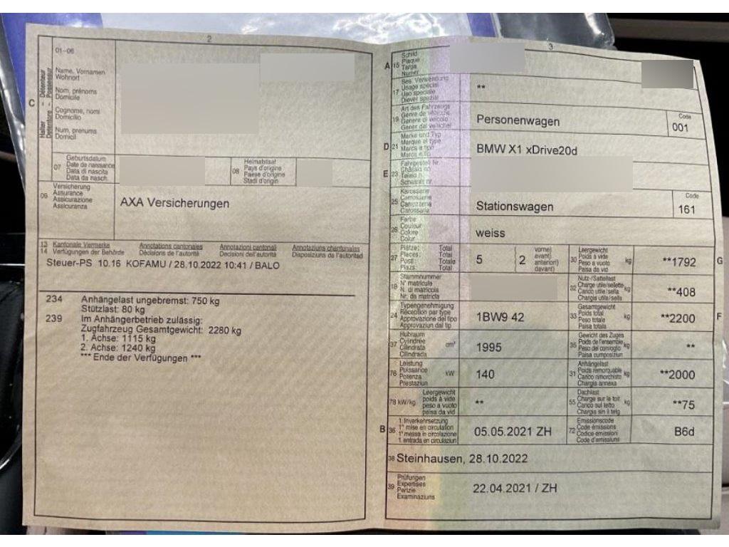 Licht: LED Scheinwerfer, Airbag: Airbag Beifahrer deaktivierbar, Media: Lautsprecher 2 Mitteltöner vorn, 2 Mitteltöner hinten, 2 Tieftöner als Zentralbässe unter den Vordersitzen, Verstärkerleistung 100 W, Allradantrieb permanent, Airbag: Airbag Fahrer und Beifahrer, Aussenspiegel elektrisch verstellbar, beheizt Chromglas, Spiegelglas Fahrerseite asphärisch, Spiegelglas Beifahrer konvex, Performance Control, Assist: Anfahrassistent, Servotronic, Sitze: Ausführung 5 Sitzplätze, Dynamische Stabilitätskontrolle (DSC), Media: 6,5″ Display (Auflösung: 800×480 Pixel), Bedienung mittels iDrive Controller, USB-Anschluss, Bluetooth-basierte Freisprecheinrichtung und Audiostreaming, Assist: Park Distance Control hinten, Bordcomputer, Türen: Automatische Heckklappenbetätigung – Elektrisch öffnende/schliessende Heckklappe – Bedienungstasten in Türverkleidung Fahrerseite und Heckklappe – Heckklappenschloss, elektrisch mit Soft-Close-Automatic und Verriegelungsüberwachung, Wärmeschutzverglasung, Media: ConnectedDrive Services – Beinhaltet die kostenlose Nutzung von Fahrzeug Apps über BMW Online (inkl. Zugriff auf Wetterinformationen, Nachrichten, Adresssuche etc.) für 3 Jahre – Registrierung erforderlich für personalisierbare Dienste – Der Dienst BMW Online ist ab 2 Wochen vor Ablaufdatum via BMW ConnectedDrive Store kostenpflichtig verlängerbar, Armauflage, Räder: Radschraubensicherung, Start/Stop-Funktion, BMW Teleservices, Airbag: Window-Kopfairbags vorne und hinten, Media: DAB+ Tuner, Media: USB-Anschluss, Airbag: Seitenairbag für Fahrer und Beifahrer, Elektrische Fensterheber, ISOFIX-Befestigungspunkte für Kindersitz an den äusseren Rücksitzen, Veloursfussmatten, Lenkung, elektrisch unterstützt, Warndreieck, Elektrische Lenkung (EPS), Lenkrad: Multifunktionslenkrad, Assist: Geschwindigkeitsregelung mit Bremsfunktion, Paket: Ablagenpaket Fahrer- und Beifahrersitz: Netze an Sitzlehnerückseite Mittelkonsole, hinten: eine Doppel-USB-Buchse (nur Laden: Typ C/3,0 A) Mittelarmlehne im 20%-Segment der Fondsitzlehne. Inklusive 2 Cupholder (mit jeweils 4 Flaps zur Fixierung und Klappdeckel) im vorderen Bereich.Formschlüssig,Klappfunktion des 20%-Segments bleibt vollständig erhalten Im Gepäckraum: Netz, schwarz, mit Rahmen, links, rechts Steckdose (12 V), rechts, mit Klappdeckel, Getriebe: 8-Stufen-Automat Steptronic, Regensensor für Scheibenwischer vorne, Licht: LED-Tagfahrlicht, Hill Descent Control (HDC), Partikelfilter und Oxydationskatalysator, Licht: LED Nebelscheinwerfer, BMW Mobility System, Lackierung: Uni-Lackierung, Antiblockiersystem (ABS), Halogenscheinwerfer, Steckdose 12V, Remote Services – Nutzung von Remote Services (z.B. Öffnen/Verriegeln der Türen) – Senden von Zieladressen an das Fahrzeug über die BMW Connected App für Smartphones – Anzeige des Fahrzeugstandortes in der Karte über den Vehicle Finder – Laufzeit: unbegrenzt, Sitze: Fondsitze, Sitzlehne mit 40:20:40-Klappung, Aussenspiegelgehäuse mit integrierter Zusatzblinkleuchte in LED, Pollenfilter (Staubfilter), 3-Punkt-Sicherheitsgurte auf allen Plätzen, Paket: Lichtpaket Lichtquellen LED-Technologie: – Make-Up-Spiegel-Leuchten – Ambientelicht, vorne und hinten – Leseleuchten, vorne und hinten – Beleuchtung Ablagefach Centerstack – Ambiente Instrumententafelbeleuchtung aus Dekorleiste Beifahrerseite – Türspiegelbeleuchtung, indirekt aus Dekorleiste – Fussraumleuchten, vorne und hinten – Türgrifferkennung, aussen – Vorfeldbeleuchtung – Zweifarbige X-Logo Projektion aus Aussenspiegel Fahrerseite – Handschuhkastenbeleuchtung (Leuchtmittel), Air Curtain, Fahrerlebnisschalter inkl. ECO PRO, Assist: Active Guard Speed Limit Assist Auffahrwarnung mit City-Anbremsfunktion, BMW BluePerformance mit AdBlue, Zentralverriegelung mit Fernbedienung, Lenkrad: Lenkrad längs- und höhenverstellbar, Assist: Dynamische Traktionskontrolle (DTC), Dachreling schwarz, Intelligenter Notruf, Räder: Reifendruck-Kontrollanzeige, Klima: 2-Zonen-Klimaautomatik, Dekor: M Interieurleisten Aluminium Hexagon mit Akzentleiste Blau matt, Fahrwerk: Serienfahrwerk, Lenkrad: M Lederlenkrad, Paket: M Aerodynamicpaket, Polster: Stoff ”Micro Hexagon” / Sensatec, Räder: 18" M Leichtmetallräder Doppelspeiche 570 Ferricgrau 7,5 J×18/Bereifung 225/50 R 18