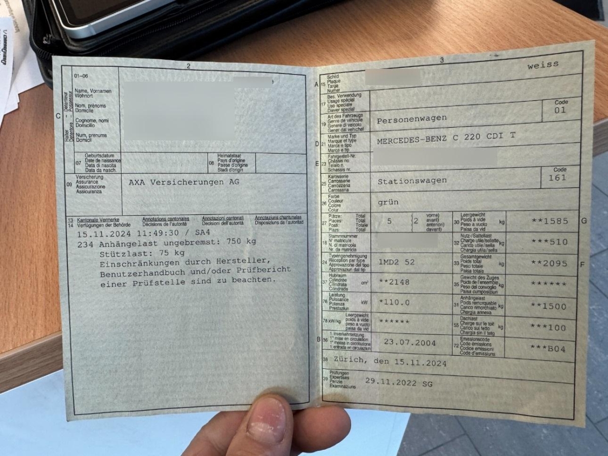 Grün getönte Scheiben, Scheibenwischer vorne mit Intervall, Beide Make up-Spiegel beleuchtet, Audio 20 Radio CD/RDS, Drehzahlmesser, Lenkrad: Multifunktionslenkrad, Info-Display, Sitze: 3-Punkt-Sicherheitsgurte auf allen Plätzen, Wegfahrsperre elektronisch, Assist:Tempomat, Lackierung: Uni-Lackierung, Pollenfilter (Staubfilter), Heckscheiben-Wisch-/Waschanlage mit, Bremsassistent (BAS), Lenkrad längs- und höhenverstellbar, Laderaumabdeckung, Licht:Fahrlichtautomatik, Wassertemperaturanzeige, Innenlicht-Abschaltverzögerung, Elektronisches Stabilitäts-Programm (ESP), Sitze: Rücksitzlehne geteilt abklappbar, Licht: Nebelschlussleuchte, Seitenschutz-Zierleisten, Kartentaschen an den Rückenlehnen, Partikelfilter und Oxydationskatalysator, Sitze: 3 Kopfstützen hinten, Aussentemperaturanzeige, Motorrestwärmespeicher, Cupholder vorne und hinten, Sicherungsnetz für Ladegut, Stossstangen und Aussenspiegel in Wagenfarbe, Höhenverstellbare Gurten vorne, Airbag:Sitzbelegungserkennung für Airbags, Wartungsintervall-Anzeige, Türgriffe aussen in Wagenfarbe, Getriebe: 6-Gang-Getriebe, Antiblockiersystem (ABS), Einkaufklappbox, Bremsbelagverschleiss, Lichtwarnsummer, Brillenablage, Airbag: Window-Kopfairbags, Klimatisierungsautomatik, Licht:Nebelscheinwerfer, Licht:Ausstiegsleuchten in den Türen, Kombi-Instrumente mit Chromzierringen, Dachreling, Polster: Stoff-Ausstattung, Sitze:Vordersitze elektrisch verstellbar, Kühlergrill verchromt, Scheibenwaschdüsen beheizt, Servolenkung, Zentralverriegelung mit Fernbedienung, Lenkrad: Lenkrad und Schalthebelgriff in Leder, Heckscheibenheizung, Elektrische Fensterheber vorne + hinten, Tageskilometerzähler, Verbandskasten, Automatikgurt in Fondmitte, Dachspoiler, Gurtstraffer vorne und hinten, Leuchtweitenregulierung von innen, Airbag: Airbag Fahrer und Beifahrer, Sitze:Mittelarmlehne hinten, Steckdose im Kofferraum, Reiserechner, Sitze: Armlehne vorne mit Ablagefach, Leichtmetallräder im 7-Loch-Design 16J, Holzapplikationen an Armaturenbrett und Türverkleidung, Einstiegsschienen, Licht: Drittes Bremslicht, Airbag:Seitenairbags, Digital Uhr