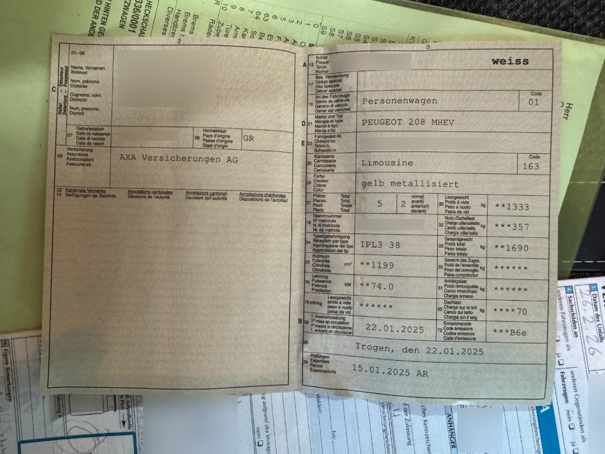 Licht: Scheinwerfer Peugeot LED Technology mit 3-Krallen-LED-Tagfahrlicht, Netze an der Rückenlehne der Vordersitze, Kühlergrill in Schwarz mit Details in Wagenfarbe, Lamellen in Dark Chrome, Garantie: 3 Jahre / 100 000 km Garantie auf Teile, Arbeit (je nachdem, welche Bedingung zuerst eintritt), Klima: Automatische Einzonen-Klimaanlage, Blende zwischen den Heckleuchten im glänzendem Schwarz, Zentralverriegelung mit Fernbedienung, Licht: Innenbeleuchtung : Deckenleuchte vorne (1 Lampe und 2 Leseleuchten) + Beleuchtung Kofferraum mit Lampe, Media: Peugeot i-Cockpit mit digitalem 10 Zoll Kombiinstrument, Media: PEUGEOT i-Connect – DAB-Radio rnit personalisierbarern – 10-Zoll-HD-Farbtouchscreen, Bluetooth – Wifi, 1 USB-Anschluss Typ C (Daten+Aufladung) – 1 USB-Anschluss Typ C ( Aufladung ) an der Vorderkonsole , 1 USB-Anschluss Typ C (Aufladung) und 1 USB-Anschluss Typ A (Aufladung) hinten, Fahrwerk: Fahrmodus-Schalter Normal/Eco/Sport, Getriebe: 6-Stufen-Automat sequentiell, Türverkleidungen vorne mit Carbon Dekor und Zierleiste schwarz glänzend, Mittelkonsole mit integrierter Armlehne und elektrischer Parkbremse inkl. Berganfahrhilfe, Pausenwarner, Lenkrad: Kompaktlederlenkrad mit integrierten Bedienelementen, Hintere Seitenscheiben und Heckscheibe getönt, Sitze: Umklappbare Rücksitzbank 1/3 – 2/3, Automatische Verriegelung aller Türen beim Fahren, Licht: Automatisches Abblendlicht, Sicherheitsgurte vorne mit pyrotechnischer Haspel mit Gurtstraffern und Kraftbegrenzern, Sicherheitsgurte hinten, mit progressiven Kraftbegrenzern, Innenraum und Dachhimmel Grau, Automatischer Frontwischer, Dekor: Armaturenbrett aus Schaumstoff mit Carbon Dekor und Zierleiste Schwarz glanzend mit Chromleis, Media: 6 Lautsprecher (2 Tweeters und 2 Woofers vorne, 2 Lautsprecher hinten), Aussenspiegelgehäuse in glänzendem Schwarz, Heckschürze Schwarz glänzend, Assist: Visuelle und akustische Einparkhilfe vorn und hinten, Räder: Indirekte Reifenluftdruckkontrolle, Räder: Zweifarbige 16-Zoll-Leichtmetallfelgen glanzgedreht NOMA, Lenkrad: Lenkrad in Höhe und Weite verstellbar, Servolenkung elektrisch, Dachkantenspoiler in glänzendem Schwarz, Elektronische Stabilitätskontrolle (ESP) mit Traktionskontrolle (ASR), ABS (Antiblockiersystem) EBV (Elektronischer Bremskraftverteiler), Notbremsassistent, Dynamische Stabilitätskontrolle (DSC) und Anhängerstabilitätssystem, Elektrische und sequenzielle Fensterheber vorn und hinten mit Klemmschutz, Licht: 3-Krallen-LED-Rückleuchten, Garantie: 12 Jahre Korrosionsschutzgarantie, Polster: Stoff CASUAL LOMSA gepragt, Tri Material LOMSA mit Ziernahten Quartz, Höhenverstellbare Kopfstützen an Fahrer Fahrer-und Beifahrersitz sowie Rücksitzen, Aussenspiegel elektrisch anklappbar, 3-Tasten-Fernbedienung + Standardschlüssel, Befestigung für zwei Kindersitze nach ISOFIX-Standard auf den Rücksitzen, inklusive Top Tether, Wegfahrsperre elektronisch, Aussenspiegel elektrisch verstell- und beheizbar, Airbag: Fahrer und Beifahrer Frontairbags, Seitenairbags für Fahrer und Beifahrer vorn und hinten – Kopfairbag, Media: Kabellose Mirror Screen ( Apple Car Play / Android Auto ), Lackierung: Metallic-Lackierung, Licht: Drittes Bremslicht, Peugeot Connect SOS & Assistenz Automatischer oder manueller Notruf per SOS-Push und direkte Verbindung mit der PEUGEOT Assistance-Plattform (24 Stunden am Tag, 7 Tage die Woche), Sitze: Sitzheizung vorne, Licht: Nebelschlussleuchte, Innenspiegel automatisch abblendbar