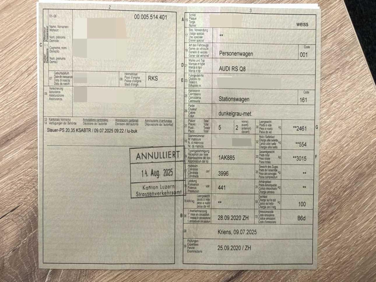 Assist: Geschwindigkeitsregelanlage inklusive Geschwindigkeitsbegrenzer, Licht: Matrix LED-Scheinwerfer mit dynamischer Lichtinszenierung und dynamischem Blinklicht, Sitze: Kindersitzbefestigung ISOFIX für den Beifahrersitz, Räder: Reifenreparatur-Set (Tire Fit), Sitze: Kindersitzbefestigung ISOFIX und Top Tether für die äusseren Fondsitze, RS-Dachkantenspoiler in Wagenfarbe, Assist: Audi pre sense basic, Ladekantenschutz in Edelstahl, Garantie: 2 Jahre ohne Kilometerbegrenzung (ab 1. Inv.), Reifendruckkontrollsystem, Assist: Audi pre sense front, Assist: Audi hold assist, Getriebe: 8-Stufen-Automat sequentiell, Lackierung: Uni-Lackierung, Dekor: Interieurelemente oben und unten in Leder – Instrumententafeloberseite, Türarmauflagen und Spange der Mittelkonsole in Leder Feinnappa schwarz oder cognacbraun mit Nähten; farblich angepasst an die Innenausstattung, RS-Stossfänger in Kontrastlackierung Manhattangrau, Licht: Scheinwerfer-Reinigungsanlage, Mild-Hybrid, Bordwerkzeug, Servolenkung Elektromechanisch, Sitze: Vordersitze heizbar, Sonnenblende Fahrer und Beifahrerseite mit beleuchtetem Spiegel, ausziehbar, Klima: Komfortklimaautomatik 4-Zonen, Audi drive select inkl. zwei RS Fahrmodi, Räder: Aluminium-Gussräder im 10-Speichen-Stern-Design – Grösse 10 J × 22 mit Reifen 295/40 R 22, RS-Stahlbremse vorn und hinten mit Bremssätteln in Schwarz – Hochleistungsbremse vorn und hinten mit diagonaler Aufteilung, Anti-Blockier-System (ABS) mit elektronischer Bremskraftverteilung (EBV), elektronische Stabilisierungskontrolle (ESC) mit Bremsassistent, Aluminium-Tandem-Bremskraftverstärker, Bremsscheiben innenbelüftet, gelocht und schwimmend gelagert; Bremssättel in Schwarz glänzend lackiert, mit RS-Schriftzug, ABS, Fahrwerk: Allradlenkung, Komfortschlüssel inklusive Diebstahlwarnanlage mit Abschleppschutz – Komfortschüssel mit sensorgesteuerter Gepäckraumentriegelung – Elektrische Laderaumabdeckung, Komfortmittelarmlehne vorn, Heckscheiben-Wisch-/Waschanlage, Media: Digitaler Radioempfang, Sitze: RS-Sportsitze vorn mit Alcantara/Leder-Kombination – mit el. Einstellung von Sitzhöhe, Sitzlängsposition, Sitz- und Lehnenneigung und Sitztiefeneinstellung – manuelle Einstellung von Kopfstützen- und Gurthöhe – mit elektrischer 4-Wege-Lendenwirbelstütze – Sitzmittelbahn der Vordersitze und Sitzmittelbahnen der äusseren Fondsitze in Alcantara schwarz – RS-Prägung auf den Vordersitzen und den beiden äusseren Fondsitzen – Sitzseitenwangen, mittlerer Fondsitzplatz, Kopfstützen und Mittelarmlehne vorn in Leder, Gepäckraumklappe elektrisch öffnend und schliessend, Fahrwerk: Adaptive air suspension sport, Media: MMI touch response, Media: Bluetooth-Schnittstelle, Innenspiegel automatisch abblendend, rahmenlos, RS-Sportabgasanlage 2-flutig – mit verchromten, ovalen Endrohrblenden, Ottopartikelfilter, 3-Punkt-Sicherheitsgurte auf allen Plätzen, Licht: Nebelschlussleuchte, Elektronisches Stabilitäts-Programm (ESP), RS-Einstiegsleisten mit Aluminiumeinlegern, beleuchtet, vorn mit RS Q8-Schriftzug, Frontscheibe in Wärmeschutzverglasung, Entfall Dachreling, Wegfahrsperre elektronisch, Assist: Geschwindigkeitsbegrenzungsanlage bis 250 km/h, Paket: Kontur / Ambiente Lichtpaket, mehrfarbig – Dachmodul vorn und hinten, inklusive Leseleuchten – Make-up-Spiegel für Fahrer und Beifahrer beleuchtet – Einstiegsleuchten auf den Unterseiten der Türen – Türinnengriffe beleuchtet – Handschuhfach beleuchtet – Fussraumbeleuchtung – Kofferraumbeleuchtung – Vorfeldbeleuchtung aus der Heckklappe – Ambiente-Stofffeldbeleuchtung der Türen – Vorfeldbeleuchtung aus den Türgriffen aussen vorn/hinten – Ambiente-Beleuchtung der Instrumententafel und Mittelkonsole vorn, Sitze: 4-Wege-Lendenwirbelstütze für die Vordersitze, Aussenspiegel elektrisch, beheiz- und anklappbar, mit Memory-Funktion, Media: Audi Soundsystem, Media: Audi connect Navigation & Infotainment – 3 Jahre – mit integrierter SIM-Karte, Verbandmaterial und Warndreieck, Heckscheibenheizung, Trennnetz, Sitze: Rücksitzbank plus – Lehne umlegbar im Verhältnis 40 : 20 : 40 oder vollständig umklappbar (ebener Ladeboden) – inkl. manueller Lehnenneigungseinstellung im Verhältnis 40 : 20 : 40 – Sitzfläche im Verhältnis 60 : 40 um 100 mm verschiebbar, Sitze: Vordersitze elektrisch einstellbar mit Memory-Funktion, Dachhimmel in Stoff schwarz, Media: MMI Navigationssystem Plus mit MMI touch, Media: Audi music interface, Dekor: Bedientasten Glasoptik schwarz mit haptischem Feedback inkl. erweiterter Aluminiumoptik, Dekor: Dekoreinlagen in Aluminium Race anthrazit, Fussmatten vorne und hinten, Audi connect Notruf & Service inklusive Fahrzeugsteuerung, Lenkrad: Lenkradeinstellung elektrisch, Diebstahlwarnanlage, Audi virtual cockpit, Zentralverriegelung, Airbag: Seitenairbags vorn und Kopfairbagsystem, Licht: Drittes Bremslicht, Nichtraucherausstattung – ohne Aschenbecher in der Mittelkonsole vorne – jeweils eine 12-Volt-Steckdose vorne und hinten, Lenkrad: RS-Sportkontur-Lederlenkrad im 3-Speichen-Design unten abgeflacht mit Multifunktion plus, Airbag: Airbag für Fahrer und Beifahrer mit Beifahrer-Airbag-Deaktivierung, Paket: Luftqualität-Paket