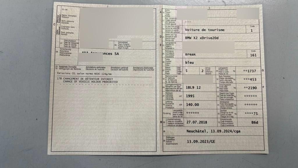 Lackierung: Uni-Lackierung, Schlüsselloser Motorstart, Airbag: Seitenairbag für Fahrer und Beifahrer, Antiblockiersystem (ABS), Wärmeschutzverglasung, Licht: LED-Tagfahrlicht, Assist: ATTENTION ASSIST (Aufmerksamkeits-assistent), Regensensor für Scheibenwischer vorne, Scheibenwaschdüsen beheizt, Einstiegsschienen, Licht: Heckleuchten in LED-Technik – einteilige LED-Heckleuchten mit Rauchglas Komponenten – Heckleuchte mit Schlusslicht, Bremslicht, Fahrtrichtungsanzeiger (LED-Technologie), Multikollisionsbremse, Ablagenpaket, Heckklappe automatisch, Räder: Reifendruck-Kontrollanzeige, Bremsbelag-Verschleissanzeige, Hill Descent Control (HDC), Sitze: Ausführung 5 Sitzplätze, Lenksäule in Höhe und Tiefe einstellbar, Assist: Tempomat mit Bremsfunktion, Lenkrad: Multifunktionslenkrad, Rücksitzlehne geteilt abklappbar, Park Distance Control hinten, Intelligenter Notruf, Sitze: Beifahrersitz höhenverstellbar, Schliessystem mit Zentralverriegelung, Remote Services, Warndreieck, Partikelfilter und Oxydationskatalysator, Leichtmetallräder im Y-Speichen-Design 722, 19J mit Notlaufeigenschaften, Sitze: Sportsitze vorne, Stoff-/Alcantara-Ausstattung, Fahrerlebnisschalter inkl. ECO PRO, DAB+ (Digital Audio Broadcasting), Airbag: Airbag Beifahrer deaktivierbar, Assist: Dynamische Traktionskontrolle (DTC), Bordcomputer, Pollenfilter (Staubfilter), 8-Stufen-Automat sequentiell, Parkbremse, elektromechanisch, Armlehne vorne mit Ablagefach, Reifenreparatur-Set (Tire Fit), M Aerodynamicpaket, Veloursfussmatten vorne und hinten, M-Lederlenkrad, 2-Zonen-Klimaautomatik, Performance Control, ConnectedDrive Services, TeleService, Allradantrieb permanent, LED Scheinwerfer mit erweiterten Umfängen, LED Nebelscheinwerfer, Media: Freisprecheinrichtung mit USB Schnittstelle, Window-Kopfairbags, Lichtpaket, M Sportlenkung, Steckdose 12V, 3x, M Sportfahrwerk, Shadow Line glänzend, Dynamische Stabilitätskontrolle (DSC), BMW Individual Dachhimmel Anthrazit, Auto Start-/Stop-Anlage, ISOFIX Kindersitzvorrichtung, Servotronic, Aussenspiegel rechts und links beheizbar und elektrisch verstellbar, Abschliessbare Radschrauben, Interieurleisten Aluminium Hexagon Anthrazit, M Sport X Exterieurpaket, Durchladesystem, Airbag: Airbag Fahrer und Beifahrer