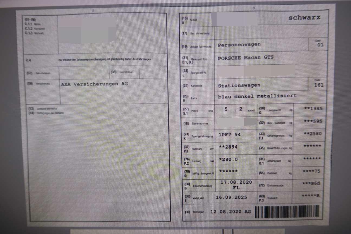 Airbag: Fullsize-Airbags für Fahrer und Beifahrer, Aktive Kühlerjalousie, Rundinstrumente 3 in Kombiinstrument integriert, Bugteil mit Gitter und Airblade in schwarz matt lackiert, Garantie: Garantieverlängerung Porsche 2+2 Jahre (im Wert von CHF 2’770.-), Fahrwerk: Porsche Active Suspension Management (PASM), Airbag: Curtain-Airbags als Abdeckung über den kompletten Dachrahmen – sowie die Seitenverglasung von A- bis C-Säule, Media: 2 USB-Lade- und -Connectivityanschlüsse im Ablagefach Mittelkonsole vorn, Lackierung: Uni-Lackierung, Dachspoiler schwarz (hochglanz), 2 schwarze Doppelendrohre links und rechts außen (Sportendrohre), Assist: Multikollisionsbremse, Getöntes Wärmeschutzglas rundum, Heckteil mit Diffusor in schwarz matt lackiert, Seitenscheibenleisten in Schwarz (hochglanz), Räder: 20-Zoll RS Spyder Design Räder in schwarz seidenglanz, Sitze: GTS-Sportsitz (vorn) mit 8 Wege-Einstellung Fahrer und Beifahrer – inkl. „GTS” Schriftzüge auf Kopfstützen vorn sowie äußeren Fondsitzen, Dekor: Akzentleisten silberfarben, Ottopartikelfilter (OPF), Bugteil mit deutlich vergrösserten Kühlluftöffnungen, SportDesign Schwellerverkleidungen, Ladekantenschutz aus Aluminium, PORSCHE Schriftzug und Modellbezeichnung auf Heckklappe in Schwarz matt, Assist: Porsche Traction Management (PTM) – aktiver Allradantrieb mit elektronisch geregelter, kennfeldgesteuerter Lamellenkupplung sowie automatischem Bremsdifferenzial (ABD) und Antriebsschlupfregelung (ASR), Licht: Fahrlichtassistent inkl. Heimleuchtautomatik, VarioCam Plus: kontinuierliche Nockenwellenverstellung (ein-und auslassseitig) und Schaltung des Ventilhubs (einlassseitig), Nichtraucher-Paket, Elektrisch verstell- und beheizbare Außenspiegel, elektrisch anklappbar (auch per Fernbedienung), auf Fahrerseite asphärisch, Mittelarmlehne hinten mit 2 integrierten Getränkehaltern, Assist: Elektrische Parkbremse, Heckmittelteil lackiert, Dachhimmel Stoff, SPORT Taste, Polster: Lederpaket GTS mit Race-Tex – Umfänge auf Sitzmittelbahnen, Armauflagen Türen und Mittelkonsole, ISOFIX-Befestigungssystem für Kindersitze auf Fondsitzen aussen, Assist: Roll-over-Sensierung zur Auslösung der Curtain-Airbags und Gurtstraffer bei drohendem Überschlag, Getriebe: 7-Gang-Doppelkupplungsgetriebe (PDK) – mit manueller Betätigung über Schaltpaddles am Lenkrad und Automatikmodus, – Gangempfehlung für verbrauchsoptimales Fahren im manuellen Schaltmodus., 3-Punkt-Automatikgurte, Paket: Interieur-Paket Aluminium gebürstet schwarz, Frontwischeranlage mit 2 Geschwindigkeiten und Intervallschaltung, inkl. Regensensor und Scheibenwaschdüsen, 65-l-Kraftstofftank, Gepäckraumvolumen ca. 488 Liter, mit Rücksitzen in Cargo-Stellung ca. 1.503 Liter maximales Ladevolumen, Sideblades schwarz matt lackiert mit „GTS” Schriftzug schwarz glänzend, Media: Sound Package Plus mit 10 Lautsprechern und 150 Watt Gesamtleistung mit integriertem Verstärker und digitalem Signalprocessing, SportDesign Paket mit SportDesign Schwellerkleidungen, Assist: Tempostat, Media: 2 USB-Ladeanschlüsse in der Fondmittelkonsole, Antiblockiersystem (ABS), 6-Kolben-Aluminium-Monobloc-Festsattelbremsen vorne, Automatische Heckklappe, Rundinstrumente mit schwarzem Drehzahlmesser und GTS Schriftzug, Sitze: 5 Sitze – im Fond Sitzbank mit 2 komfortablen Sitzen außen und einem mittigen Sitz, Diebstahlwarnanlage inkl. Ultraschallinnenraumüberwachung, Licht: Innenraumbeleuchtungskonzept: Handschuhfach, Zündschloss, Lesespots Fahrer-/Beifahrerseite, Leseleuchten hinten links und rechts, Gepäckraum, Media: Kombiinstrument mit hochauflösendem 4,8-Zoll-Farbdisplay, Ganganzeige für PDK, Service-Intervall-Anzeige, Außentemperaturanzeige, Tankanzeige und verschiedenen Warnanzeigen, Airbag: Seiten-Airbags vorn – im Sitz integriert, Airbag: Deaktivierungsfunktion Beifahrer-Airbag zur Montage von Kindersitzen, inkl. Anzeige in Dachkonsole, Media: Porsche Communication Management (PCM) inkl. Online-Navigation – Handyvorbereitung, Audio-Schnittstellen und Sprachbedienung, Kleiderhaken an B-Säule auf Fahrer- und Beifahrerseite, Media: Digitale Ladedruckanzeige im Farbdisplay des Kombiinstruments, Lenkrad: Multifunktions-Sportlenkrad mit Schaltpaddles, Lenkradkranz Glattleder, Biturbo-Aufladung, Sitze: Fondsitzanlage mit ausklappbarer Mittelarmlehne und getrennt klappbaren Lehnen (40:20:40), Ablagen im Innenraum (abhängig von Individualausstattung): – Handschuhfach, – Ablagebox in der Mittelkonsole, – offenes Ablagefach in der Mittelkonsole, – Türtaschen, ein Staufach im Laderaum seitlich, – Ablagefach in der Reserveradmulde, Räder: Radnabenabdeckung mit farbigem Porsche Wappen, Vorrüstung für Anhängezugvorrichtungen, Stossfängersystem aus hochfesten Querträgern und 2 Deformationselementen mit je einer Aufnahme mit Schraubgewinde für die im Bordwerkzeug befindliche Abschleppöse, Laderaumabdeckung fest, herausnehmbare, Assist: Bergabfahrhilfe (Porsche Hill Control, PHC), Klima:Taste AC-MAX und Feuchtesensor, Kühlfunktion des Handschuhfachs, Elektronisches Stabilitäts-Programm (ESP), Getränkehalter für Flaschen in den Türverkleidungen vorn und hinten – 2 integrierte Getränkehalter vorn mit variablem Durchmesser, Bremssättel rot, Klima: 3-Zonen Klimaautomatik – mit getrennter Temperatureinstellung für Fahrer, Beifahrer und Fondpassagiere sowie automatischer Umluftsteuerung inkl. Luftgütesensor und getrennter Luftmengenregelung für Fahrer- und Beifahrerseite, Kühlfunktion des Handschuhfachs, Vollverzinkte, selbsttragende Karosserie, Zentralverriegelung mit Fernbedienung, Elektrische Fensterheber vorn und hinten, mit Komfortschließfunktion, Einklemmschutz und Tipp-up-/Tipp-down-Funktion, OFFROAD-Taste, Bordcomputer, Licht: Dreidiemnsionale Rückleuchten in LED-Technologie mit integrierten 4-Punkt-Bremsleuchten und Leuchtenband, abgedunkelt, Armauflage Mittelkonsole hochklappbar, längsverschiebbar, Assist: Auto-Hold-Funktion, Media: