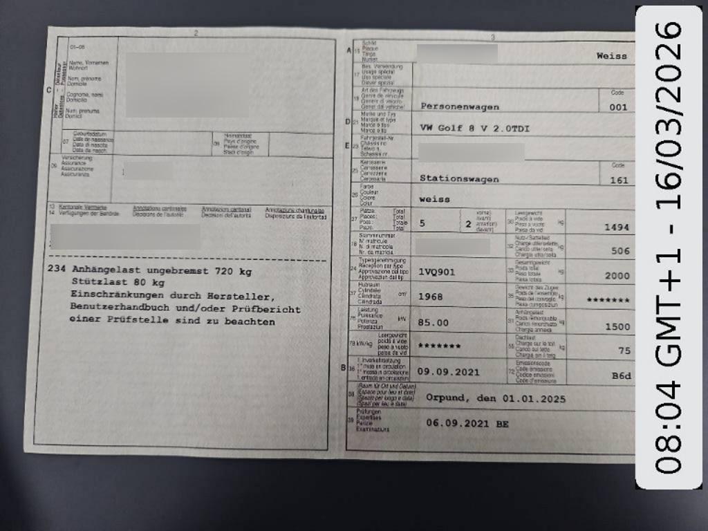 Getriebe: 6-Gang-Getriebe, Wärmeschutzverglasung grün, seitlich und hinten, Media: We Connect – Kostenlos und ohne Laufzeitbeschränkung – Mobiler Schlüssel – Fahrzeugstatus – Automatische Unfallmeldung – Fahrdaten – Parkposition – Service-Terminplanung, Sitze: Vordersitze mit manueller Höheneinstellung, 2 Leseleuchten vorn, Sicherheitsoptimierte Kopfstützen vorne, Mehrfarbige Ambientebeleuchtung (Auswahl zwischen 10 verschiedenen Farben), Media: We Connect Plus – Kostenlos und begrenzt auf eine Laufzeit von 3 Jahren Inhalt wie „We Connect”, jedoch zusätzlich mit: – Gebietsbenachrichtigung – Geschwindigkeitsbenachrichtigung – Hupen & Blinken – Verriegelung & Entriegelung – Abfahrtszeiten – Klimatisierung – Laden, Media: Wireless App-Connect, Durchlademöglichkeit in der Rücksitzbank, inkl. Mittelarmlehne hinten mit 2 Becherhalter, Assist: Multikollisionsbremse (automatisches Notbremsen nach einer Primärkollision, kann Folgekollisionen vermeiden, bremst das Fahrzeug bis zu einer festgelegten Minimalgeschwindigkeit), 12 Volt-Steckdose im Laderaum, Heckscheibenheizung, Media: USB-C Schnittstellen vorn und USB-C Ladebuchsen an der Mittelkonsole hinten, Aussenspiegelgehäuse und Türgriffe in Wagenfarbe, ISOFIX-Halteösen für Kindersitze (auf den äusseren Rücksitzen und auf dem Beifahreresitz, i-Size-Kompatibel), Heckscheibenwischer mit Intervallschaltung, Aussenspiegel mit Memoryfunktion elektrisch einstellbar, separat beheizbar, Airbag: Kopfairbagsystem für Front- und Fondpassagiere inkl. Seitenairbags vorn, Elektronisches Stabilisierungsprogramm und elektromechanischer Bremskraftverstärker, Media: Online-Dienst mit OCU, 3 Kopfstützen hinten, Mittelarmlehne vorn inkl. 2 USB-C Schnittstellen hinten – Mittelarmlehne vorn höhen- und längseinstellbar – 2 USB-C Ladebuchsen an der Mittelkonsole hinten, Partikelfilter und Oxydationskatalysator, Assist: Multifunktionskamera, Warndreieck, Licht: Drittes Bremslicht, Assist: Spurhalteassistent Lane Assist, Tür und Seitenverkleidung Schaumfolie und Gewebe, Räder: Reifenkontrollanzeige, Mittelkonsole, Assist: Müdigkeitserkennung (erkennt aufgrund charakteristischen Lenkverhaltens, Tageszeit und Fahrdauer Anzeichen einer eventuellen Müdigkeit des Fahrers und gibt eine optische und akustische Warnung aus), Licht: LED-Rückleuchten, Scheibenbremsen vorne und hinten, Media: Digital Cockpit Pro, 3-Punkt-Automatik-Sicherheitsgurte für mittleren Rücksitzplatz, Variabler Ladeboden, Türgriffmulden beleuchtet, Licht: Leuchtweitenregulierung dynamisch, Lenksäule mit Höhen- und Längseinstellung, Mittelarmlehne vorn höhe- und längseintellbar, Media: Guide & Inform” und „Security & Service Plus” inkl. Notruffunktion – Security & Service beinhaltet die Dienste „Notruf”, „Security & Service Basic” und „Security & Service Plus”. Die Laufzeit des Notrufs und von Security & Service Basic beträgt 10 Jahre. Die Laufzeit der Security & Service Plus Diensten beträgt 3 Jahre. – Notruf und Security & Service Basic: Automatischer und/oder manueller Notruf, Fahrzeugzustandsbericht, Service-Terminplanung, Pannenruf, Automatische Unfallmeldung. – Security & Service Plus: Parkposition, Fahrdaten, Fahrzeugstatus, Start-Stopp System mit Bremsenergie-Rückgewinnung, Doppelton-Signalhorn, Frontscheibe in Wärmeschutzglas, Licht: Umfeldbeleuchtung mit Logo-Projektion, Sitze: Lendenwirbelstützen vorn, Lenkrad: Multifunktions-Lederlenkrad inkl. Schalthebelknauf in Leder, Räder: 4×16-Zoll Leichtmetallräder „Norfolk” – 7 J x 16, Reifen 205/55 R16 – Radsicherungen mit erweitertem Diebstahlschutz, Assist: Notbremsassistent „Front Assist” mit Fussgänger- und Radfahrererkennung, Dekor: Dekoreinlagen „Nature Cross Brushed” – für Instrumententafel und Türverkleidungen vorne, Servolenkung elektromechanisch, geschwindigkeitsabhängig geregelt, Klima: Klimaanlage Air Care Climatronic inkl. Allergenfilter, Räder: Tire Mobility Set: 12-Volt-Kompressor und Reifendichtmittel, Wegfahrsperre elektronisch, Fussgängerschutzmassnahmen erweitert, Textilfussmatten vorn und hinten, Licht: Autobahnlicht, Abbiegebremsfunktion und Ausweichunterstützung, Make-Up Spiegel beleuchtet in den Sonnenblenden, Airbag: Airbag für Fahrer und Beifahrer mit Beifahrerairbag-Deaktivierung, Licht: LED Scheinwerfer, 3-Punkt-Automatik-Sicherheitsgurte vorne mit Höheneinstellung und Gurtstraffer, Media: Radio „Ready 2 Discover” inkl. „Streaming & Internet” – 10 Zoll Display mit Touch-Bedienung – In-Car Shop – „Streaming & Internet” für Webradio, Media-Streaming und WLAN-Hotspot, Lackierung: Uni-Lackierung, Media: Digitaler Radioempfang DAB+, Sitze: Rücksitzbank ungeteilt, Lehne asymmetrisch geteilt umklappbar, mit Mittelarmlehne, Warnton und -leuchte für nicht angelegte Gurte vorne und hinten, Media: 6+1 Lautsprecher, Bordwerkzeug und Wagenheber, Licht: Nebelschlusslicht einseitig, Rückfahrlicht beidseitig, Heckspoiler in Wagenfarbe, Sitze: Komfortsitze vorn, Sitzmittelbahnen der Vordersitze und äussere Rücksitze in Stoff Maze, Elektronische Parkbremse inkl. Auto-Hold-Funktion (verhindert, dass das Fahrzeug im Stillstand oder beim Anfahren ungewollt wegrollt), Nichtraucherausführung – Ablagefach und 12-V-Steckdose vorn, 3-Punkt-Automatik-Sicherheitsgurte für die äusseren Rücksitzplätze (mit ECE-Label), Media: Telefonschnittstelle Bluetooth mit induktiver Ladefunktion, Schlüsselloses Startsystem „Keyless Start” ohne Safe-Lock, ABS inkl. EBV, MSR und ASR, Assist: Automatische Distanzregelung ACC (bis 210 km/h) „stop & go” inkl. Geschwindigkeitsbegrenzer, Elektronische Differentialsperre (XDS+), Assist: ParkPilot vorne und hinten – Akkustische Warnsignale bei Hindernissen im Front- und Heckbereich, Beifahrerspiegelabsenkung, Media: We Connect Basisfunktionen – Kostenlos und ohne Laufzeitbeschränkung – Notrufsystem eCall – Notruf-Service – Pannenruf, Zentralverriegelu