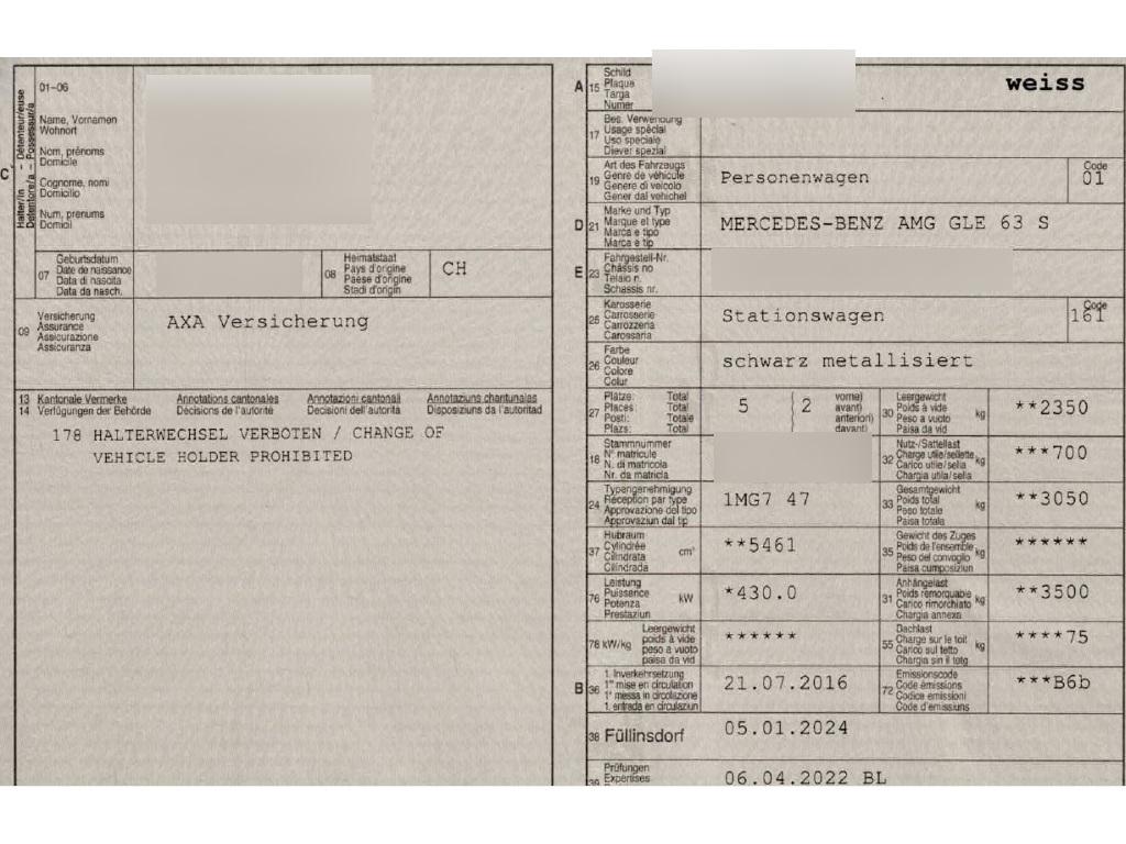 Kommunikationsmodul, Sitze:ISOFIX-Befestigungspunkte für Kindersitz an den äusseren Rücksitzen, Kühlergrill schwarz glänzend, Assist:Reifendruck-Kontrollanzeige, Mittelkonsole mit Ablagefach, 12-Volt-Steckdose hinten, Beide Make up-Spiegel beleuchtet, Klima: Klimatisierungsautomatik THERMATIC mit 2-Klimazonen, LED Intelligent Light System, Kraftstofftank 93 Liter, Dekor: Dachhimmel schwarz, AMG Front- und Heckschürze, Getriebe: Sequentielles 7-Gang-Getriebe mit Automatikfunktion, Airbag: Window-Kopfairbags, Gurtstraffer mit Gurtkraftbegrenzer, Fahrwerk:Adaptives Dämpfungs-System (ADS), Lichtwarnsummer, Antiblockiersystem (ABS), Assist: Notrufsystem, Audio 20 Radio CD/MP3 mit Bluetooth- Freisprecheinrichtung, Aussentemperaturanzeige, Sitze:Vordersitze elektrisch verstellbar, AMG Leichtmetallräder Kreuzspeichen- Design 22J titangrau und glanzgedreht, Zentralverriegelung mit Fernbedienung und automatischer Türverriegelung, Sitze:Mittelarmlehne hinten mit Fach und Cupholder, Elektrische Fensterheber vorne + hinten, Bremsassistent (BAS), Fahrwerk:Direktlenkung mit geschwindigkeits- abhängiger Lenkkraftunterstützung, Sitze:Mittelarmlehne vorne mit Ablagefach, Airbag: Knie-Airbag für Fahrer, Regensensor für Scheibenwischer vorne, Ablagen in den Türen, Aktivkohlefilter (Geruchsfilter), Paket: AMG Styling-Paket, Allradantrieb permanent, Sitze:AMG Sportsitze, Scheibenwaschanlage und Scheibenwasch- düsen beheizt, Heckscheibenheizung, Verbandstasche, Reiserechner, Fahrwerk:AMG Sportfahrwerk, Analog-Uhr, Drehzahlmesser, AMG Einstiegleisten, Sitze:Kopfstützen hinten höhenverstellbar, Sportpedalanlage, Sitze: 3-Punkt-Sicherheitsgurte auf allen Plätzen, DYNAMIC SELECT Schalter, ECO Start-Stopp-Funktion, Controller auf Mittelkonsole, Airbag: Seiten- und Beckenairbag (Pelvisbag) für Fahrer und Beifahrer, Wartungsintervall-Anzeige, Fahrwerk:AMG Hochleistungs-Bremsanlage, Antriebsschlupfregelung (ASR), Sitze:Vordersitze heizbar, Multifunktionsanzeige, Licht: LED Heckleuchten, Laderaumabdeckung, Licht:Adaptives Bremslicht, Adaptiver Fernlicht-Assistent, Licht: Drittes Bremslicht, Elektronisches Stabilitäts-Programm (ESP), Elektrische Fensterheber vorne und hinten mit Komfortbetätigung und Einklemmschutz, Lenkrad:AMG Performance Lenkrad in Leder Nappa/ Microfaser DINAMICA, 12 Volt-Steckdose im Laderaum, Luftfederung rundum mit Niveauregelung, AMG Veloursfussmatten, ACTIVE CURVE SYSTEM mit aktiver Wank- stabilisierung, Assist:ADAPTIVE BRAKE mit HOLD-Funktion und Berganfahrhilfe, Assist: Transparente Motorhaube, Licht: LED-Tagfahrlicht, Sitze: Rücksitzlehne geteilt abklappbar, Scheibenwischer vorne mit Intervall, Licht: Nebelschlussleuchte, Wegfahrsperre elektronisch, Brillenfach, Assist:Tempomat mit variabler Geschwindigkeits- begrenzung Limiter, Bottleholder, Kindersicherung an den hinteren Türen, Welcome-Beleuchtung, Lackierung: Uni-Lackierung, Katalysator geregelt, Kartentaschen an den Rückenlehnen, Radiovorbereitung, Antenne, Entstörung und 8 LS, Volllederausstattung Nappa Exclusiv, Assist: ATTENTION ASSIST (Aufmerksamkeitsassistent), Handschuhfach beleuchtet, klimatisiert und abschliessbar, Airbag: Airbag Fahrer und Beifahrer, Lenkrad längs- und höhenverstellbar, Fahrwerk:AGILITY CONTROL-Fahrwerk mit selektivem Dämpfungssystem, Steckdose 12-Volt- vorne