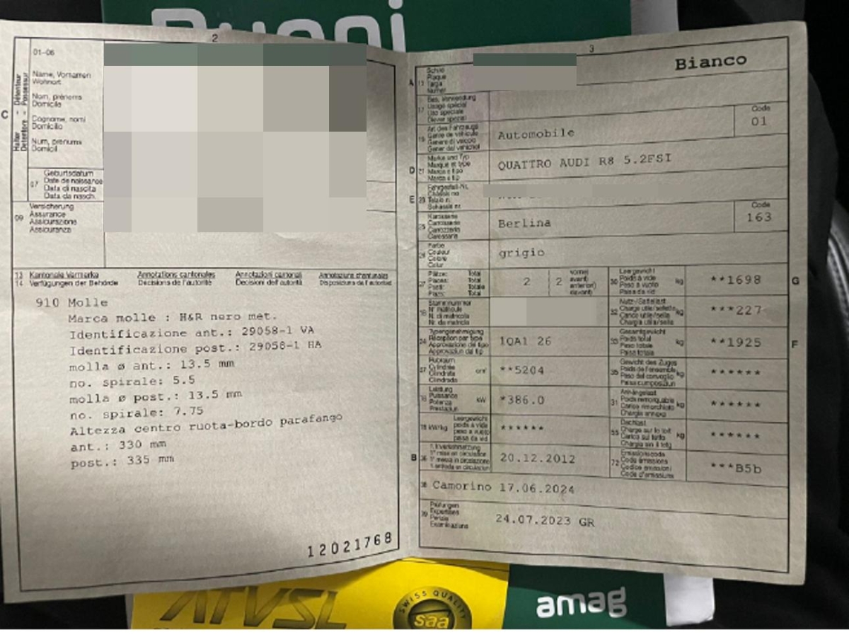 Diebstahlwarnanlage Innenraumüberwachung und Abschleppschutz und Akkuhorn, Licht: LED-Tagfahrlicht, Steckdose im Kofferraum, Abschliessbare Radschrauben, Leuchtweitenregulierung elektrisch, Kraftstofftank 90 Liter, Klima: Klimatisierungsautomatik, Stossstangen, Aussenspiegel und Türgriff in Wagenfarbe, Bang & Olufsen Soundsystem, 6-Gang-Getriebe R-tronic mit Automatikfunktion, Voltmeter, Vordersitze elektrisch verstellbar, Audi magnetic ride, Räder: Reifendruck-Kontrollanzeige, Kopfstützen vorne höhenverstellbar, Garantie: 2 Jahre ohne Kilometerbegrenzung (ab 1. Inv.), Lenkrad: Lenkrad längs- und höhenverstellbar, Dekoreinlagen in Seidenmatt schwarz, Alu-Räder im 10-Speichen Y-Design, 19J, Seitenairbags und Kopfairbags vorne, Zentralverriegelung mit Fernbedienung, Ablagenpaket, Drehzahlmesser, Assist: Park Distance Control vorne und hinten, Aussenspiegel rechts und links beheizbar und elektrisch anklappbar, automatisch abblendend, Elektronisches Stabilitäts-Programm (ESP), Lackierung: Uni-Lackierung, Airbag: Airbag Beifahrer deaktivierbar, Seitenaufprall-Schutzsystem, Scheinwerfer-Waschanlage, Cupholder, Gurtstraffer vorne, Funkuhr, Elektrische Fensterheber vorne, Einstiegsschienen, Wärmeschutzverglasung, Wartungsintervall-Anzeige, Tempomat, Make up-Spiegel links, Multifunktions-Sportlederlenkrad mit Schaltwippen, Veloursfussmatten vorne, Regensensor für Scheibenwischer vorne, Aussentemperaturanzeige, Gurtkontrolle, Oeltemperaturanzeige, Licht: LED Heckleuchten, Antriebsschlupfregelung (ASR), Steckdose, Audi hold assist, Aschenbecher und Zigarettenanzünder, Elektronische Differentialsperre (EDS), Lichtsensor, Sitze: Sportsitze vorne, Allradantrieb permanent, Kreuzstützen für Vordersitze elektrisch verstellbar, Wassertemperaturanzeige, Klima: Pollenfilter (Staubfilter), Licht: LED Scheinwerfer, Servolenkung geschwindigkeitsabhängig, Lederausstattung Feinnappa, Airbag: Airbag Fahrer und Beifahrer, Bordcomputer, Antiblockiersystem (ABS), Heckspoiler, geschwindigkeitsabhängig elektrisch ausfahrbar, Katalysator geregelt, Navigationssystem plus mit MMI, ISOFIX Kindersitzvorrichtung, Scheibenwischer vorne mit Intervall, Make up-Spiegel rechts, Drittes Bremslicht LED, Innenspiegel automatisch abblendbar, Beleuchtetes und abschliessbares Handschuhfach, Auspuffanlage mit 2 Endrohren (links und rechts), Licht: Nebelschlussleuchte, Reifenreparatur-Set mit Kompressor, Radio/CD-Player mit MP3, Tageskilometerzähler, Heckscheibenheizung, Pedale und Fuss-Stütze in Aluminium, Servotronic, Schalthebel aus Aluminium, Assist: Bremsassistent (BAS), Dachhimmel in Alcantara, Wegfahrsperre elektronisch, Sitze: Vordersitze heizbar