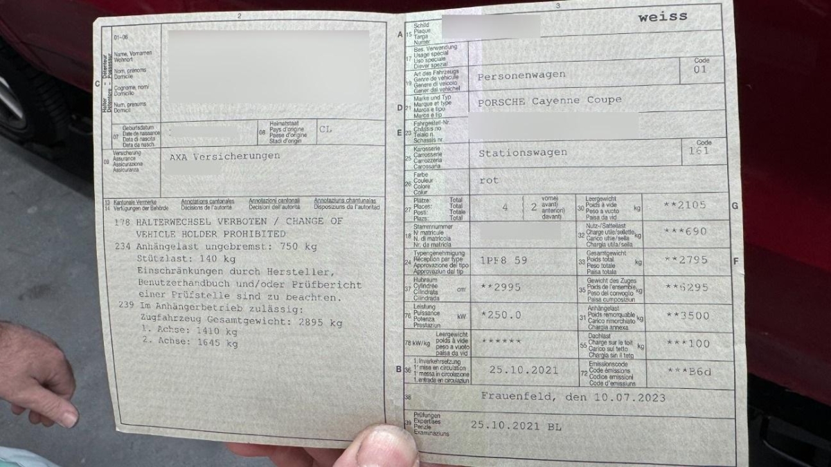 3-Punkt-Automatikgurte mit Gurtstraffer (vorn und Fondsitze außen) und Gurtkraftbegrenzer (vorn), 3-Punkt-Automatikgurt auf mittigem Fondsitzplatz, Media: 2 USB-Ladeanschlüsse in der Mittelkonsole hinten, Porsche Active Aerodynamics (PAA) Heckklappe mit integriertem, adaptiv ausfahrendem Dachspoiler, Schlüsselloser Fahrzeugstart, Vollverzinkte Hybrid-Leichtbaukarosserie in Stahl-Aluminium-Mischbauweise, Türeinstiegsblenden aus Edelstahl mit Modellbezeichnung vorn Cayenne Coupé: „Cayenne”, Elektronische Parkbremse, Assist: Parkassistent vorne und hinten – inkl. Rückfahrkamera, ISOFIX-Befestigungssystem für Kindersitze auf Fondsitzen aussen, Assist: Roll-over-Sensierung zur Auslösung der Curtain-Airbags und Gurtstraffer bei drohendem Überschlag, Airbag: Knie-Airbag für Fahrer und Beifahrer, Außenspiegel elektrisch verstell- und beheizbare, elektrisch anklappbar (auch per Fernbedienung), auf Fahrerseite asphärisch, einschließlich Umfeldbeleuchtung, Media: Hi-Fi-Lautsprechersystem mit 10 Lautsprechern und 150 Watt Systemleistung, Media: Porsche Communication Management (PCM) – Handyvorbereitung, Audio-Schnittstellen und Sprachbedienung, Feste Gepäckraumabdeckung, Getöntes Wärmeschutzglas rundum, Heckklappe mit integriertem Dachspoiler in Exterieurfarbe, Sitze: Sport-Fondsitzanlage mit 2 komfortablen Sitzen, 2-Wege Kopfstützen, manueller Lehnenneigungsverstellung, getrennt klappbaren Rückenlehnen (40/20/40), mittigem Ablagefach und ausklappbarer Mittelarmlehne mit 2 Cupholdern, Licht: Bugleuchten mit Positionslicht und Blinkleuchten in LED-Lichtleitertechnik, Wasserkühlung mit Thermomanagement, Assist: Auto-Hold-Funktion, Bremsbelag-Verschleissanzeige, Räder: 20-Zoll Cayenne Design Räder, Motorhaube mit Powerdome, Fahrwerk: Stahlfederfahrwerk inkl. Porsche Active Suspension Management (PASM), LED-Innenraumbeleuchtungskonzept Abschaltverzögerung, Fußraumleuchten vorn und hinten, Ascherbeleuchtung, Handschuhfachleuchte, Zündschlossbeleuchtung, Innenleuchte vorn mit Lesespots, Leseleuchten hinten links und rechts, Elektrische Fensterheber vorne, 4-Kolben-Aluminium-Monobloc-Festsattelbremsen vorn, Aluminium Motorblock, Beleuchteter Make-up-Spiegel in den Sonnenblenden (Fahrer- und Beifahrerseite), Wegfahrsperre elektronisch, Vorrüstung für Anhängezugvorrichtungen, Assist: Fahrstabilisierungssystem Porsche Stability Management (PSM) mit ABS, MSR und Gespannstabilisierung und erweitertem PSM SPORT Modus, Paket: Interieur Paket schwarz Hochglanz, Aktive Fronthaube, Bugteil mit integrierten Kühlluftöffnungen, Media: 2 USB-Lade- und -Connectivityanschlüsse im Ablagefach Mittelkonsole vorn, Getränkehalter für Flaschen in den Türverkleidungen vorn und hinten, Ansteigende Mittelkonsole mit Haltegriffen, Räder: Reifendruckkontrollsystem, Fahrwerk: Integrierter Fahrwerkregler Porsche 4DChassis, Vorrüstung für Dachtransportsystem, Airbag: Deaktivierungsfunktion Beifahrer-Airbag zur Montage von Kindersitzen, inkl. Anzeige in Dachkonsole, Zentraler analoger Drehzahlmesser mit schwarzem Ziffernblatt, Sitze: Sportsitze vorn (8-Wege, elektrisch) mit integrierten Kopfstützen, Fahrerpersonalisierung für Klima, Audio und Kommunikation, Assistenzsysteme und weitere individualisierbare Fahrzeugsysteme, Stossfängersystem aus hochfesten Querträgern und 2 Deformationselementen – mit je 2 Aufnahmen mit Schraubgewinde für die im Bordwerkzeug befindliche Abschleppöse, Licht: Fahrlichtassistent inkl. Heimleuchtautomatik, Airbag: Fullsize-Airbags für Fahrer und Beifahrer, Licht: LED-Rückleuchten mit dreidimensionaler Leuchtengrafik, integrierten 4-Punkt-Bremsleuchten und Leuchtenband, Airblades mit seitlichen Lufteinlässen, Diebstahlwarnanlage inkl. Ultraschallinnenraumüberwachung und zweistufiger Verriegelung (SAFE-Sicherung), Licht: Drittes Bremslicht LED, Assist: Bergabfahrassistent, Fahrzeugstart ohne aktive Schlüsselnutzung, Räder: Reifenreparatur-Set mit Kompressor, Seitenscheibenleisten in Schwarz (hochglanz), Heckscheibenheizung mit „Auto-Off”-Funktion, Sitze: 4 Sitze, Airbag: Curtain-Airbags als Abdeckung über den kompletten Dachrahmen – sowie die Seitenverglasung von A- bis C-Säule, Großflächige aerodynamische Unterbodenverkleidung, Dachhimmel sowie Verkleidung A-/B-/ C-Säulen in Stoff, Türeinstiegsblenden aus Edelstahl mit „Cayenne” Schriftzug hinten, Klima: Klimaautomatik mit getrennter Temperatureinstellung für Fahrer und Beifahrer sowie automatischer Umluftsteuerung inklusive Luftgütesensor und getrennter Luftmengenregelung für Fahrer- und Beifahrerseite, AC-MAX-Taste und Feuchtesensor, Media: Connect Plus-Modul inkl. Online-Navigation, Apple CarPlay, LTE-Telefonmodul mit SIM-Karten-Leser, drahtlosem Internetzugang sowie zahlreichen Porsche Connect Diensten, Lackierung: Uni-Lackierung, Frontwischeranlage mit 2 Geschwindigkeiten, Intervallschaltung und Regensensor, 2-Kolben-Aluminium-Monobloc-Festsattelbremsen hinten, Gurtwarner für Fahrer-, Beifahrersitz und Rücksitzanlage, Garantie: Porsche Garantie 2 Jahre ohne Kilometerbegrenzung (ab 1. Inv.), Einleger in den Lamellen der Lufteinlässe in Schwarz (hochglanz), Fahrwerk: Aluminium-Mehrlenker-Hinterachse, Assist: Multikollisionsbremse, Lenkrad: Multifunktions-Sportlenkrad mit Schaltpaddles, Räder: Mischbereifung, Aluminium Zylinderkopf, Air Curtains in den Radhäusern, Ladeluftkühlung, Assist: Porsche Traction Management (PTM) – aktiver Allradantrieb mit elektronisch geregelter, kennfeldgesteuerter Lamellenkupplung sowie automatischem Bremsdifferenzial (ABD) und Antriebsschlupfregelung (ASR), 75-l-Kraftstofftank, Turbolader Twin-Scroll, Individual Modus zur individuellen Auswahl diverser sportlicher Fahrzeugeinstellungen, Bremssättel schwarz, Modellbezeichnung auf Heckklappe in Silber (hochglanz), Paket: Sport Chrono Paket inkl. Mode-Schalter, Feinstaubfilter mit Aktivkohle, 12 Volt-Steckdose (3x): vorn unterhalb des Handschuhfachs, in der Mittelkonsole vorn, im Gepäckraum, POR