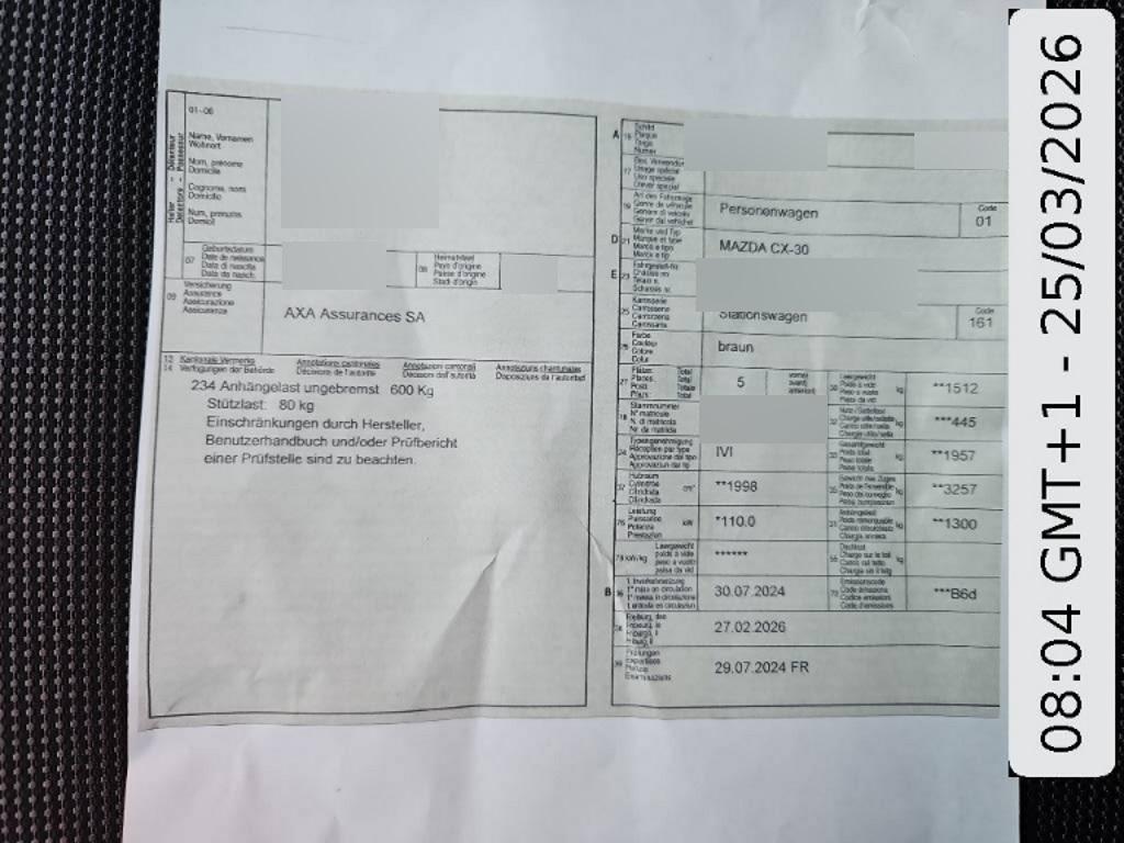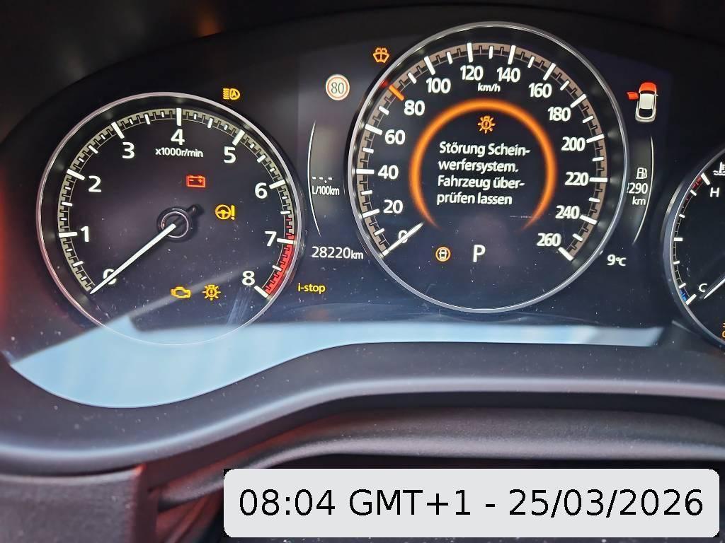 Assist: Elektronische Parkbremse mit Auto-Hold-Funktion und Berganfahrhilfe, Garantie: Mazda-Garantie 6 Jahre/150 000 km, Kosmetikspiegel auf Fahrer und Beifahrerseite beleuchtet, Media: Head-up-Display mit Projektion auf die Windschutzscheibe, Kofferraumorganisator Smart Cargo System (SCS), Scheibenwischer mit Regensensor, Media: Audiosystem mit DAB+-Radio, 2x USB- C- und 12-V-Anschluss, Aussenspiegel in Wagenfarbe, Sitze: Fahrersitzkissen in der Neigung verstellbar, ABS, LED-Innenbeleuchtung, Servolenkung, eCall, Klima: Klimaanlage, Media: Wireless-Ladestation (für Smartphones mit Qi-Standard), Lackierung: Uni-Lackierung, Assist: Verkehrszeichenerkennung (TSR, Traffic Sign Recognition), Licht: LED-Rückleuchten, Airbag: Airbag Fahrer und Beifahrer, Dachheckspoiler in Brilliant Black, Scheibenwischer mit integrierter Waschdüse, Räder: Reifenreparatur-Set (Tire Fit), Assist: City-Notbremsassistent SCBS mit Fussgänger- und Fahrraderkennung, Airbag: Seitenairbag für Fahrer und Beifahrer, Licht: Scheinwerfer mit Coming-/Leaving-Home-Funktion, Assist: Spurwechselassistent (BSM, Blind Spot Monitoring) mit Totwinkelwarner, Räder: Reifendruckkontrollsystem, Media: Bluetooth für Smartphones und Audiogeräte, Motor-Startknopf, Mittelarmlehne vorne mit Ablagefach, Mazda M Hybrid Boost, Mild-Hybridsystem (M-HEV) mit Bremsenergie-Rückgewinnung, Sitze: Rücksitzlehnen getrennt abklappbar 60:40, Assist: Einparkhilfe mit Parksensoren hinten, Assist: Pre-Crash Safety mit aktivem Bremseingriff SBS (Smart Brake Support), Airbag: Vorhang vorn-hinten, Sitze: Beifahrersitz höhenverstellbar, Licht: Lichtautomatik, Aussenspiegel beheizbar, Zentralverriegelung mit Fernbedienung, Media: Apple CarPlay wireless und Android Auto wireless, Keyless Entry mit Smart Key, Assist: Dynamische Stabilitätskontrolle und Traktionskontrolle, Media: MZD Connect mit 10,25′-TFT-Farbdisplay und Multi Commander HMI auf der Mittelkonsole, Assist: Spurhalteassistent LAS (Lane-keep Assist System) mit aktiver Lenkunterstützung, Media: Instrumentenanzeige mit 7′-TFT-Multidisplay, Sitze: Vordersitze heizbar, Getriebe: 6-Gang-Automat, Media: Mazda Connected Services, Polster: Stoffsitze in Dark Grey, Fahrwerk: G-Vectoring Control Plus, die Fahrdynamikregelung von Mazda, Elektrische Fensterheber vorn und hinten mit Automatikfunktion, Klima: 2-Zonen-Klimaautomatik mit Ventilation hinten, Media: MyMazda App, Assist: Intelligente Geschwindigkeitsautomatik und Geschwindigkeitsbegrenzer, Bordcomputer, Ablagetasche (Rückseite Beifahrersitz), Isofix-Kindersitzverankerungen (2x), Licht: Voll-LED-Scheinwerfer mit Fernlichtautomatik HBC (High-Beam Control), Assist: Aufmerksamkeitswarner DAA (Driver Attention Alert), Airbag: Fahrer-Knie-Airbag, Lenkrad: Lenkrad längs- und höhenverstellbar, Sitze: Fahrersitz höhenverstellbar, Alarmanlage, Innen- und Aussenspiegel (Fahrerseite) mit automatischer Abblendung, Lenkrad: Multifunktionslenkrad, Räder: Leichtmetallfelgen 18″ Farbe Silver 215/55 R18, Assist: Einparkhilfe mit Parksensoren vorne, i-stop, das intelligente Stopp-Start-System von Mazda, Assist: Rückfahr-Querverkehrswarner (RCTA, Rear Cross Traffic Alert), Media: Navigationssystem, Assist: Rückfahrkamera, Aussenspiegel automatisch einklappbar, Assist: Adaptive Geschwindigkeitsautomatik (MRCC, Mazda Radar Cruise Control) mit Stop & Go-Funktion, Lederlenkrad und -schaltknauf, Media: 8 Lautsprecher